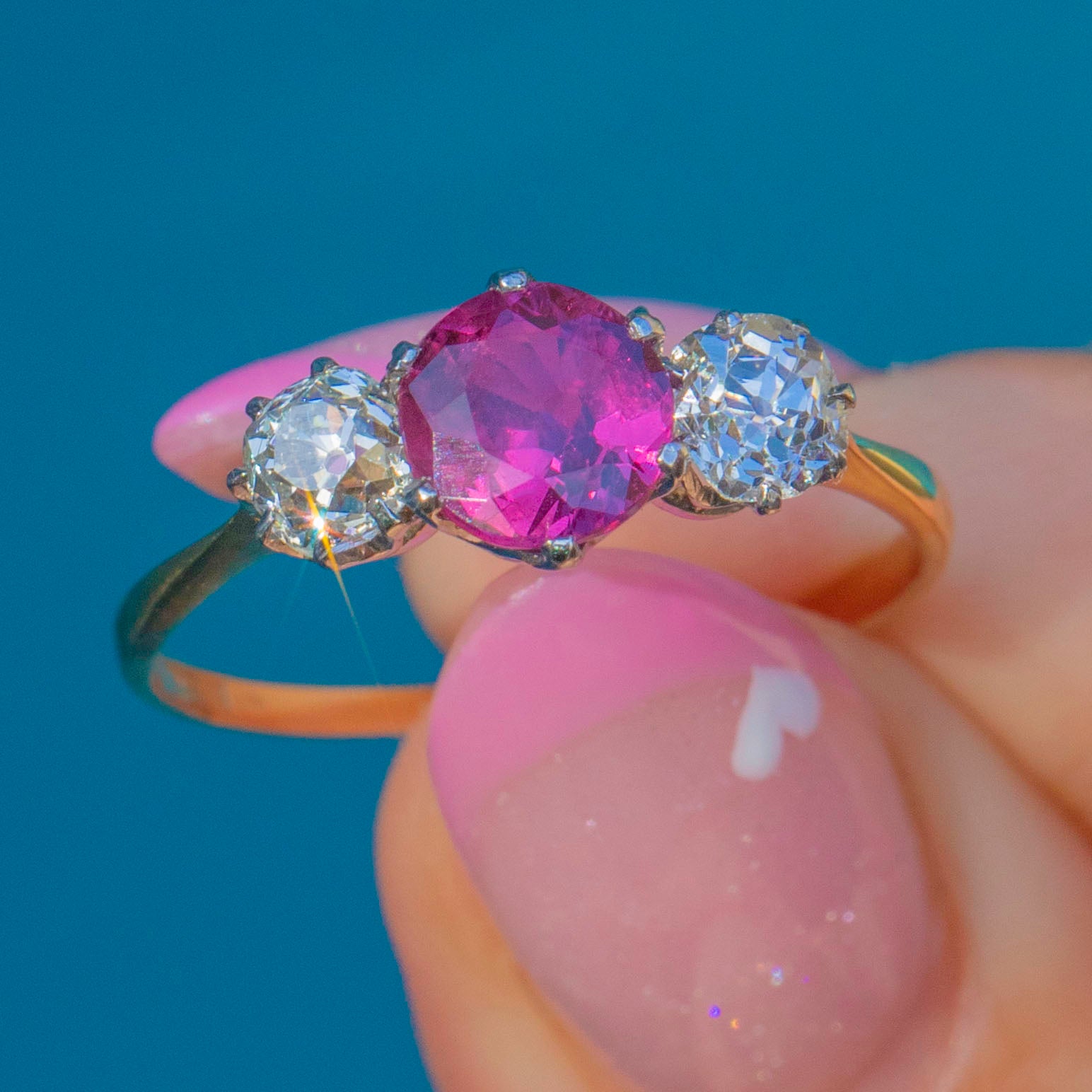 VERY GOOD-EXCELLENT: The Ruby is lively and full of colour, a gorgeous colour, and in perfect condition with no scratches, chips or damage of any kind, despite being over 100 years old! The antique old-mine cut Diamonds are bright and well-matched, with lots of fire and brilliance within, with only minor wear consistent with age. The band is lightly worn at the back but remains stable and robust. Light age-related wear overall and the stones are secure in their settings.