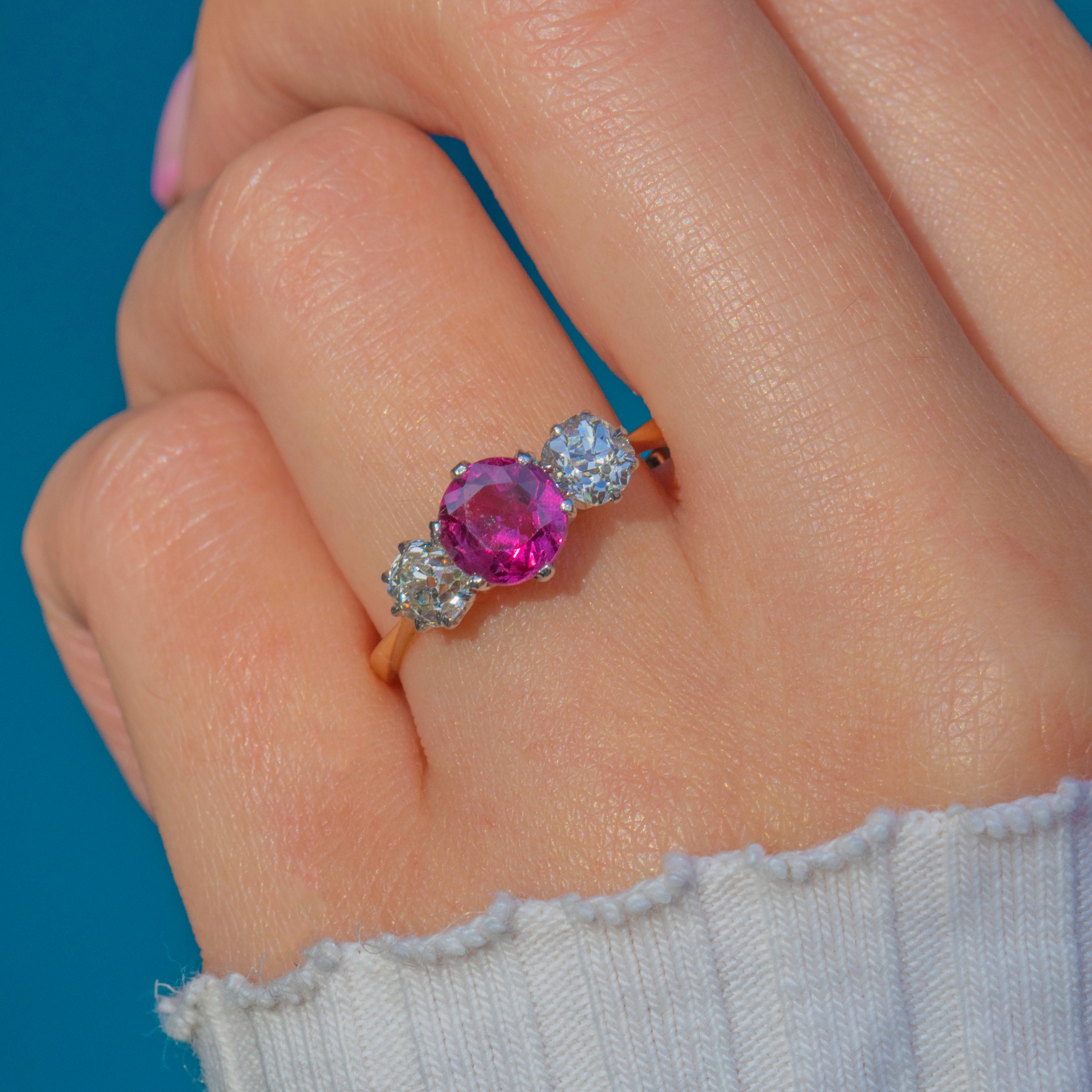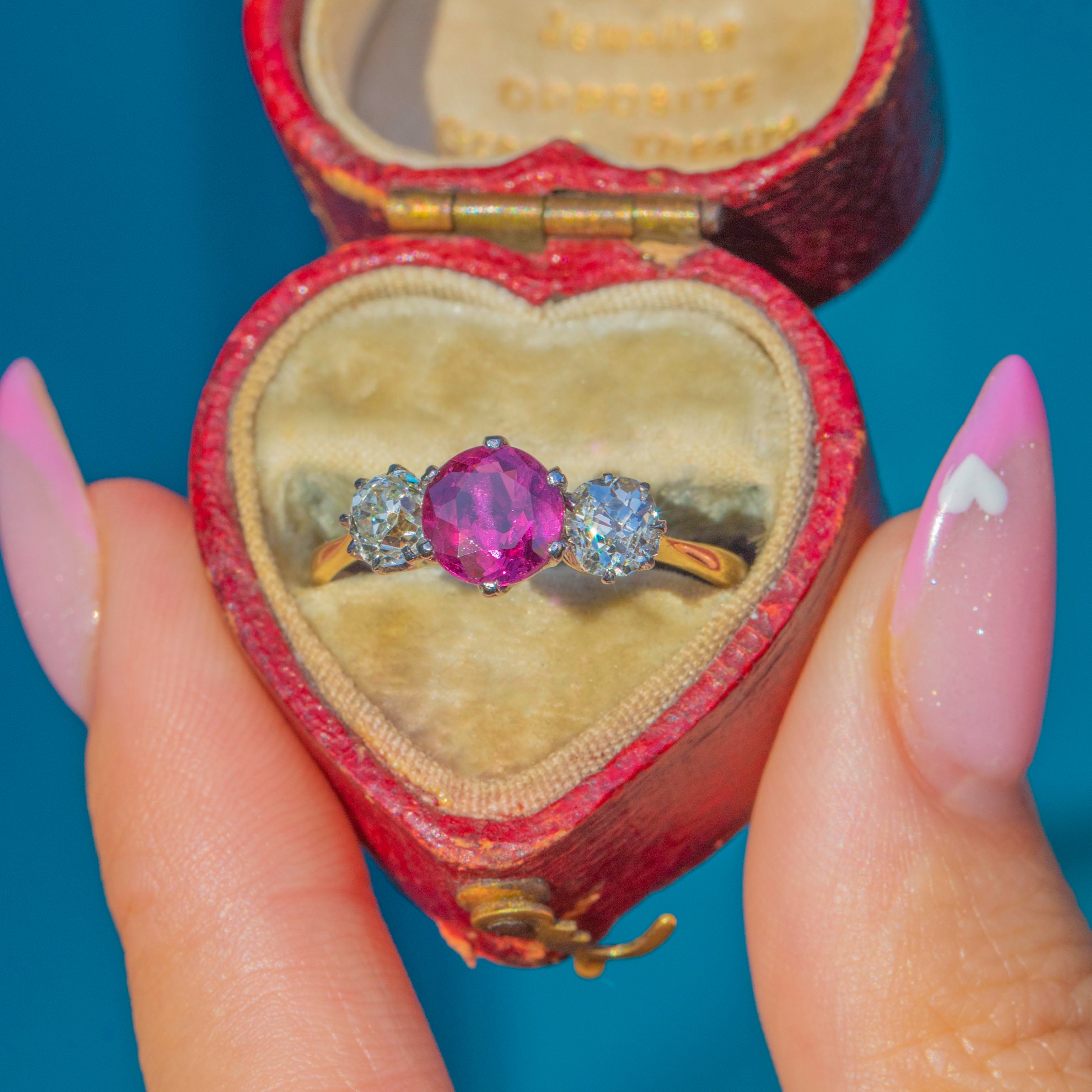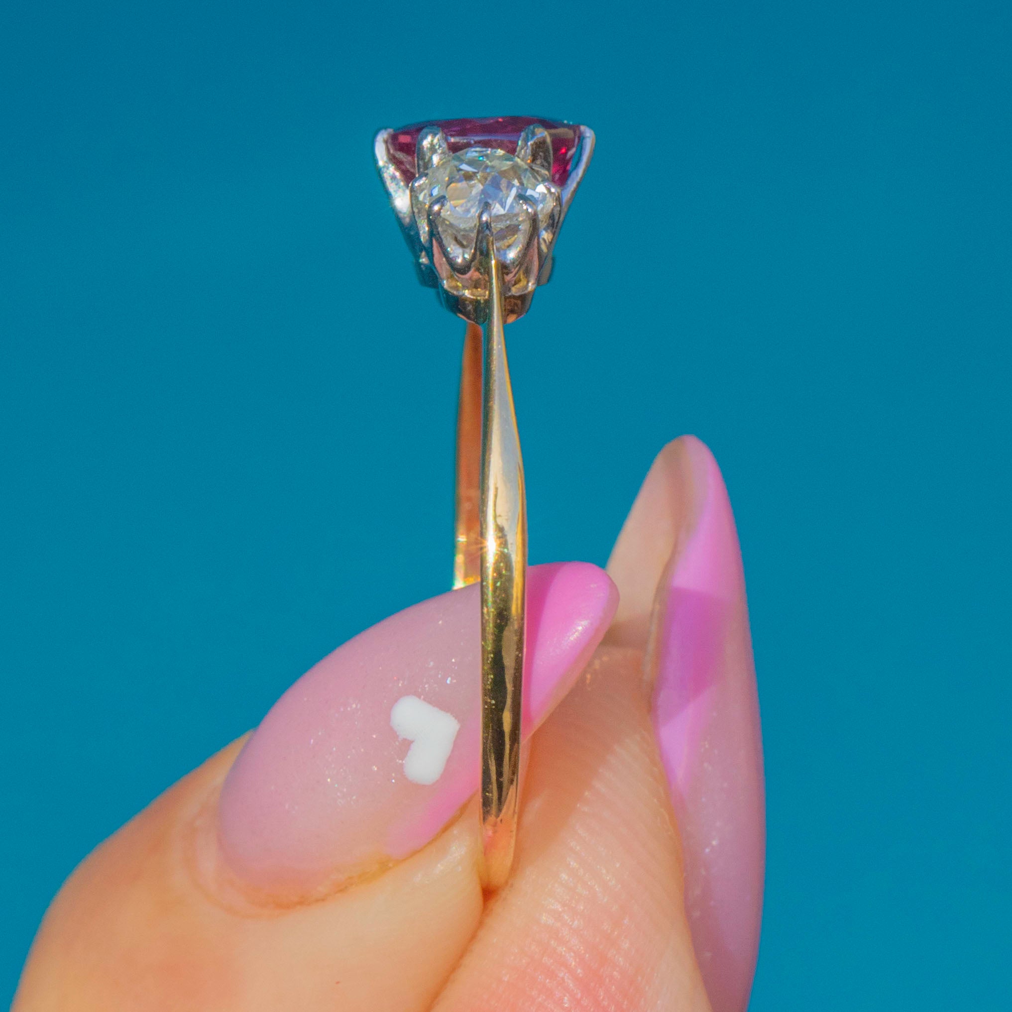 It features a vivid round brilliant-cut natural Ruby, flanked by 0.50ct of sparkling antique old-cut Diamonds- each perfectly balanced in proportion and colour contrast for a striking look!