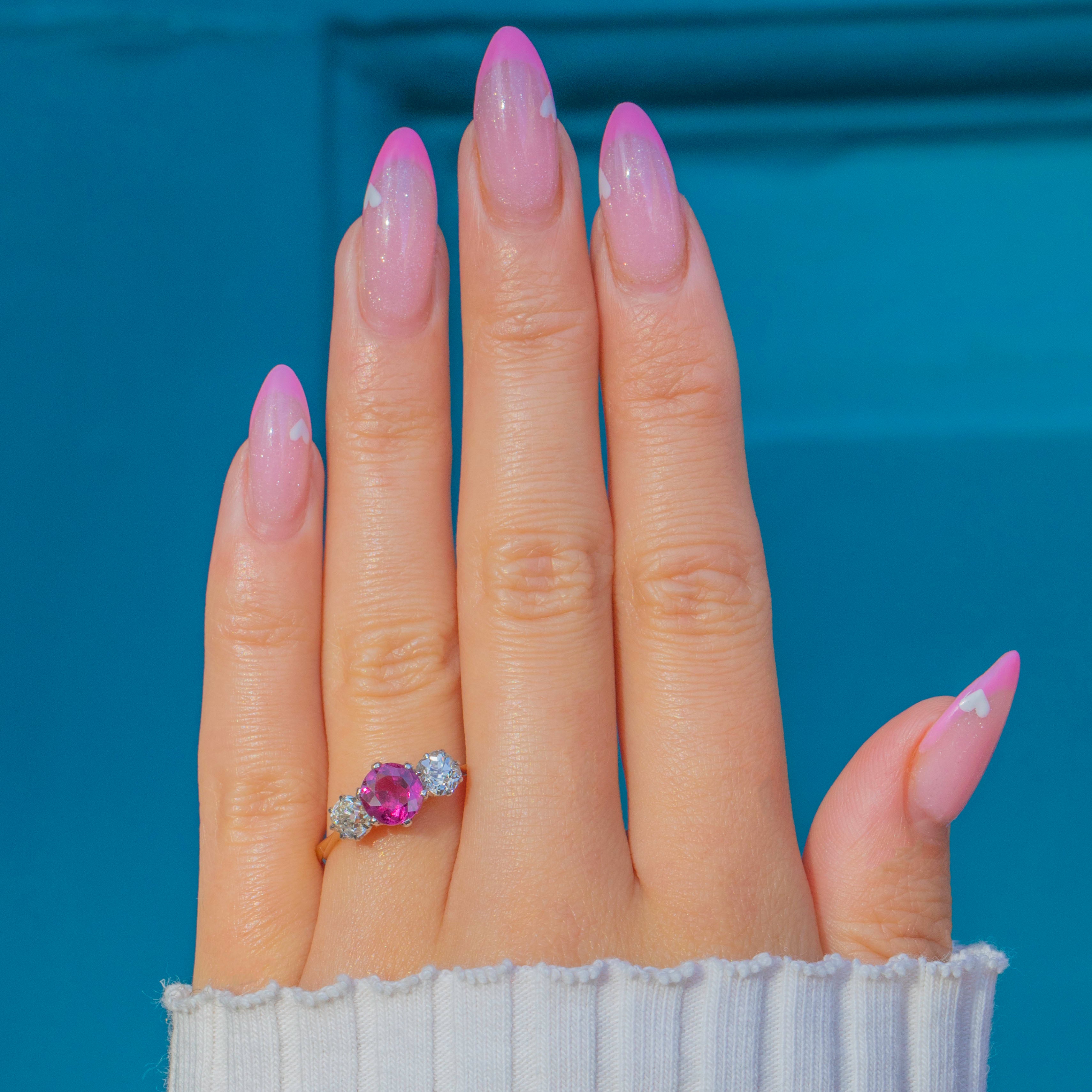 The 0.75ct natural Ruby glows with rich hot pink tones, complemented by the brilliance of the Diamonds, a classic Art Deco combination that feels both elegant and enduring- making it a gorgeous choice as an engagement ring!