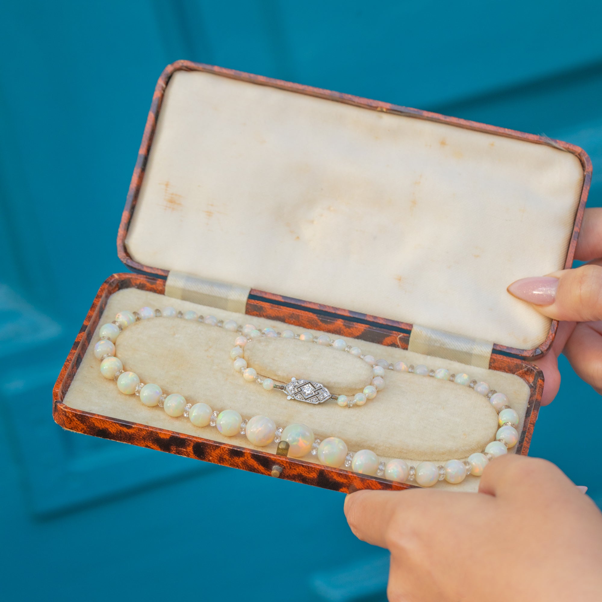 Art Deco 75.00ct Opal and Rock Crystal Graduated Bead Necklace in Antique Box