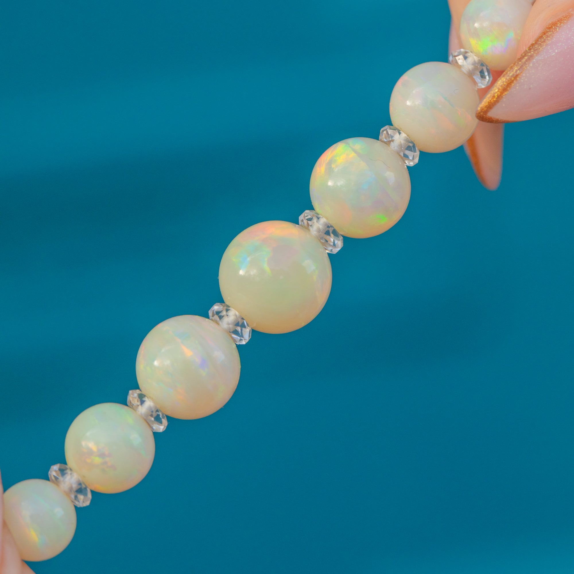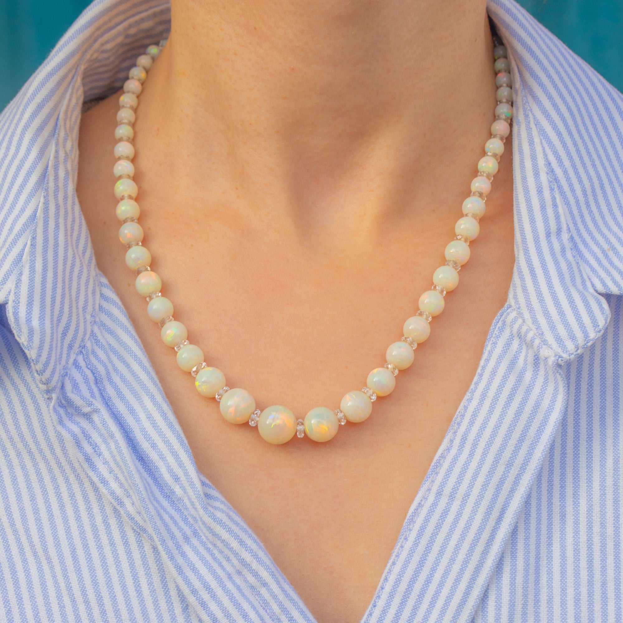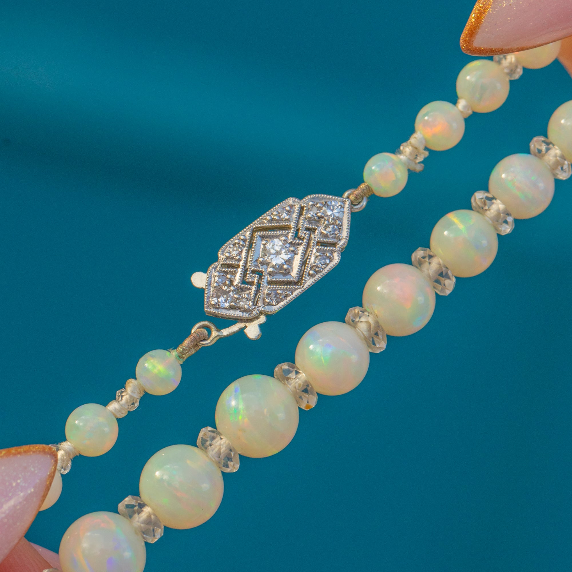 A spectacular Art Deco necklace strung with vivid natural Opal beads interspersed with luminous Rock Crystal, closed by a refined 18ct White Gold safety clasp set with twinkling Diamonds.