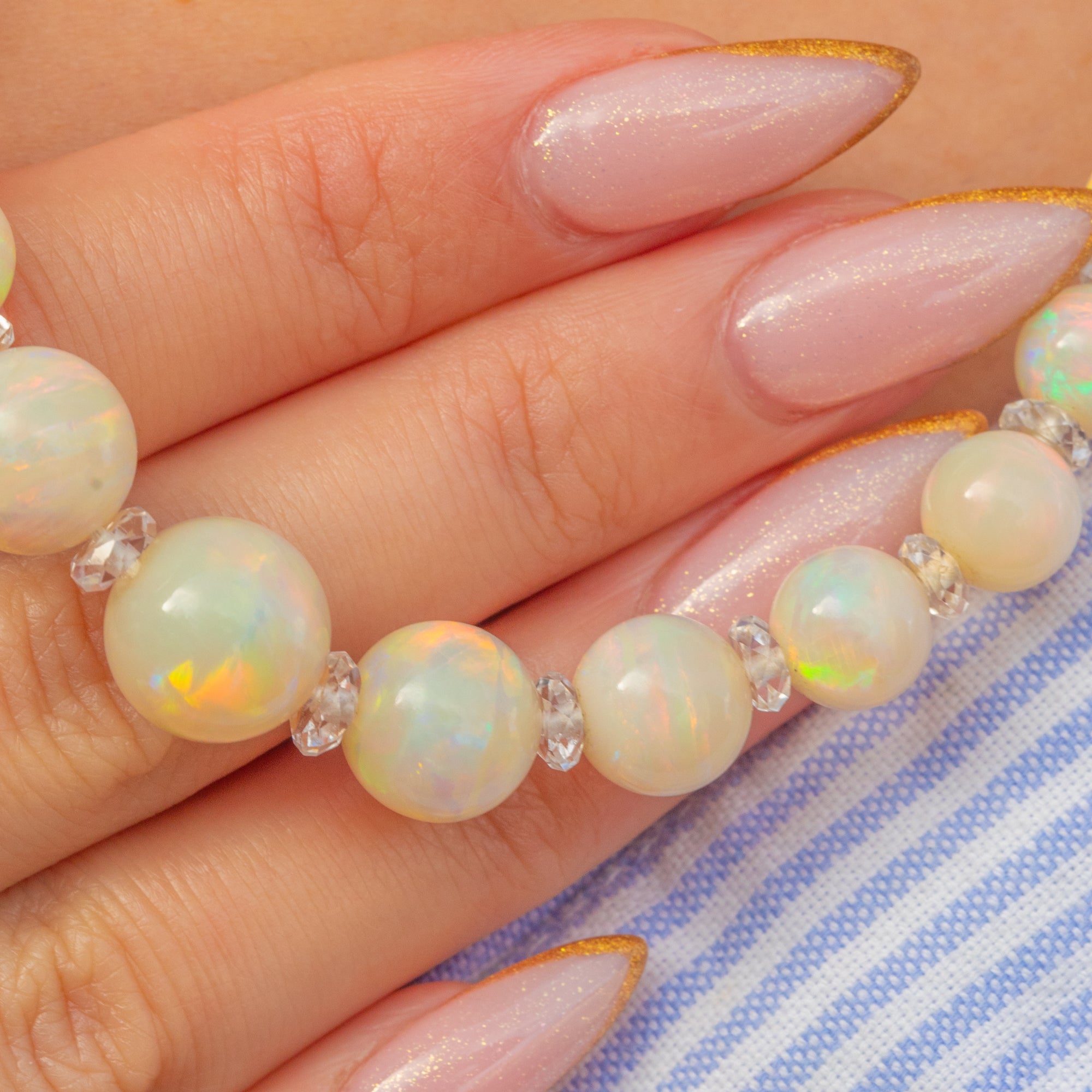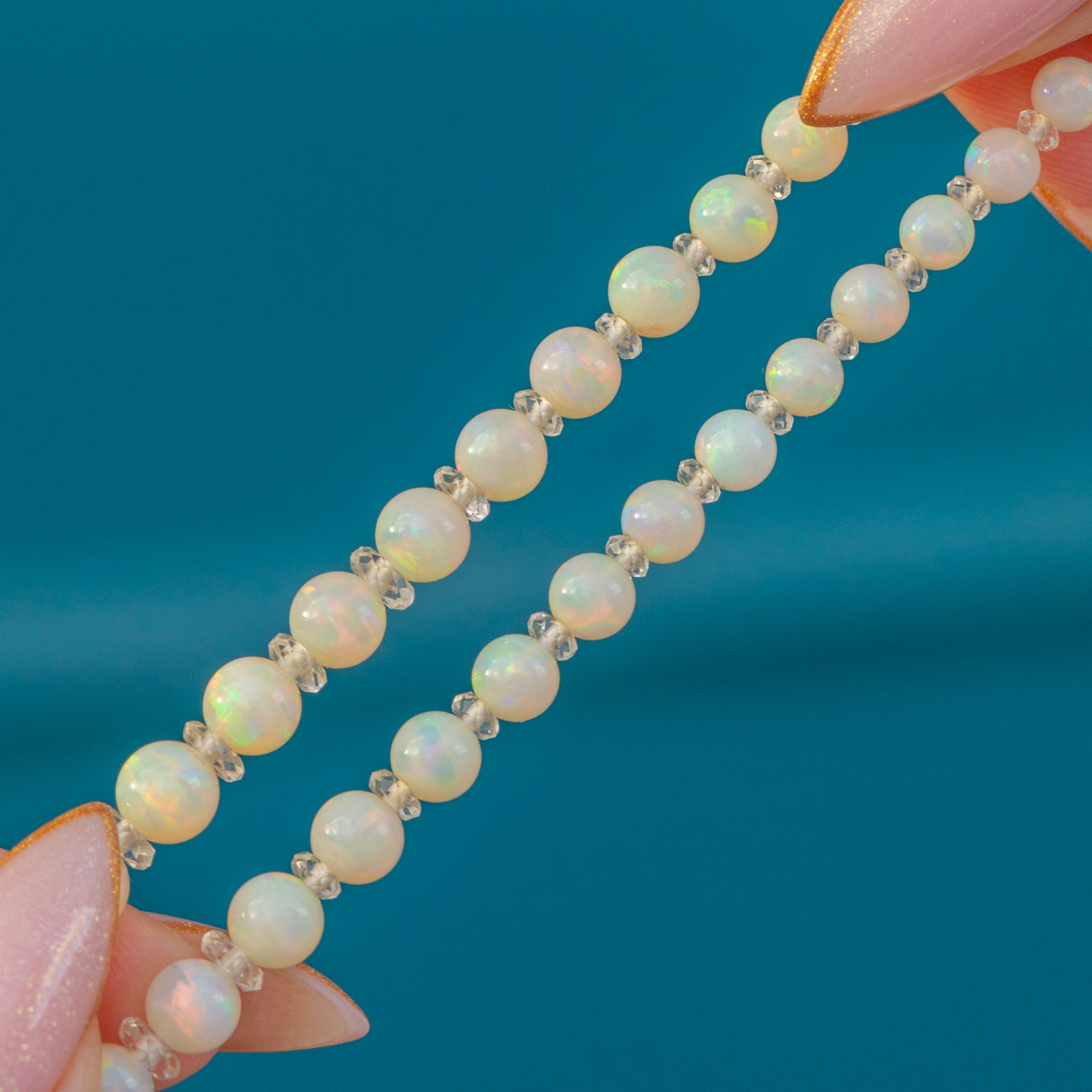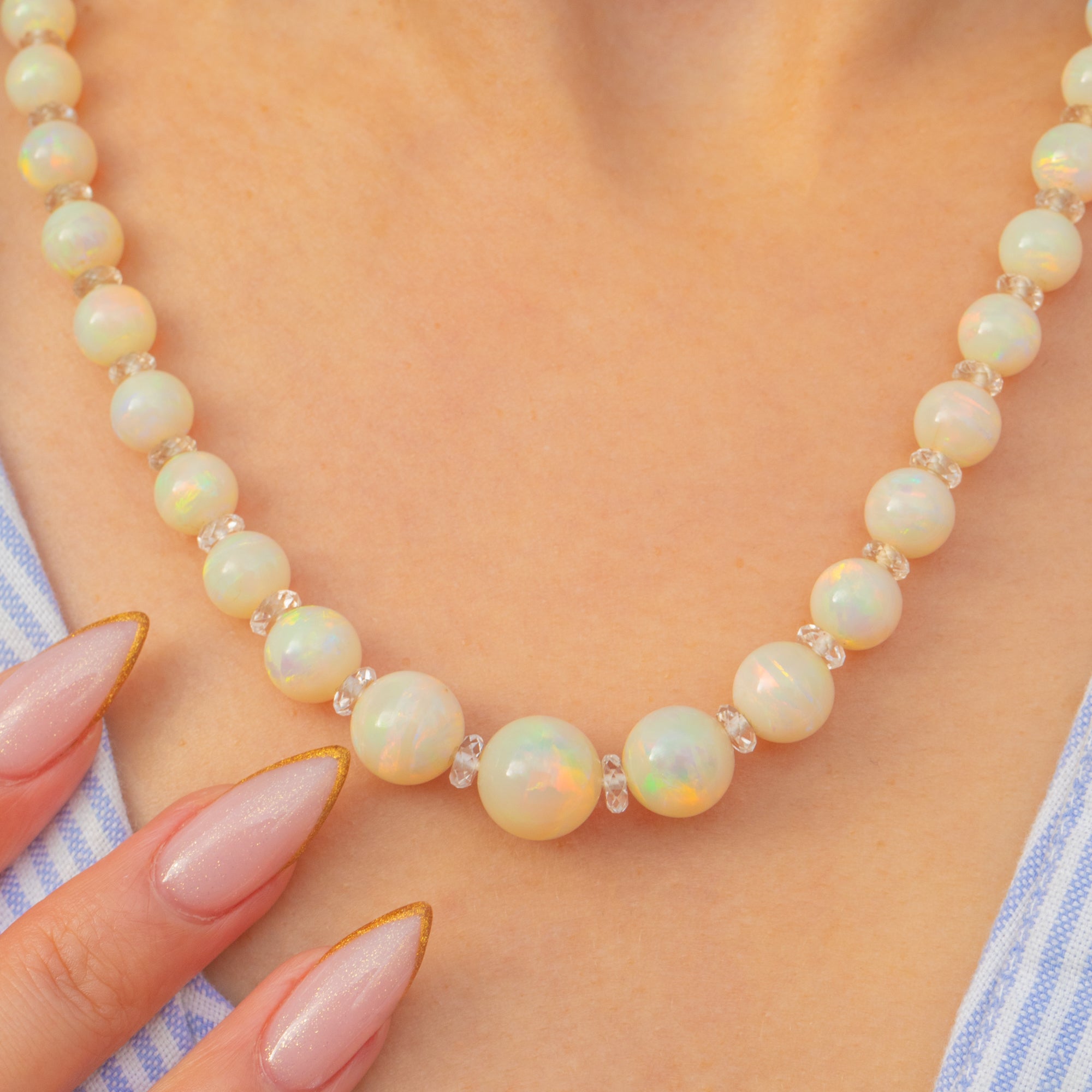 A spectacular Art Deco necklace strung with vivid natural Opal beads interspersed with luminous Rock Crystal, closed by a refined 18ct White Gold safety clasp set with twinkling Diamonds.