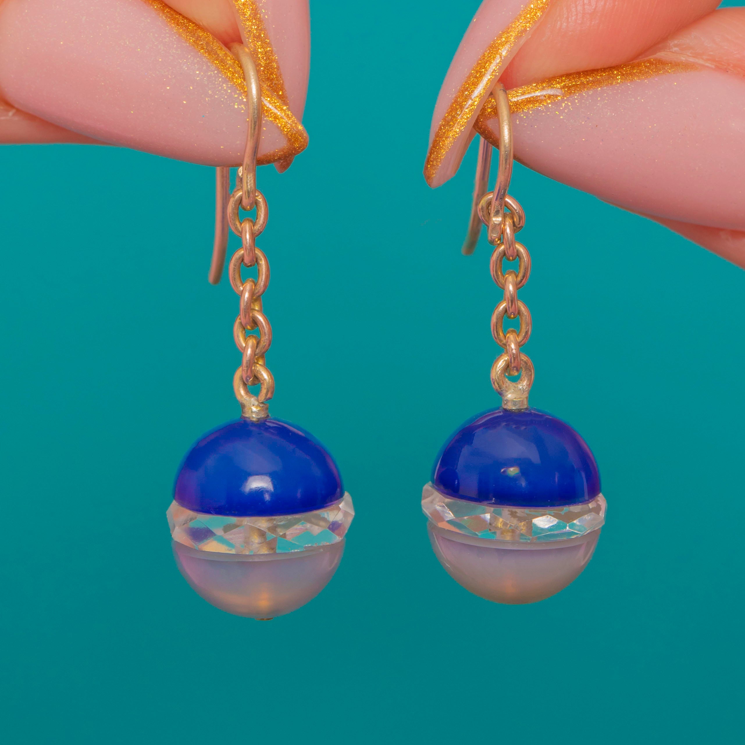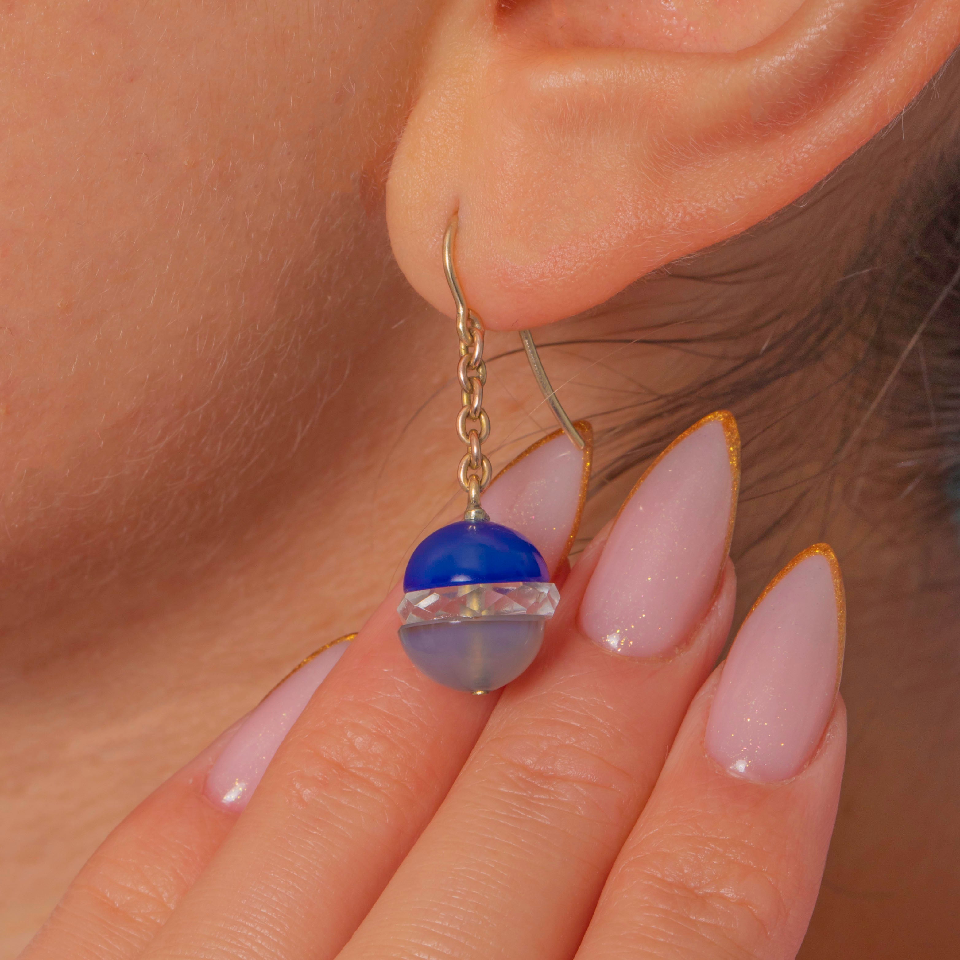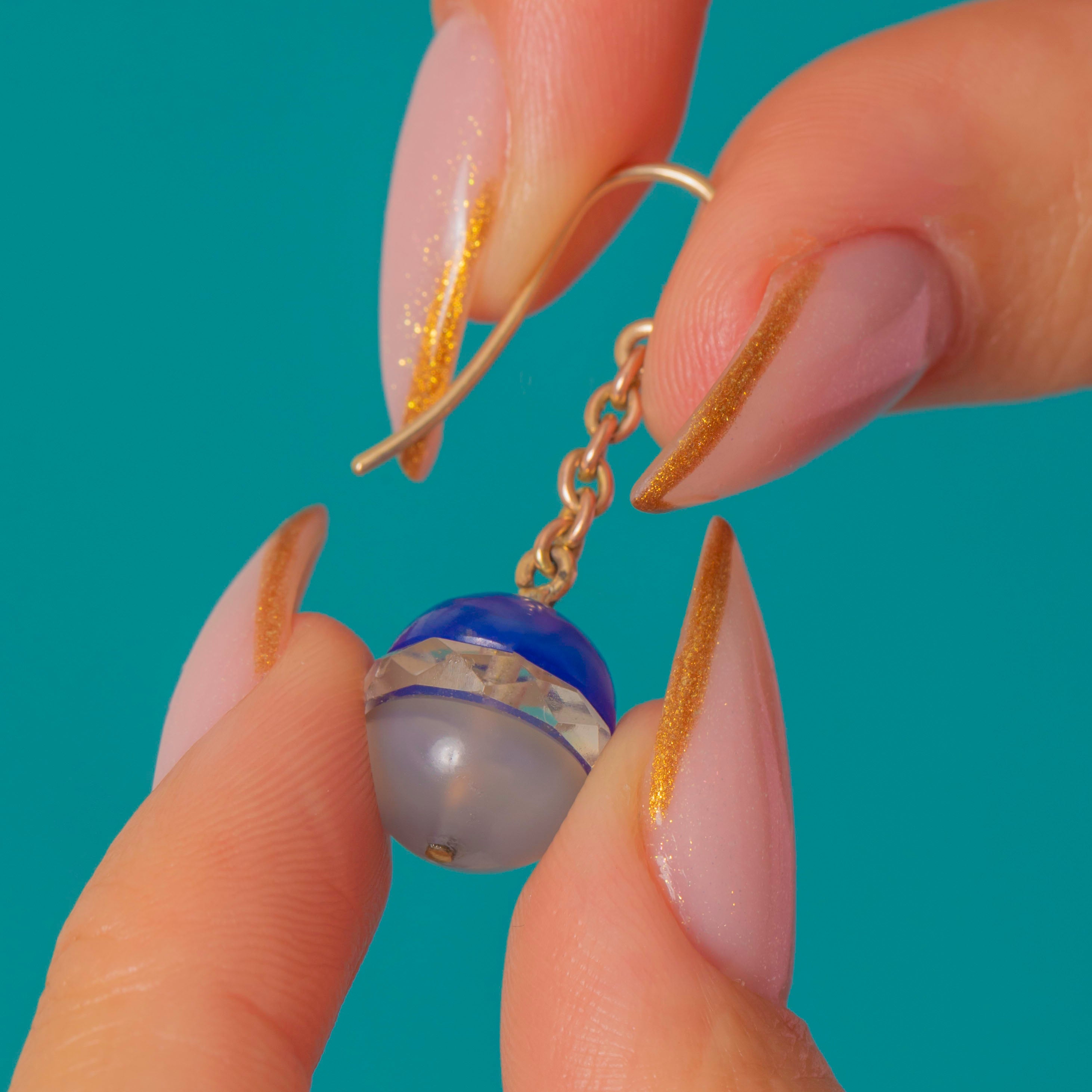These dreamy Art Deco earrings are a striking blend of cool translucence and gentle colour, featuring glossy Blue Chalcedony and Rock Crystal spheres suspended from elegant 9ct Gold fittings.