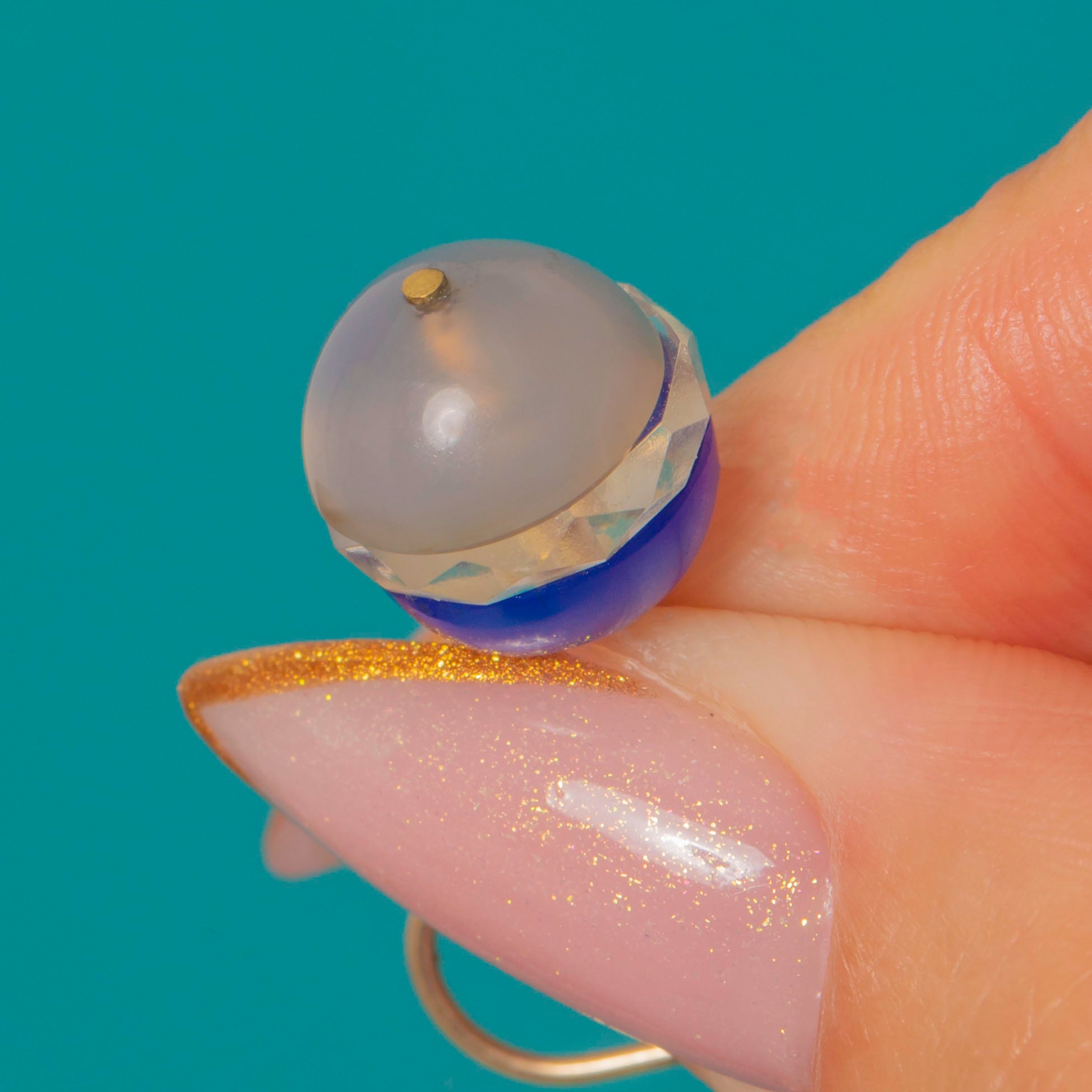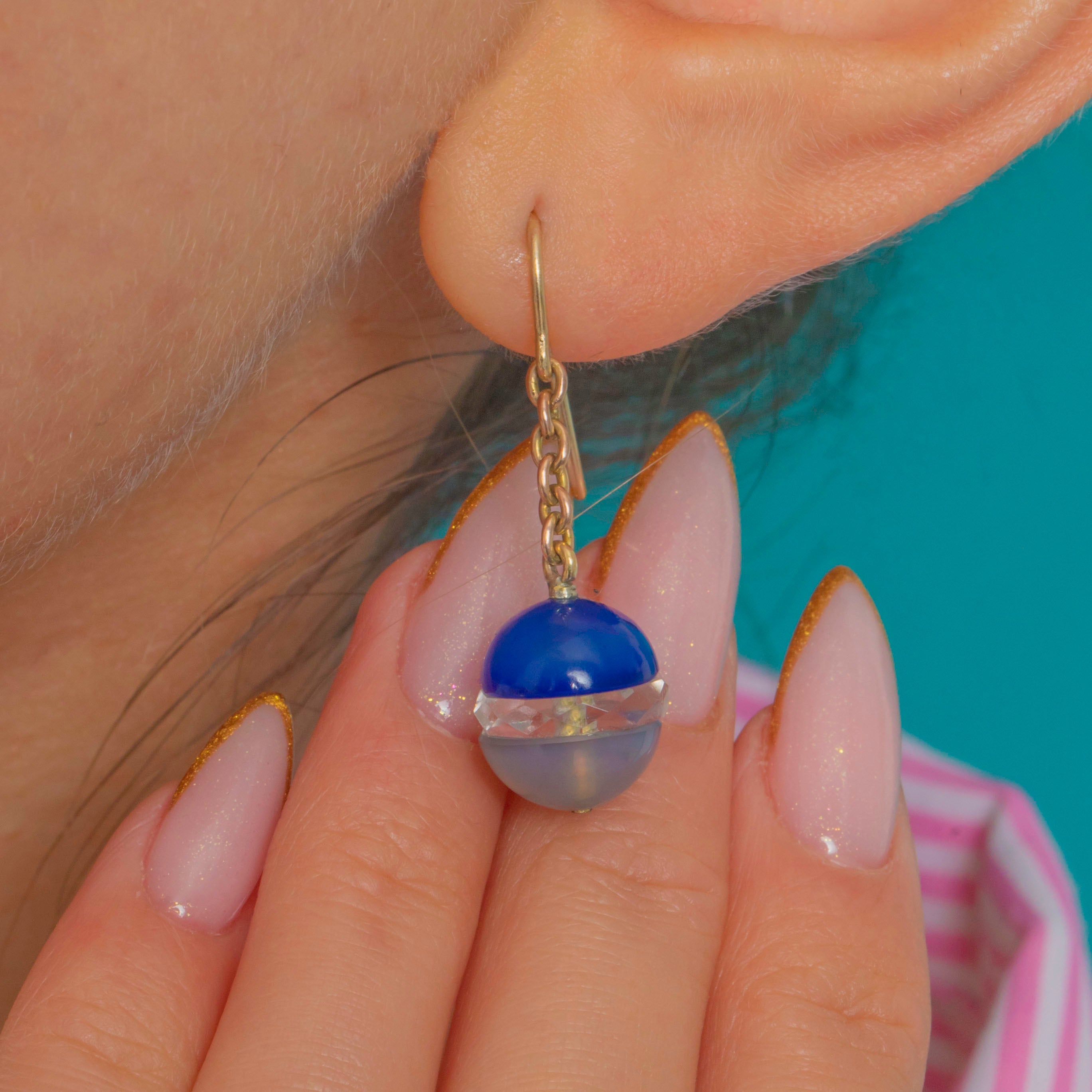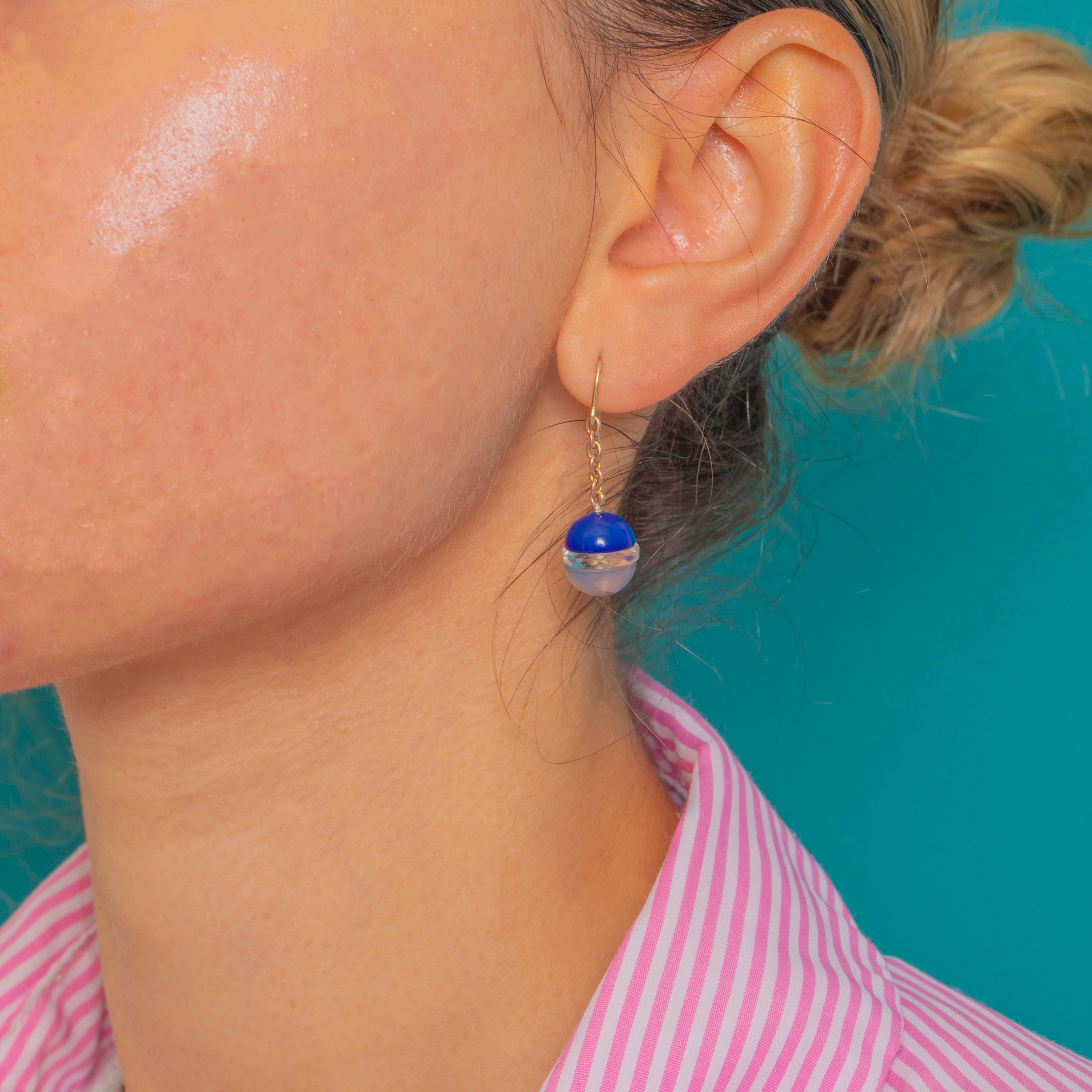 These dreamy Art Deco earrings are a striking blend of cool translucence and gentle colour, featuring glossy Blue Chalcedony and Rock Crystal spheres suspended from elegant 9ct Gold fittings.