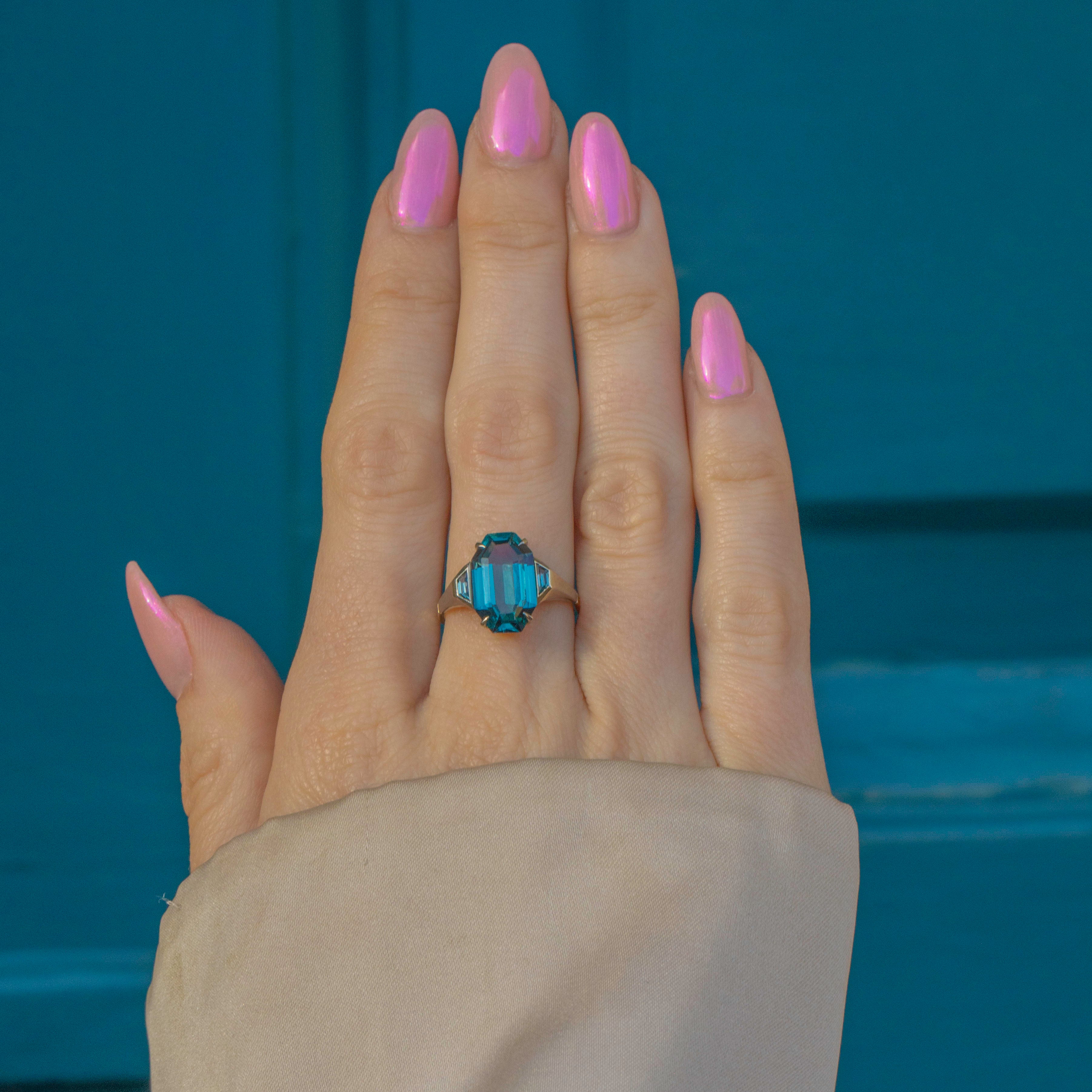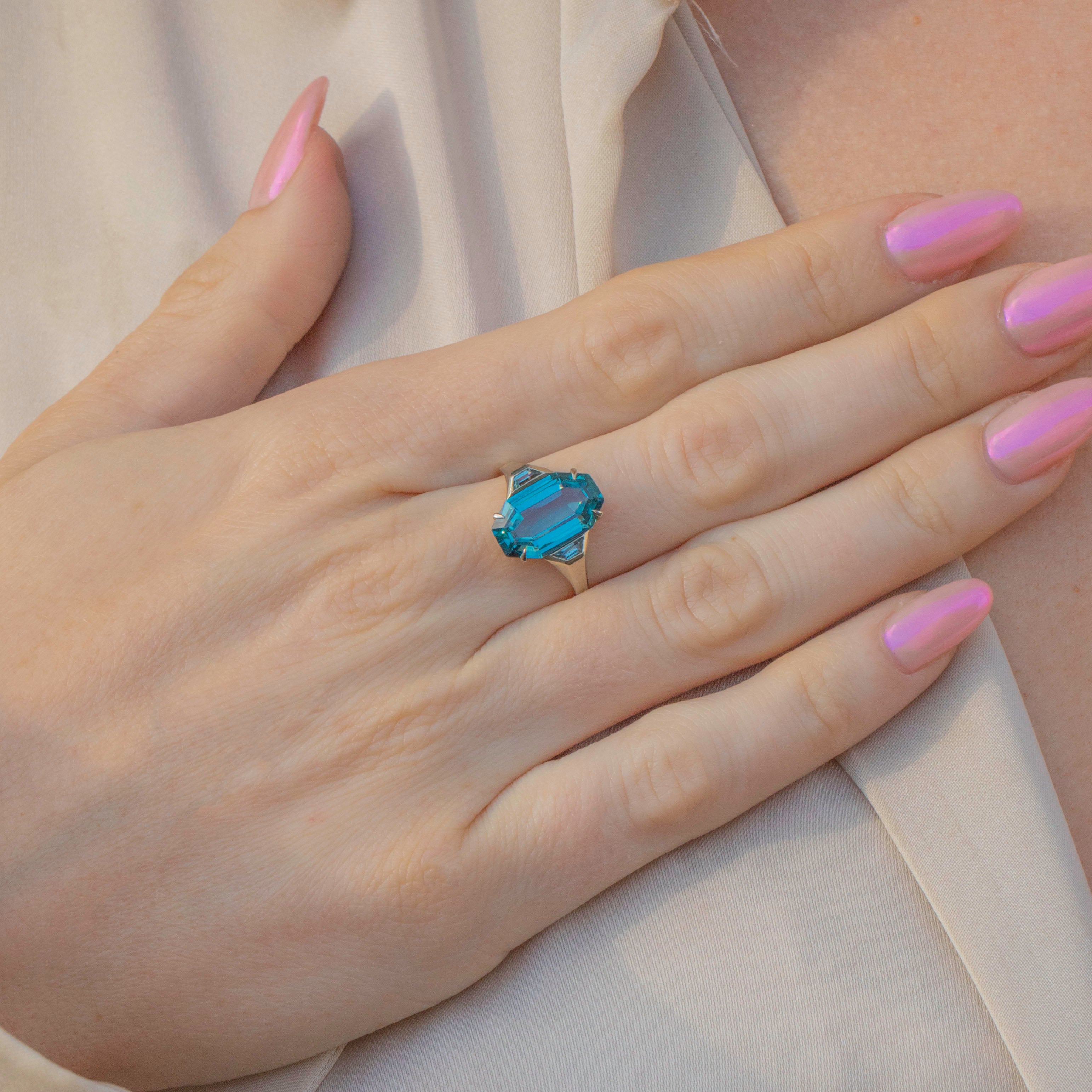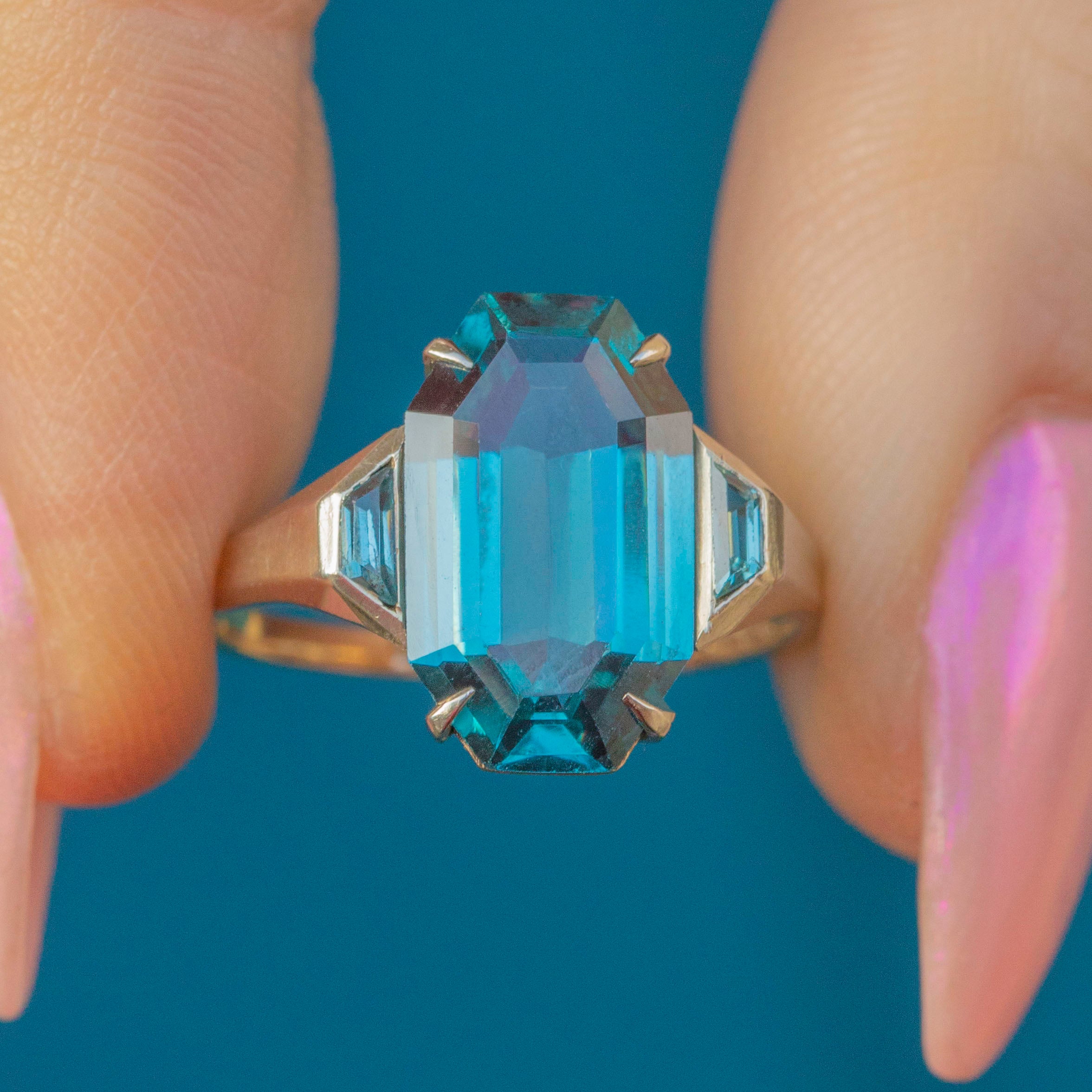 Step back into the most glamorous era with this exquisite Art Deco 9ct Gold Blue Topaz ring! The large 3.75ct octagon-cut Topaz boasts a stunning sea-blue hue and is flanked by topaz-set shoulders set in glowing White Gold, creating a show-stopping piece.