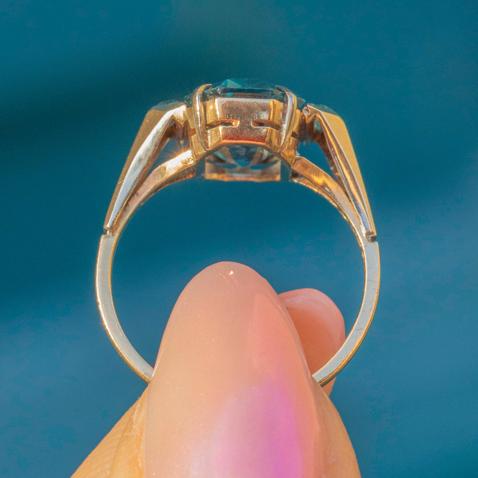 VERY GOOD-EXCELLENT. This Art Deco 9ct Gold Blue Topaz Ring is in lovely condition. The Topaz gems are beautifully faceted, twinkling delicately under the light, with no chips or scuffs to note. The Gold is saturated with only some minor age-related wear throughout. Don this fanciful ring and you won't want to take her off!