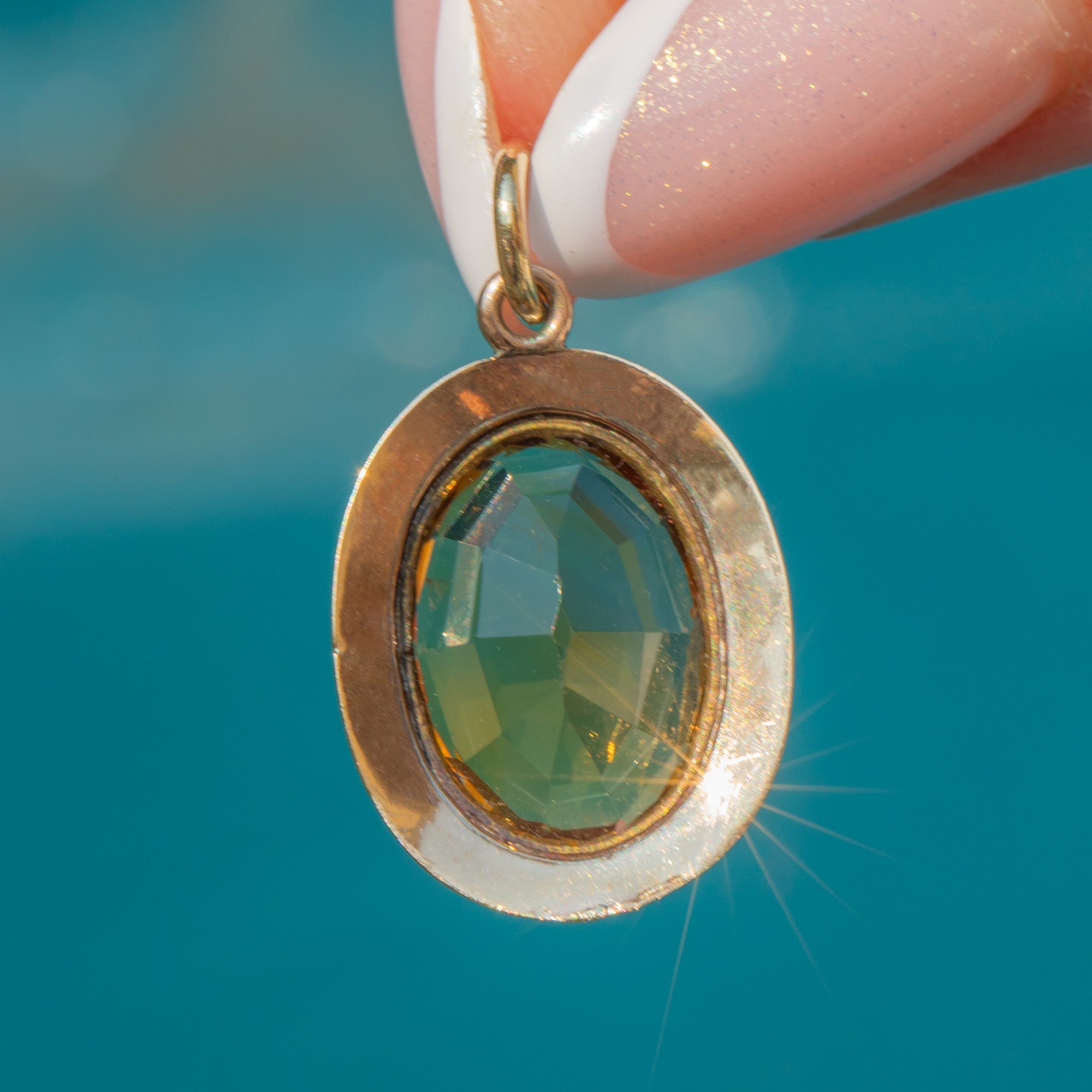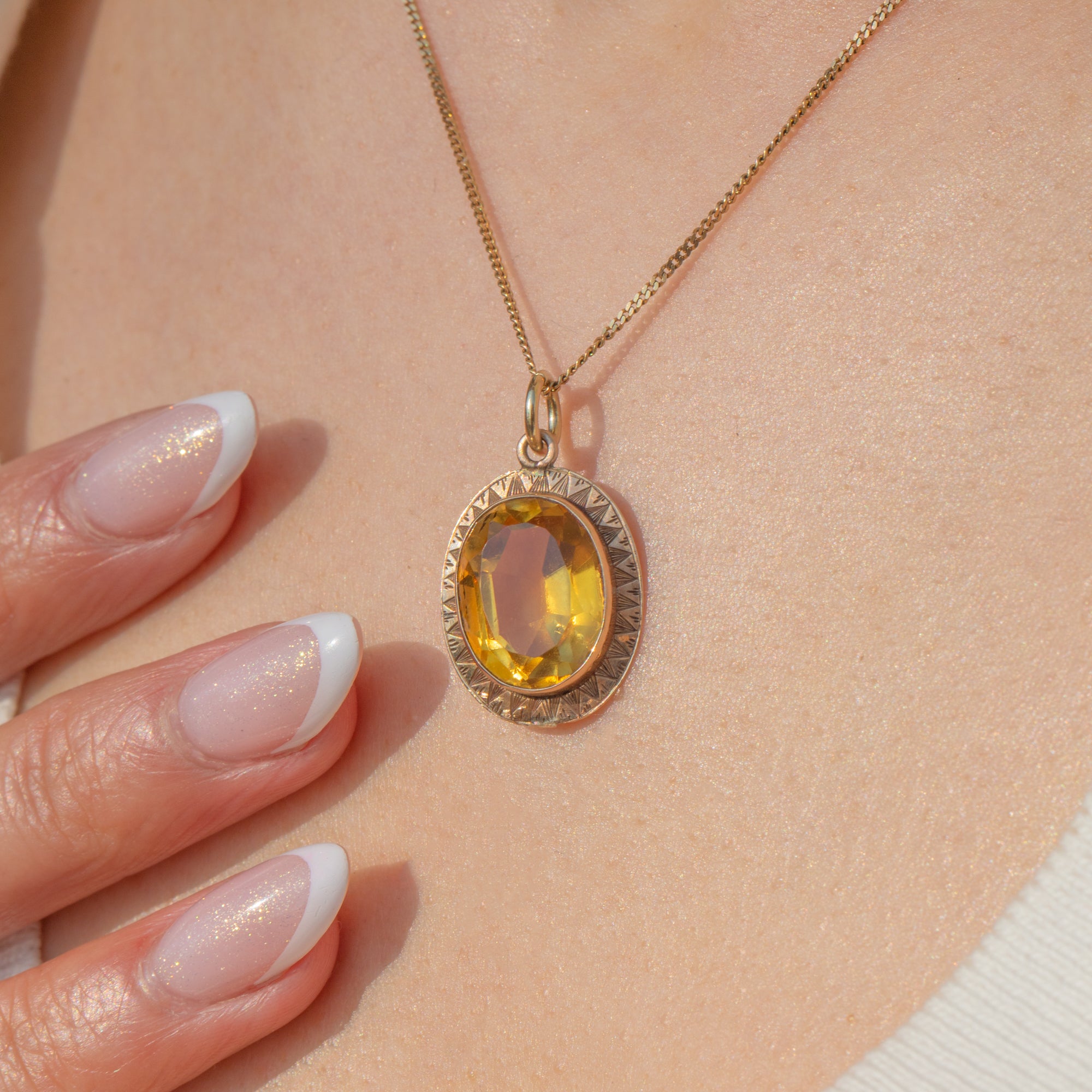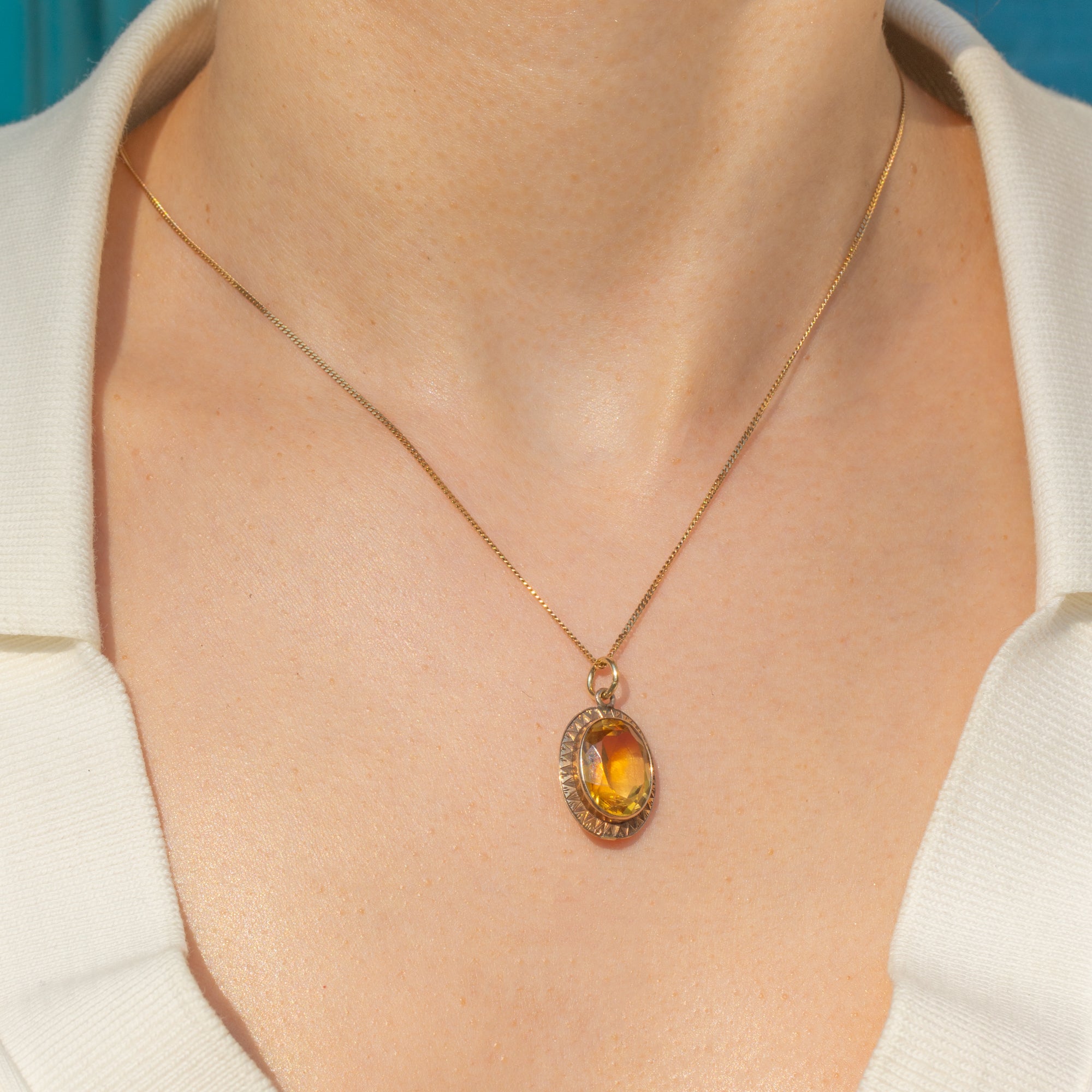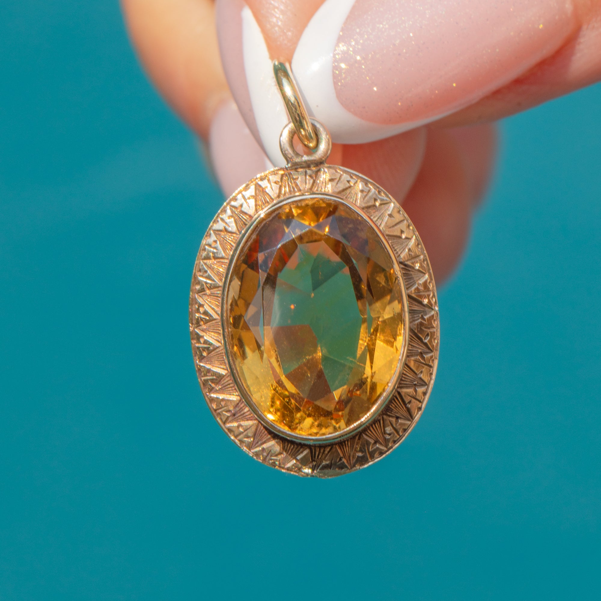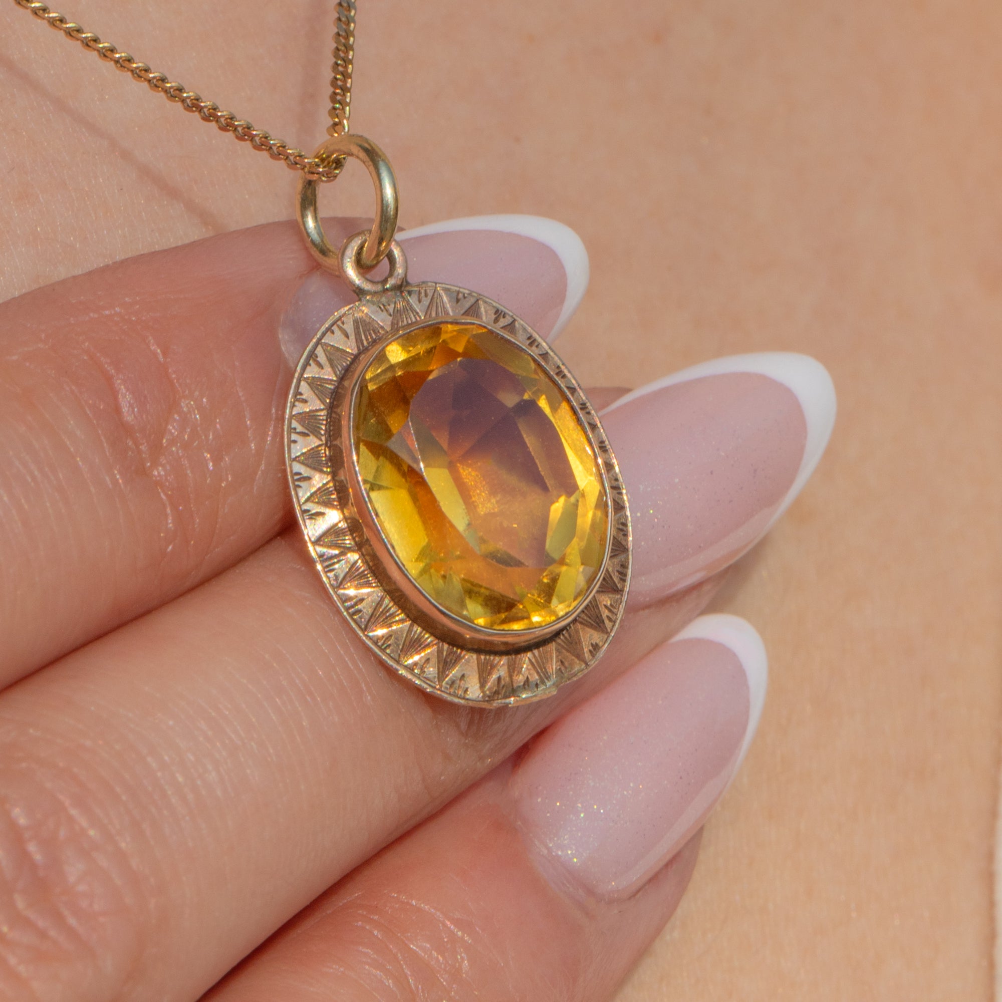 The Gold setting is adorned with intricate geometric detailing, a hallmark of the refined craftsmanship of the Art Deco period. With her rich, sunlit hue, this pendant will add a sophisticated touch of colour to any ensemble.