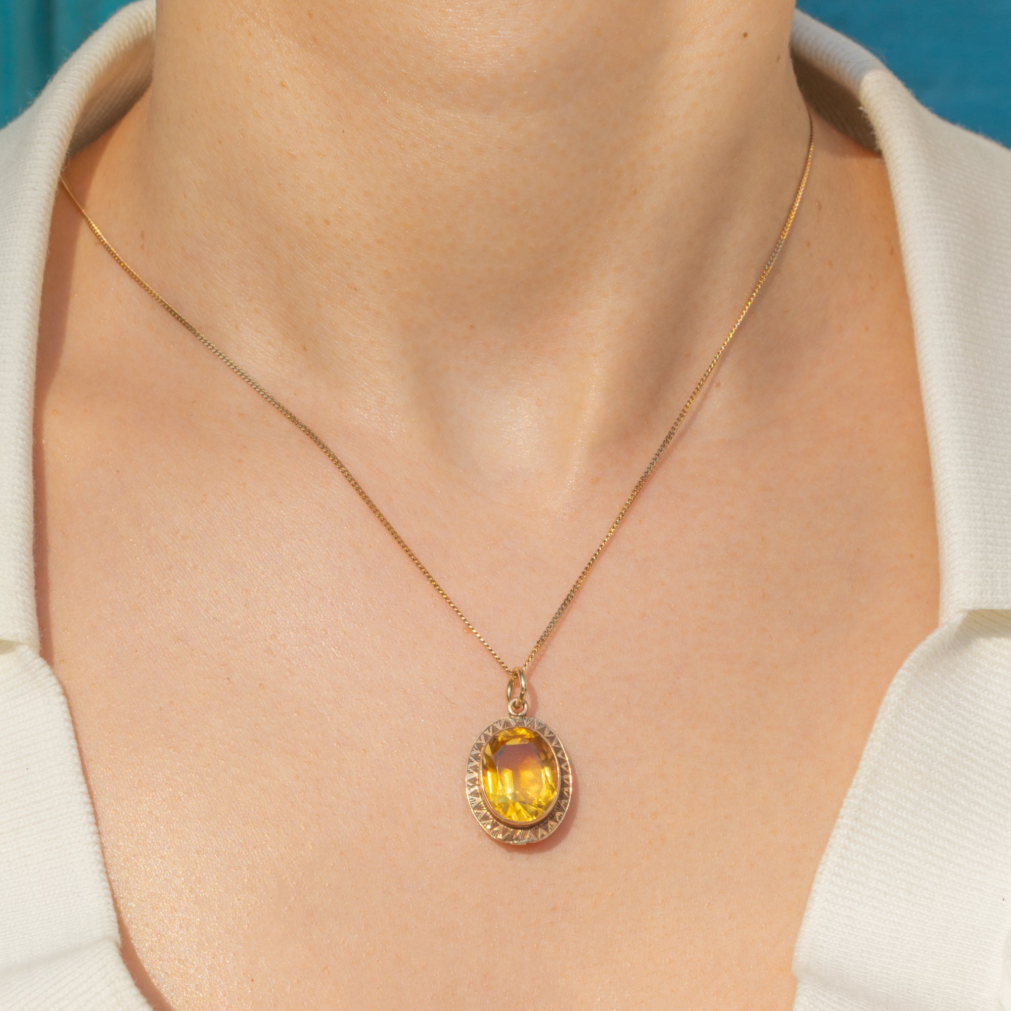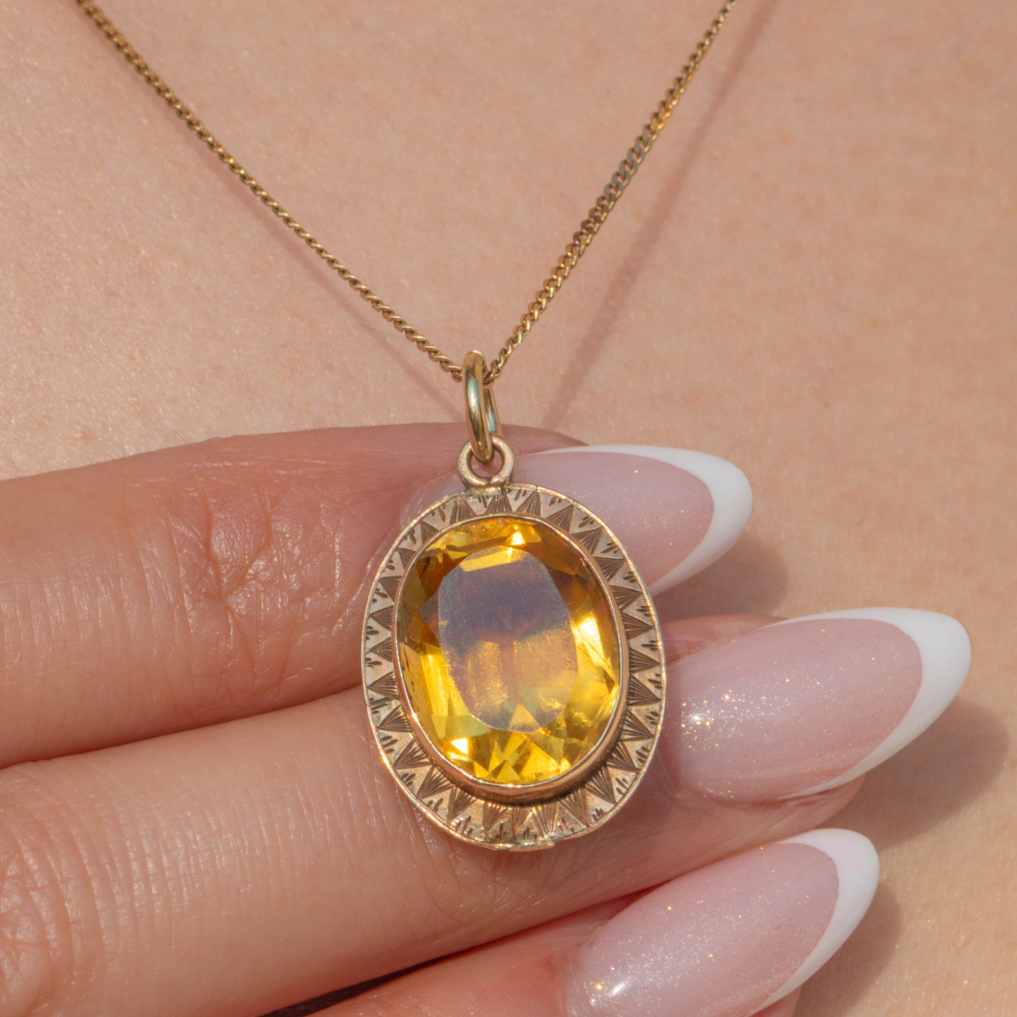 Expertly faceted, the dazzling 7.74ct Citrine captures and reflects light beautifully. The Gold setting is engraved with intricate geometric detailing, a hallmark of the refined craftsmanship of the Art Deco period. With her rich, sunlit hue, this pendant will add a sophisticated look to any ensemble.