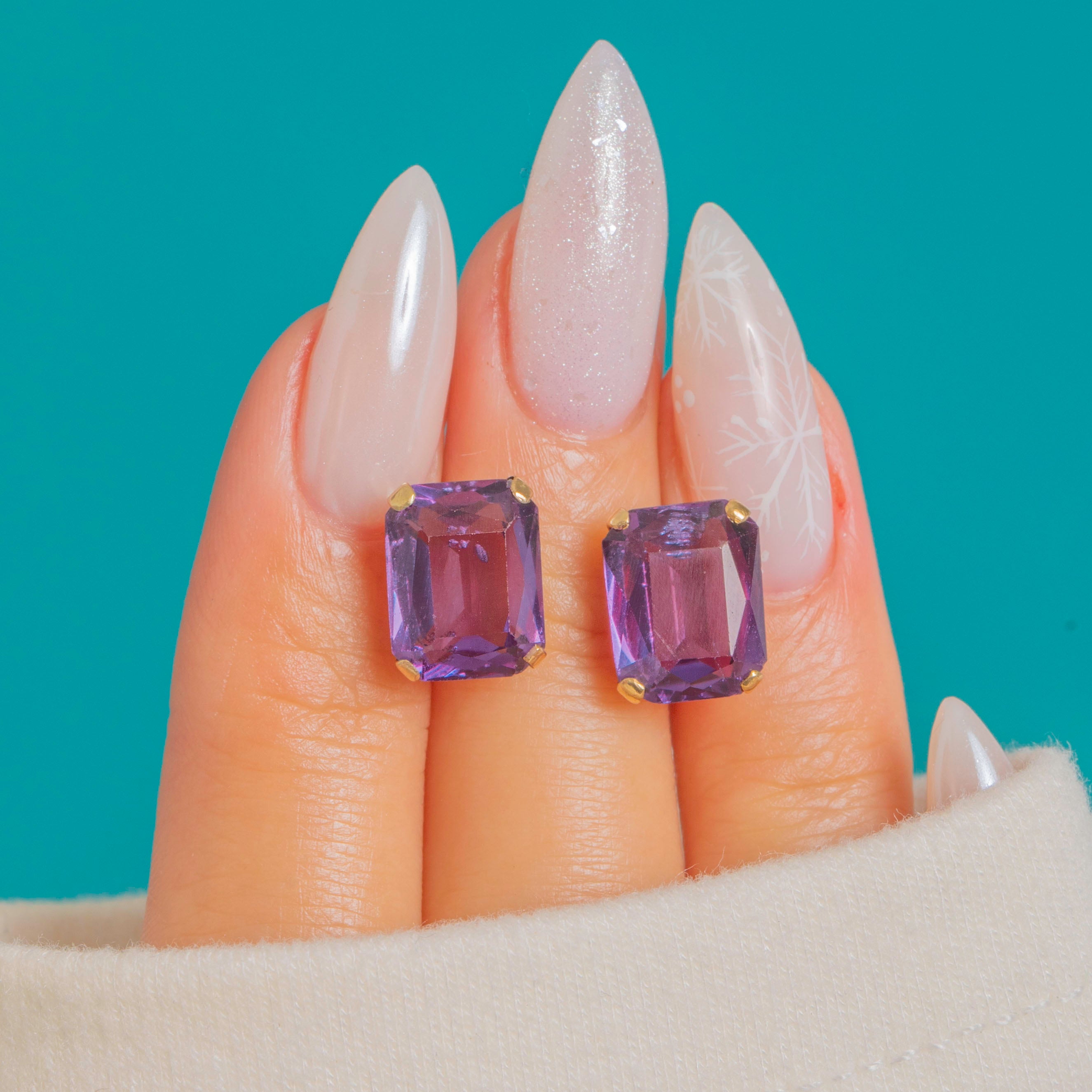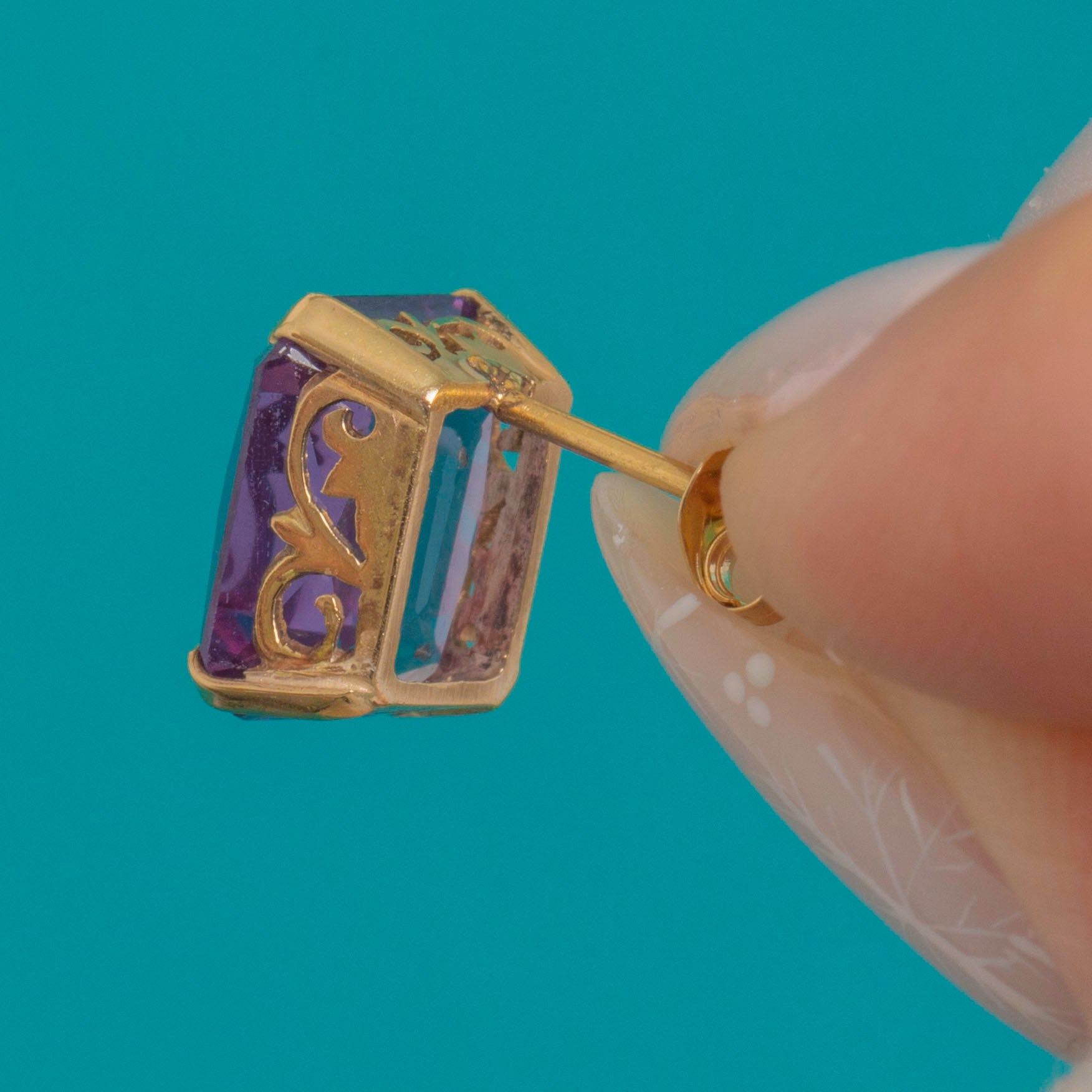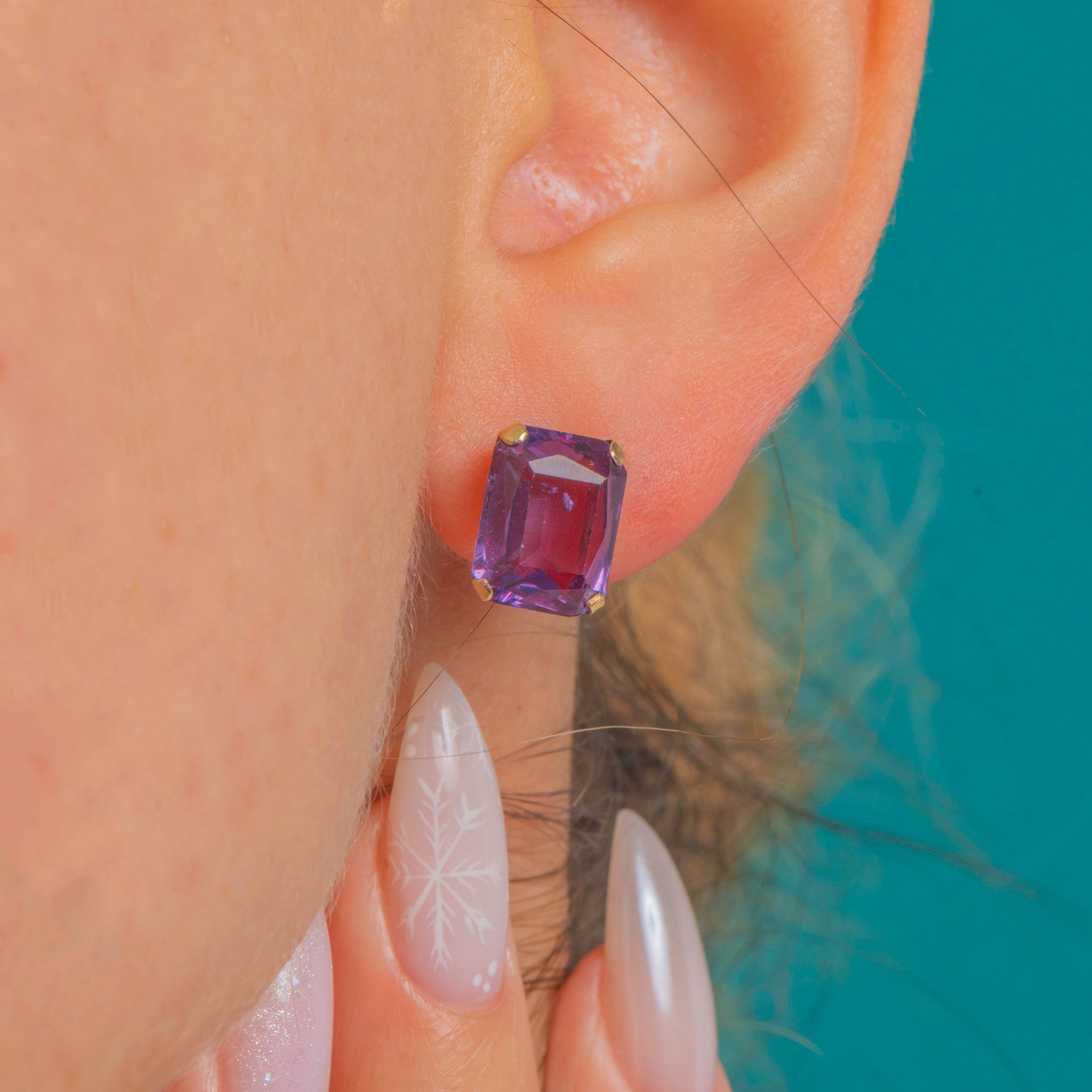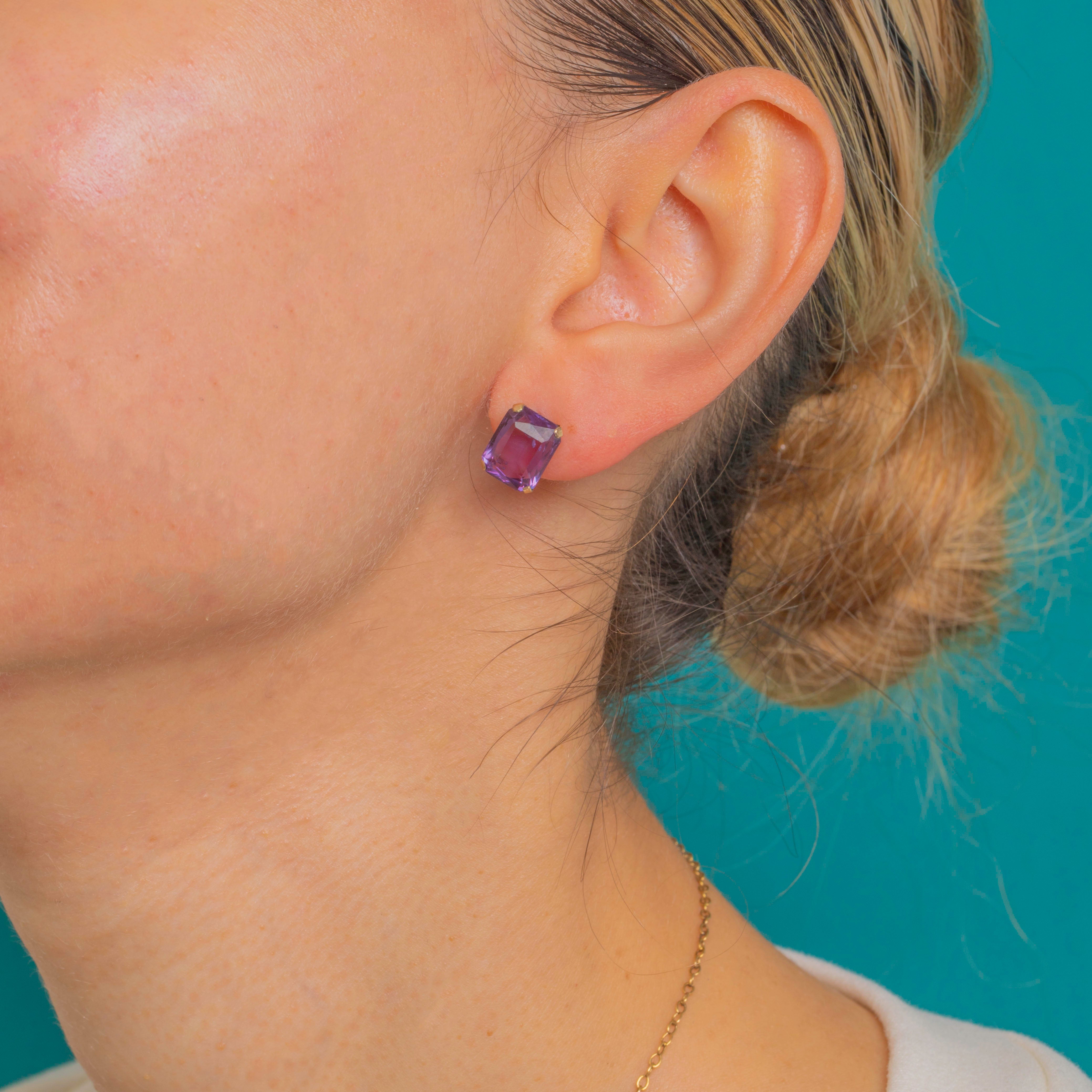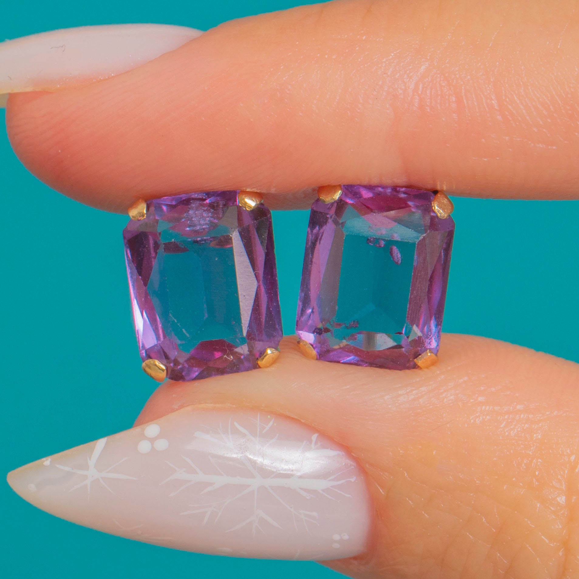 Sleek, geometric and gloriously colour-forward, these Art Deco 9ct Gold studs showcase rectangular step-cut Synthetic Colour Change Sapphires in elegant four-corner claw settings. The crisp facets and minimalist mounts let the vibrant hue take centre stage for a look that’s refined yet impactful.