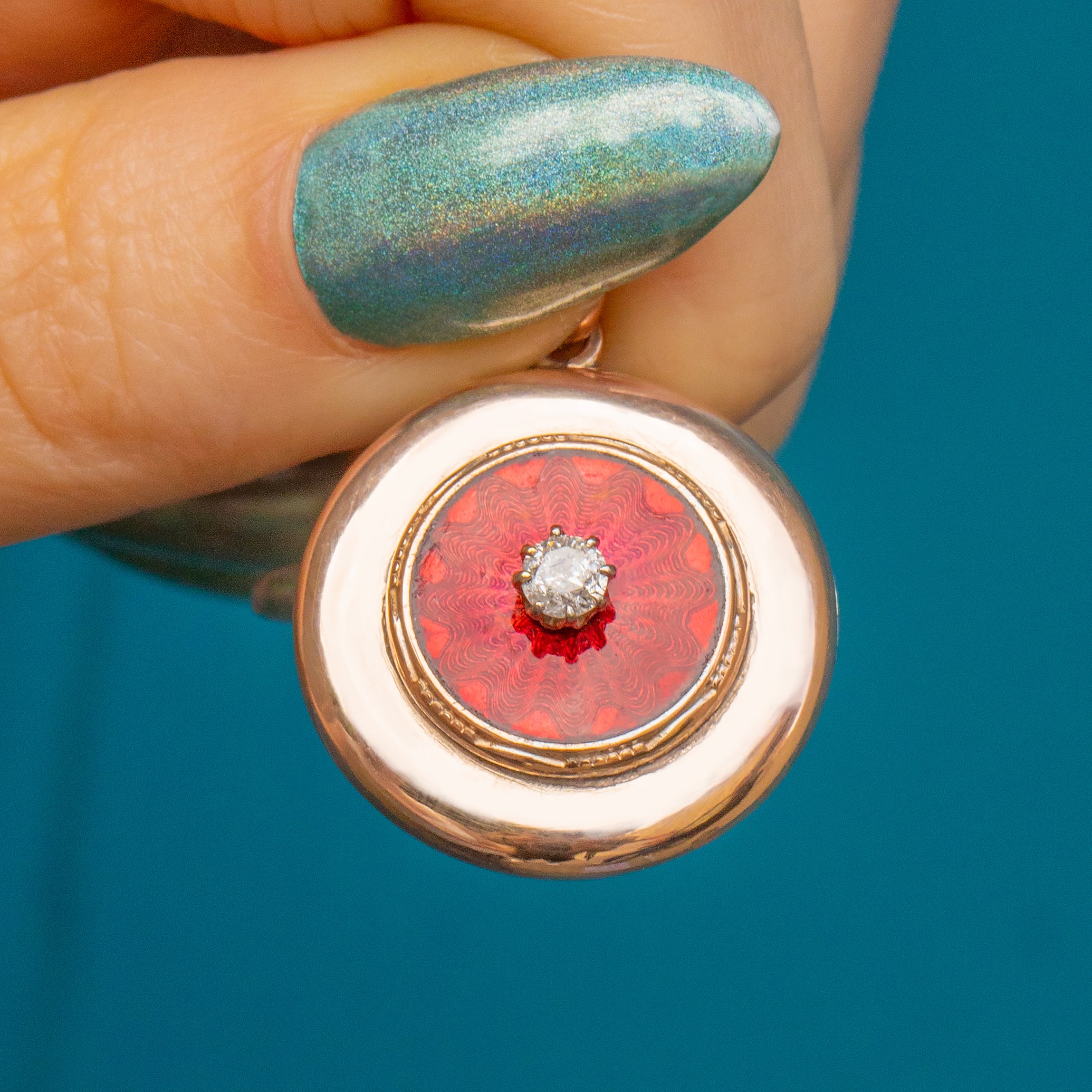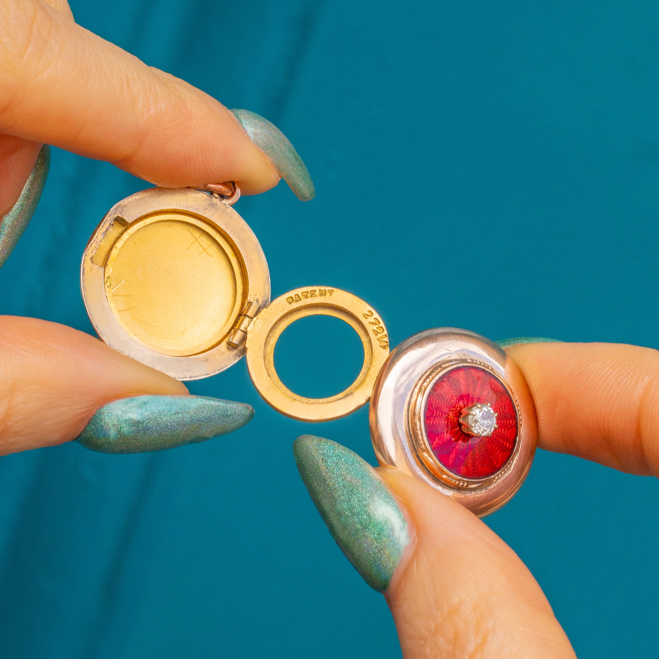 Crafted with meticulous attention to detail, this Art Deco locket has been formed of buttery 9ct Gold inlaid with a scintillating Diamond surrounded by Guilloché Enamel, creating a feast for the eyes! Whether a special treat for yourself or a thoughtful gift for a loved one, this special piece of Art Deco jewellery will become a treasured and sentimental heirloom!