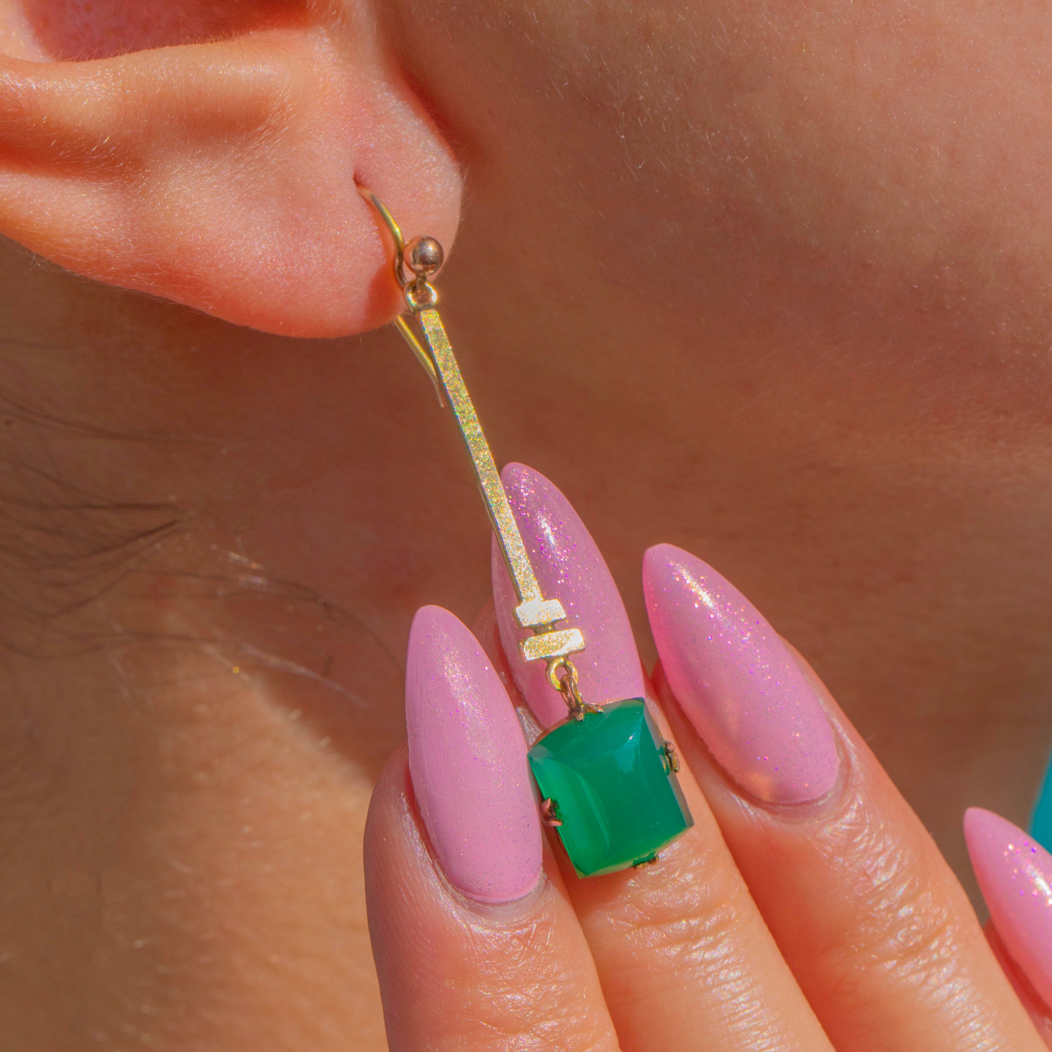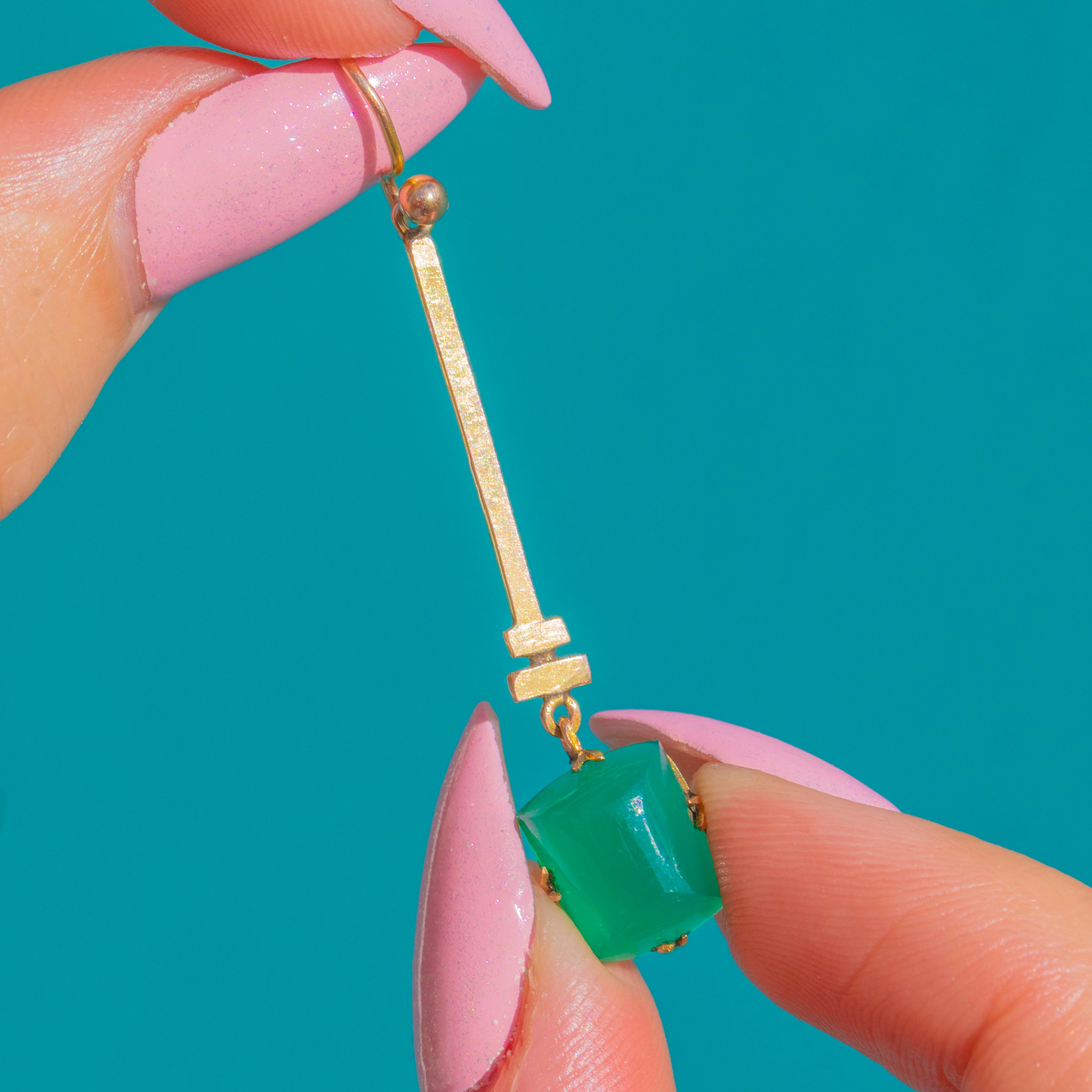 洗練された彫刻的なフォルムが魅力のArt Deco 9ctゴールド ドロップピアスは、時代特有のクリーンなラインと鮮やかな色彩への愛を体現しています。細身でテクスチャーのあるバーが視線を導き、豊かなグリーンのカルセドニー ドロップが温かみのあるゴールドに美しく映えます。