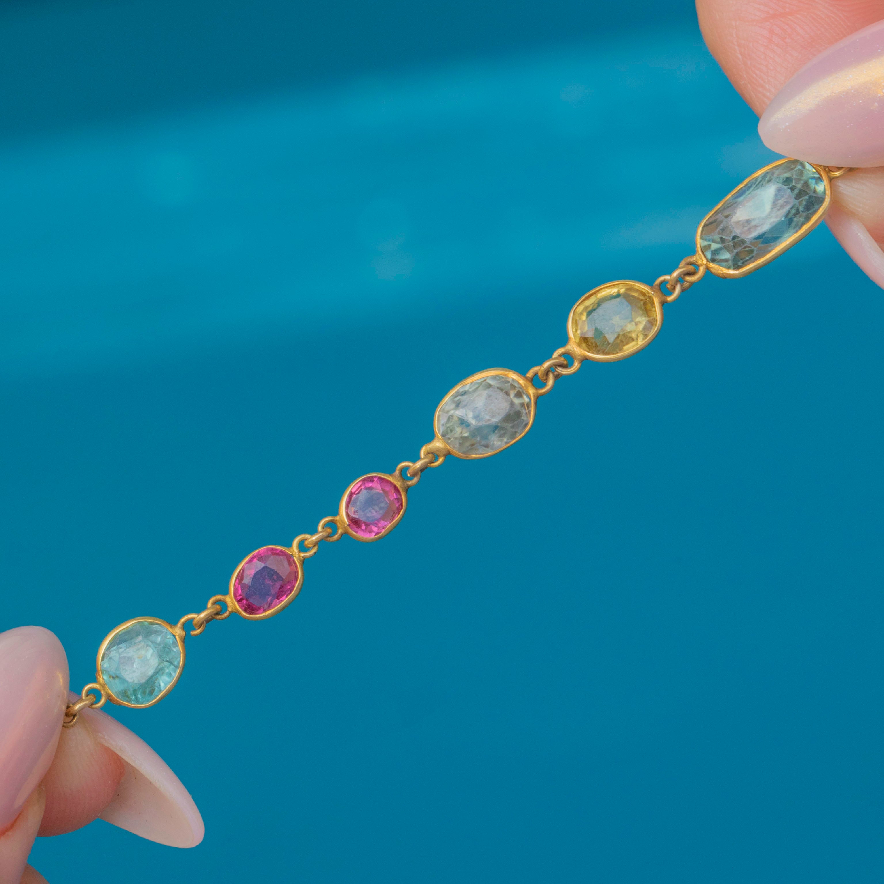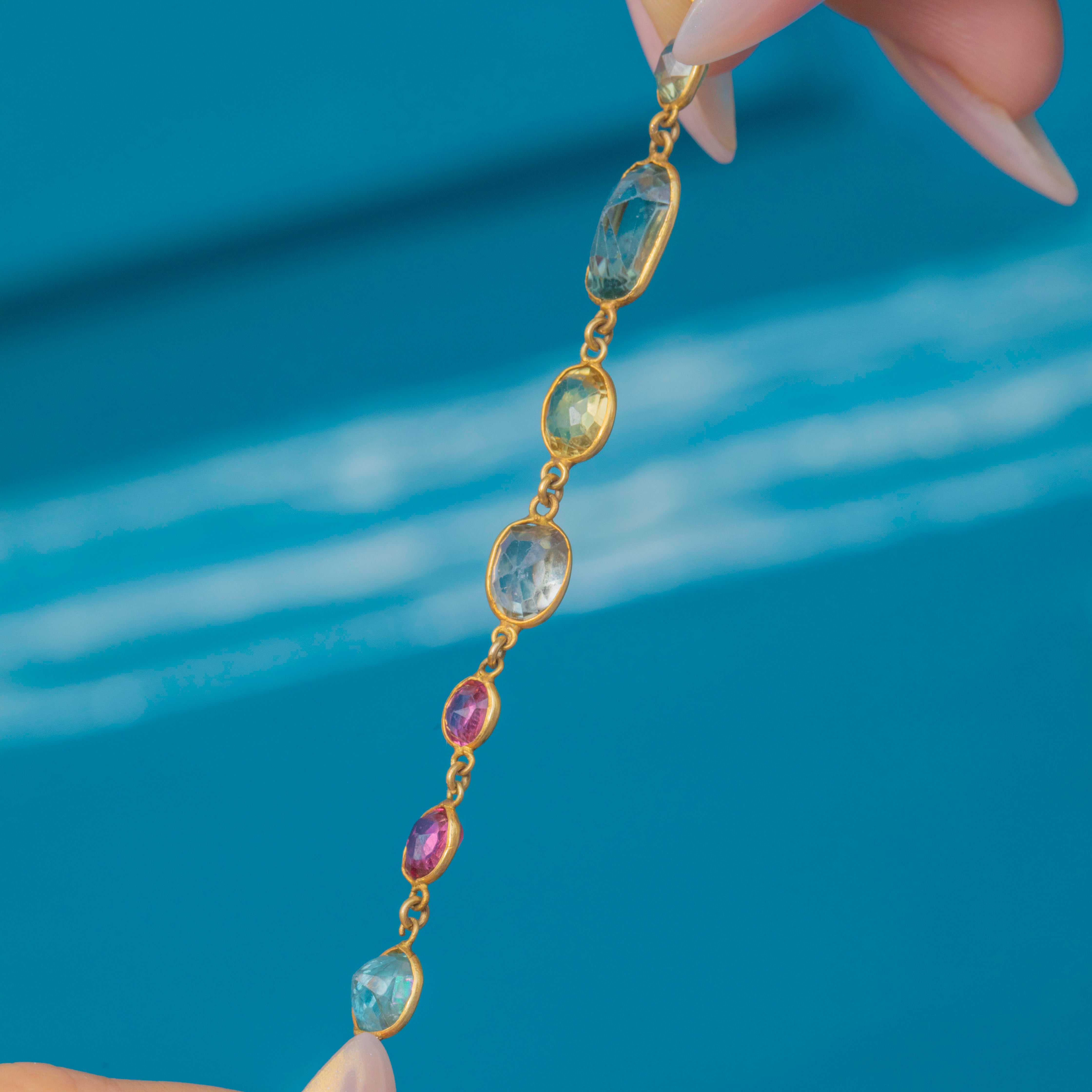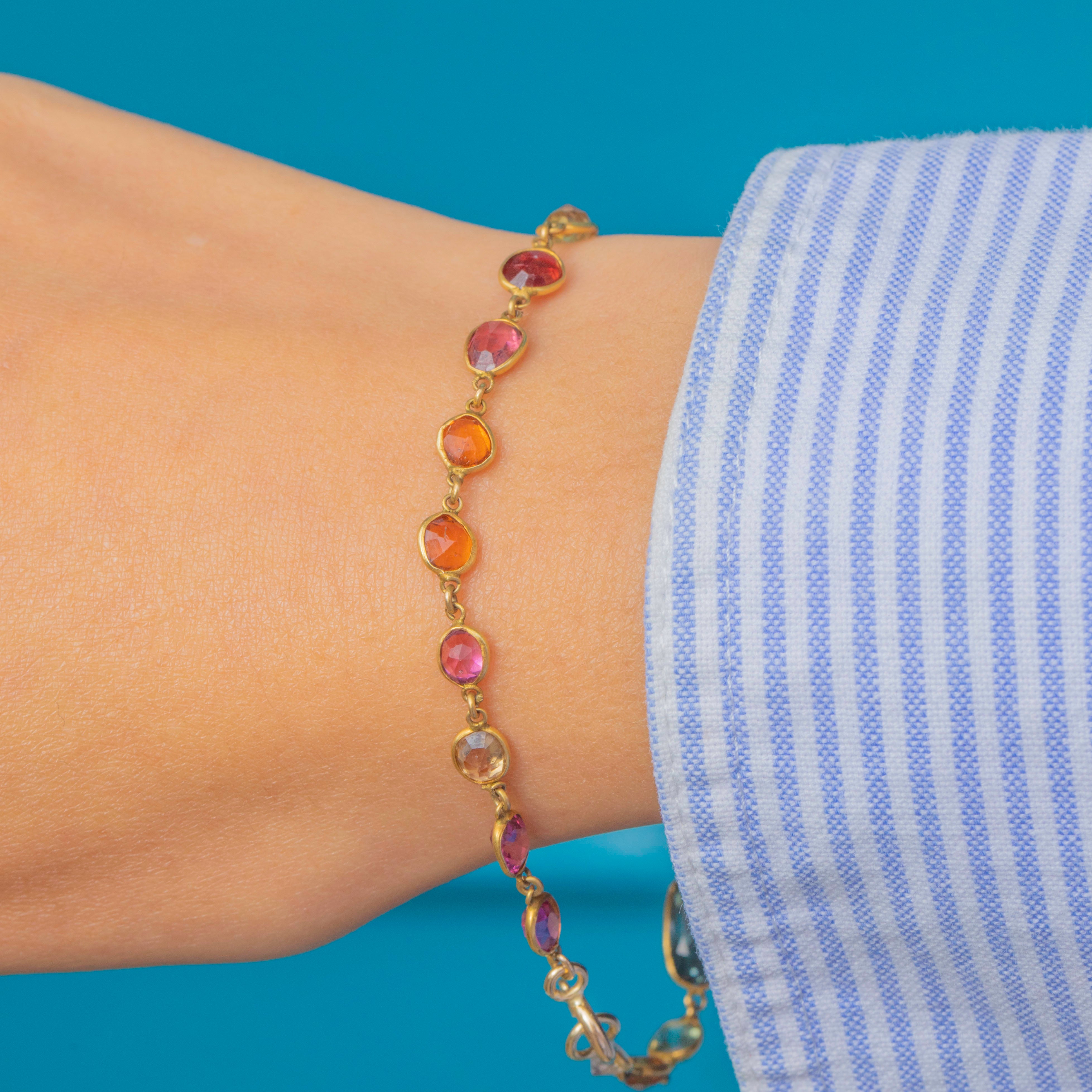 Gemstones include Blue Sapphires, Blue Topaz, Pink Garnets, Spinel, Citrine, Rock Crystal and a vivid Orange Paste, all carefully chosen to create a striking kaleidoscope of colour. At 7.5" long, it sits comfortably and elegantly, adding vibrancy to any jewellery collection.