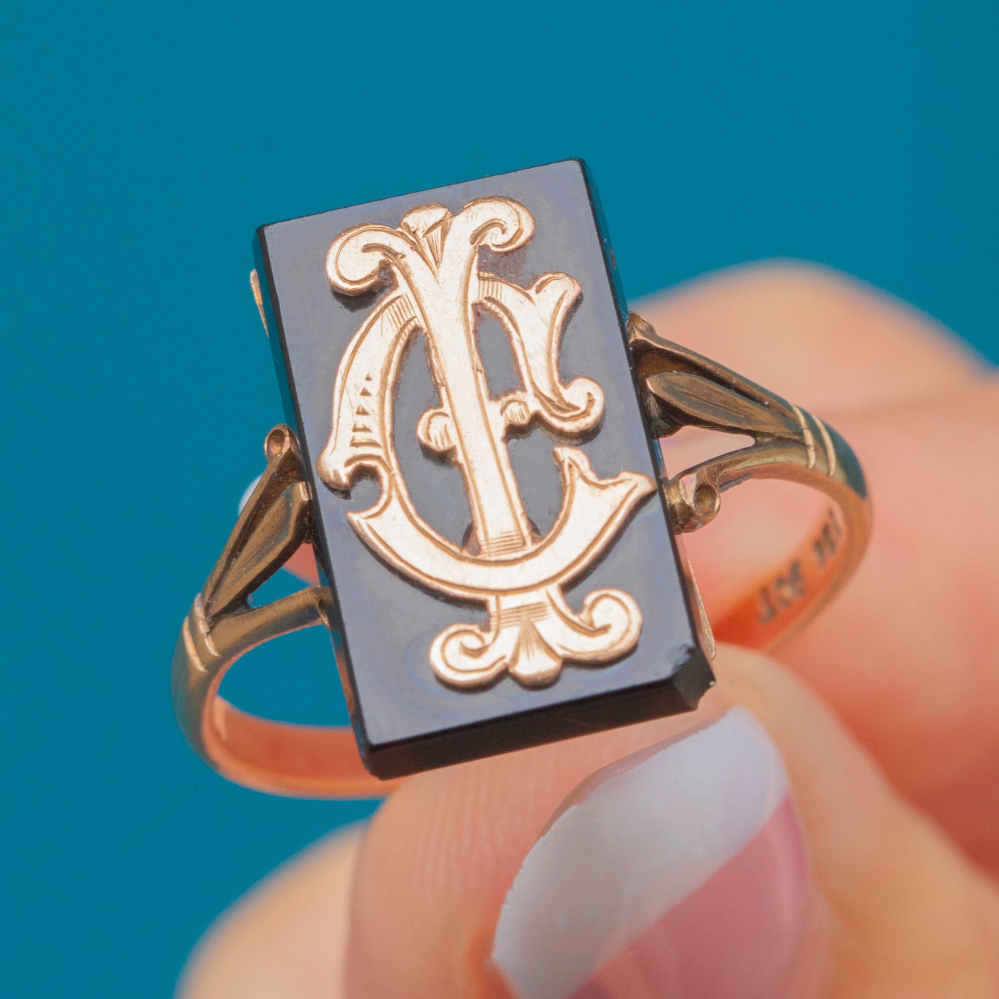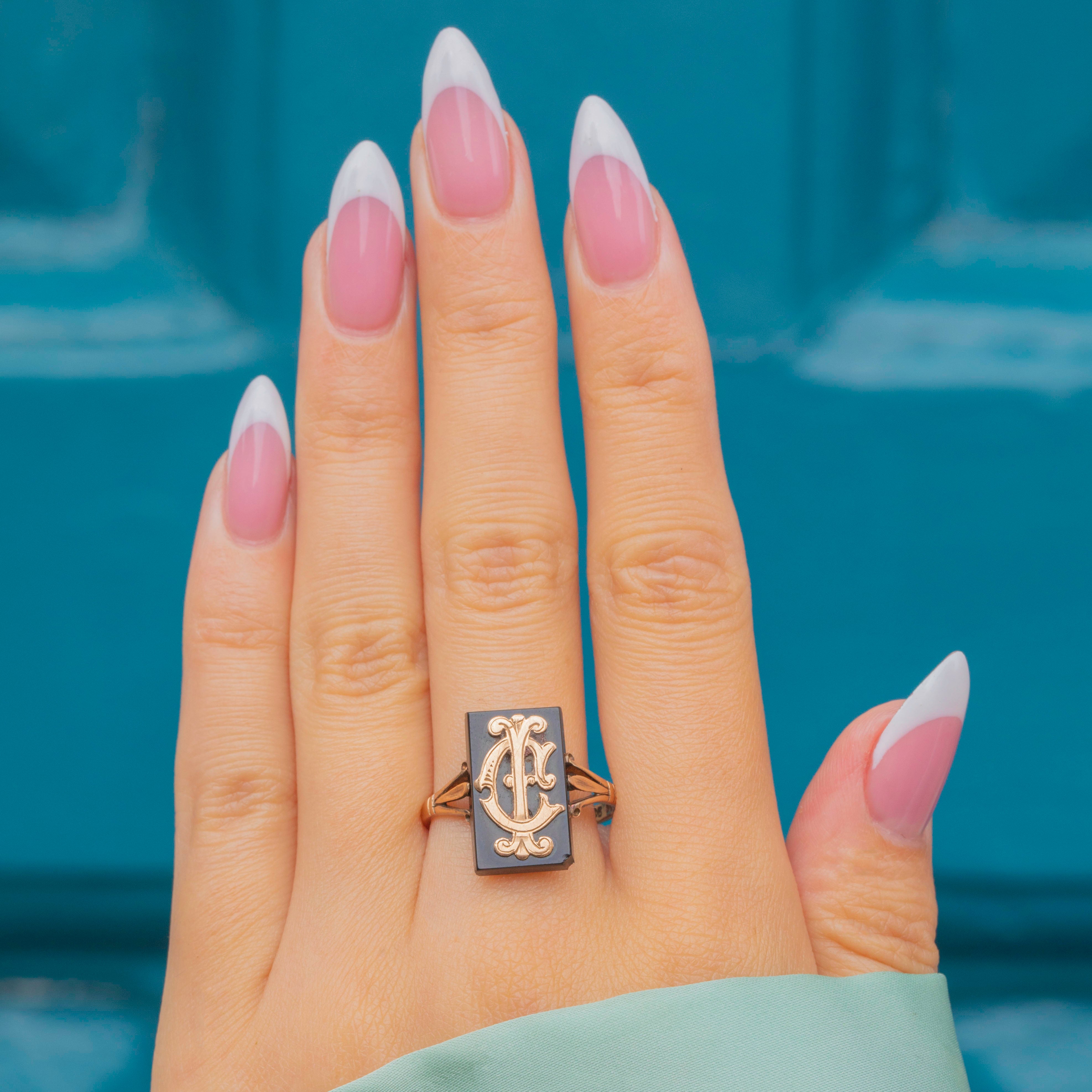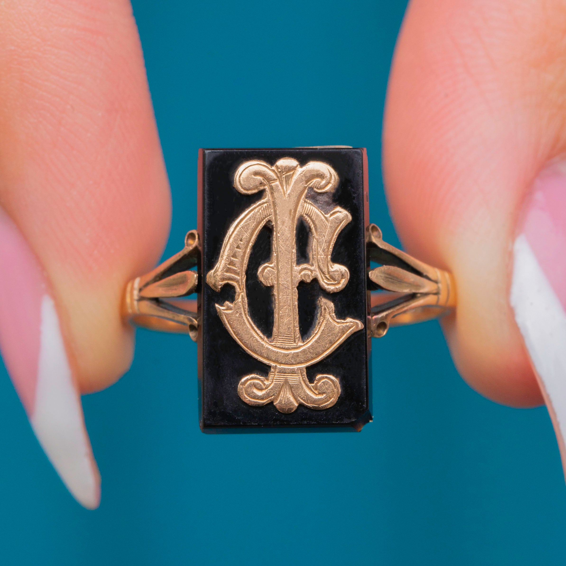 Providing exceptional finger coverage, this antique panel ring is centred by a large, saturated Onyx embellished by an ornate 'C' initial in 9ct Gold.