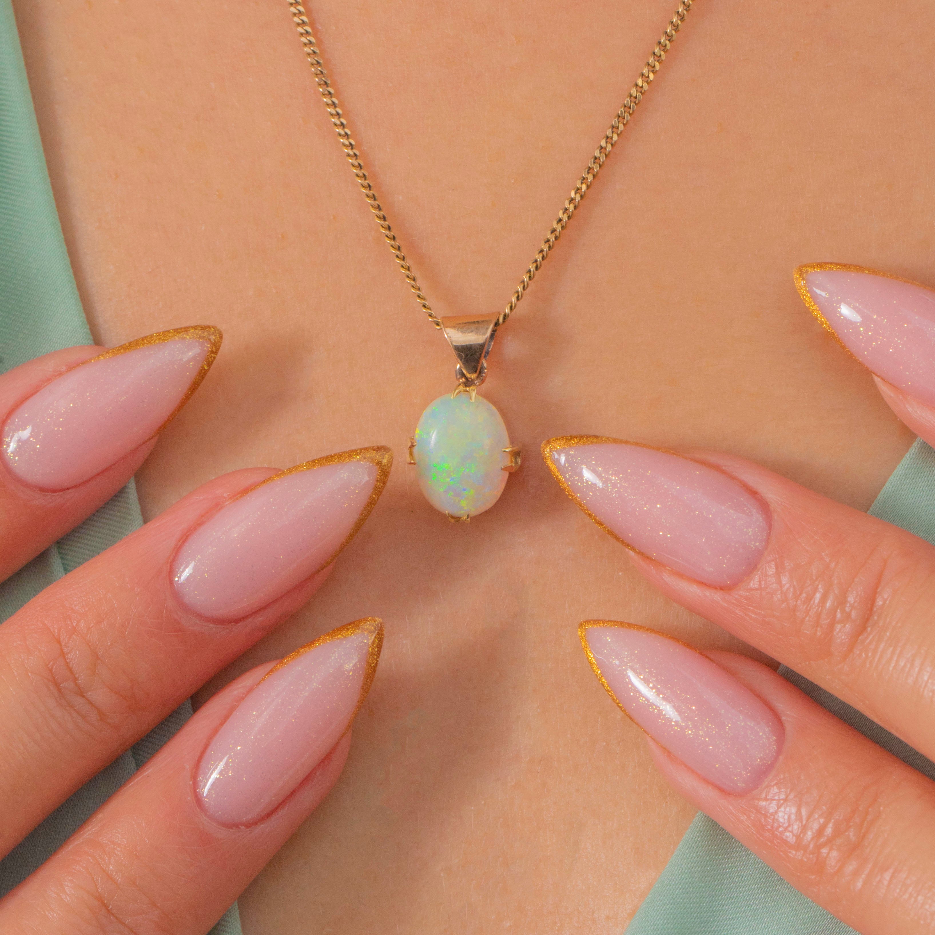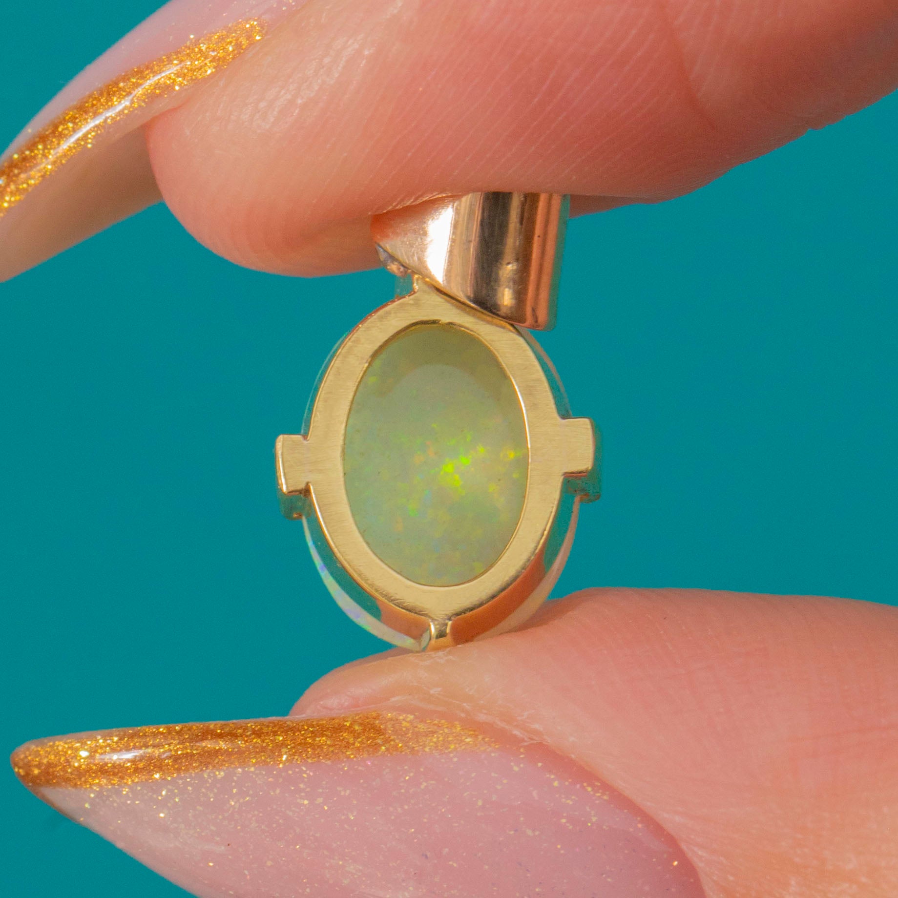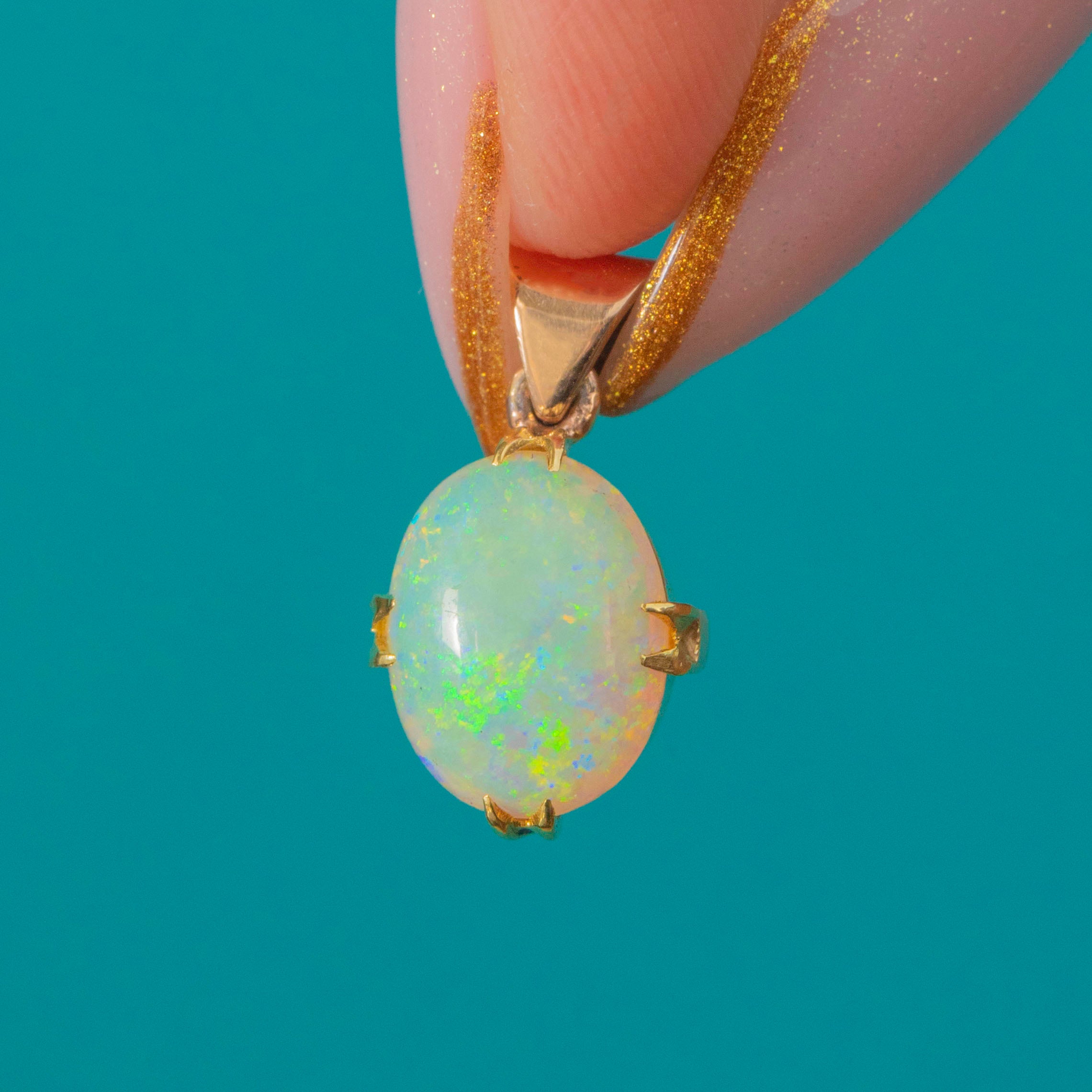 A wonderfully lively Art Deco Opal charm from the 1920s, set with a natural solid Opal cabochon radiating a kaleidoscope of colour. The Opal displays vivid flashes of green, indigo, orange and yellow against a delicate light body tone — a gemstone full of character and life.