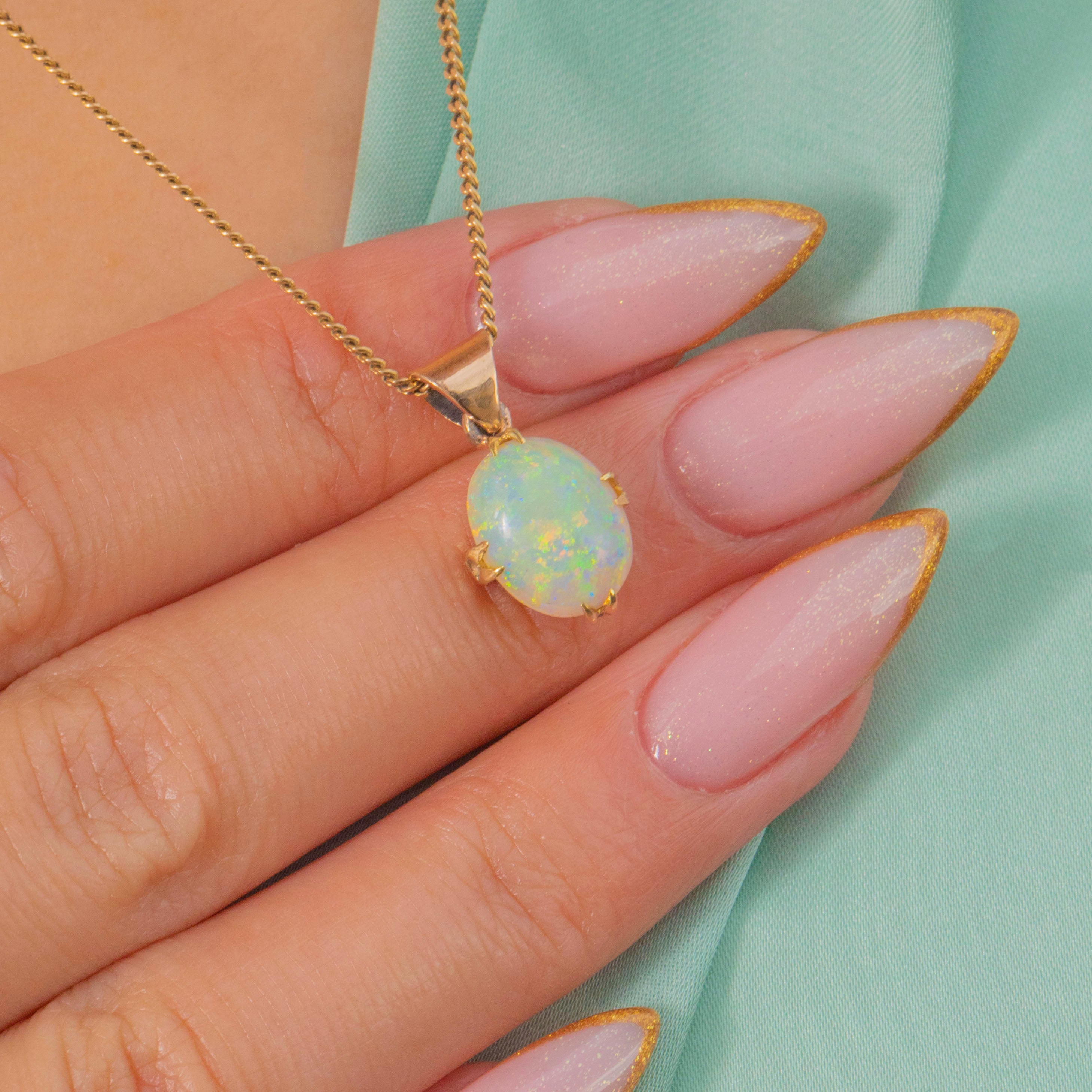EXCELLENT: The Opal is bright and secure with superb play-of-colour across the surface. The 9ct Gold setting is crisp and well-made, with double claws holding the stone firmly in place.