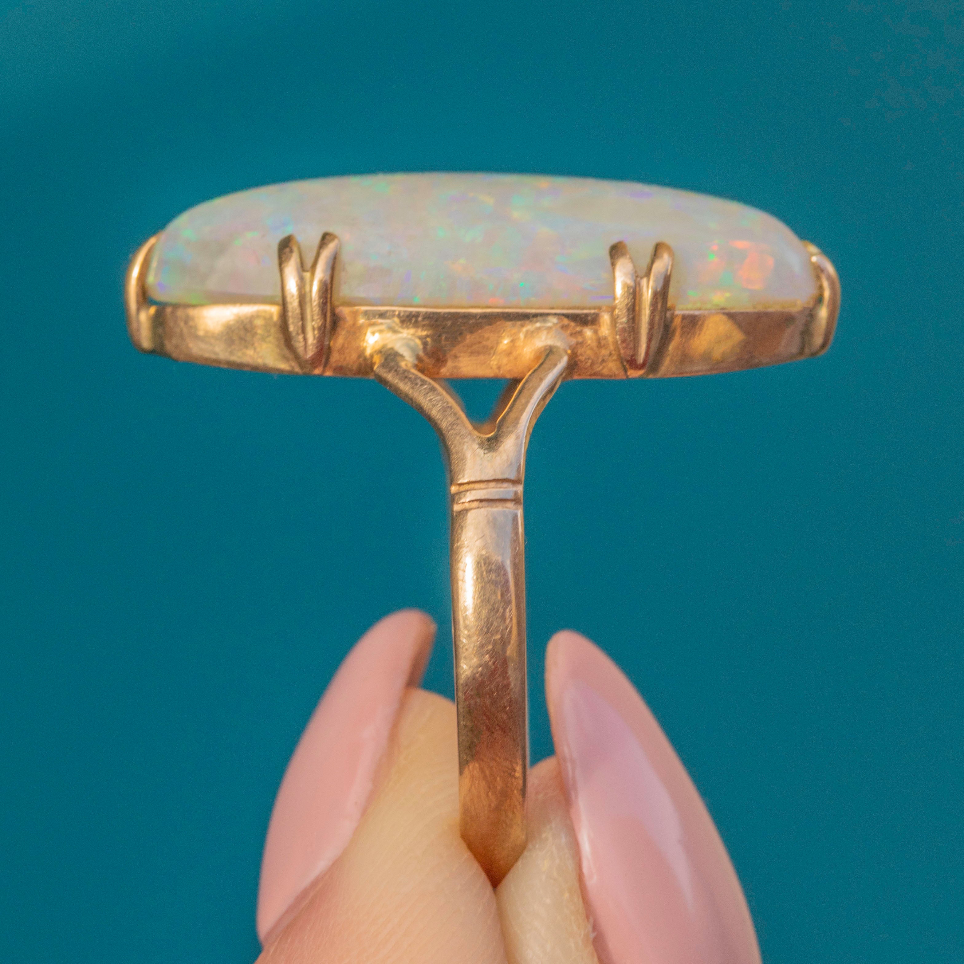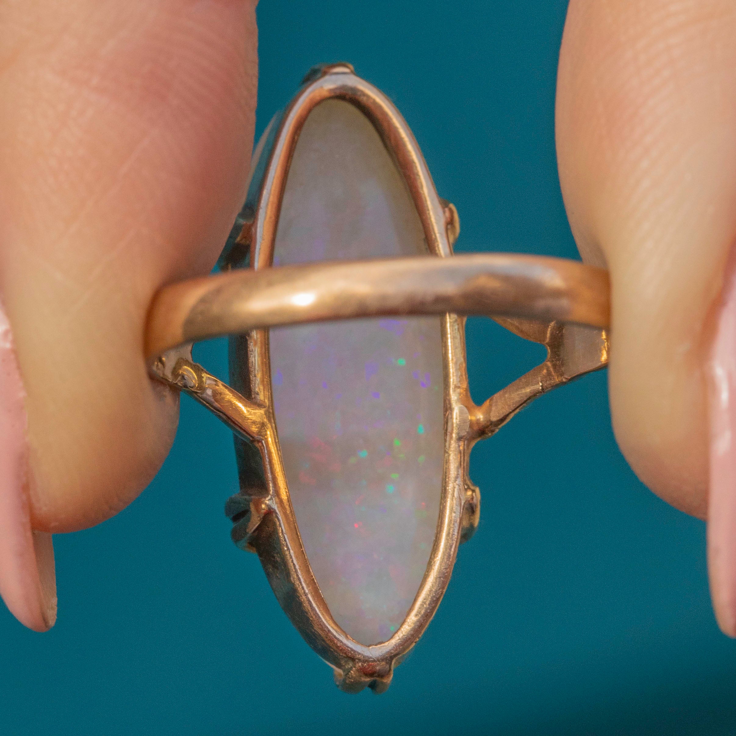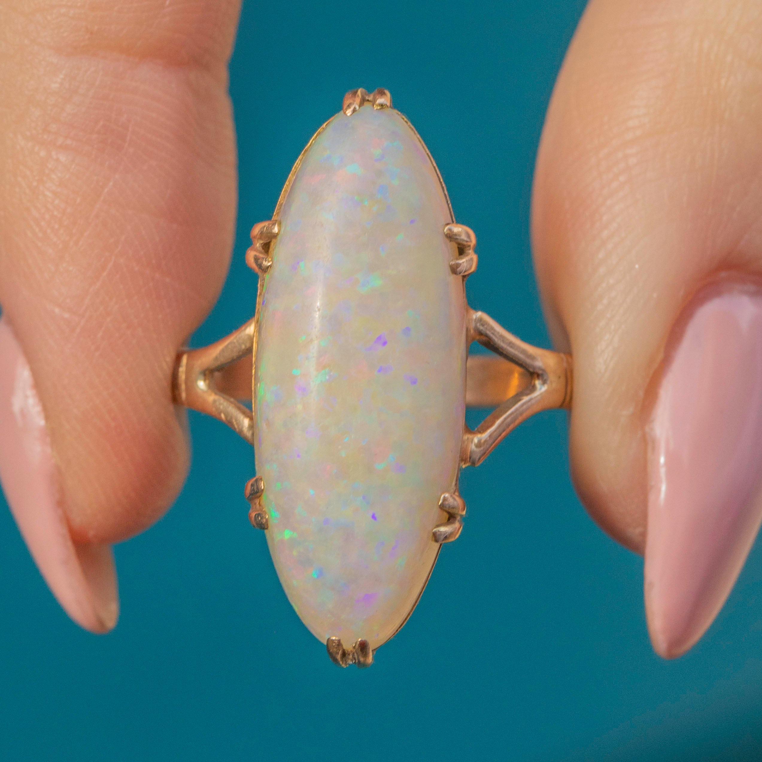 Add a touch of drama to your outfit with this outstanding Art Deco 9ct Gold Opal cabochon dress ring! The impressive 4.20ct Opal bursts with flashes of neon green, electric blue, and pops of pink and yellow from its milky core as its smooth surface catches the light.