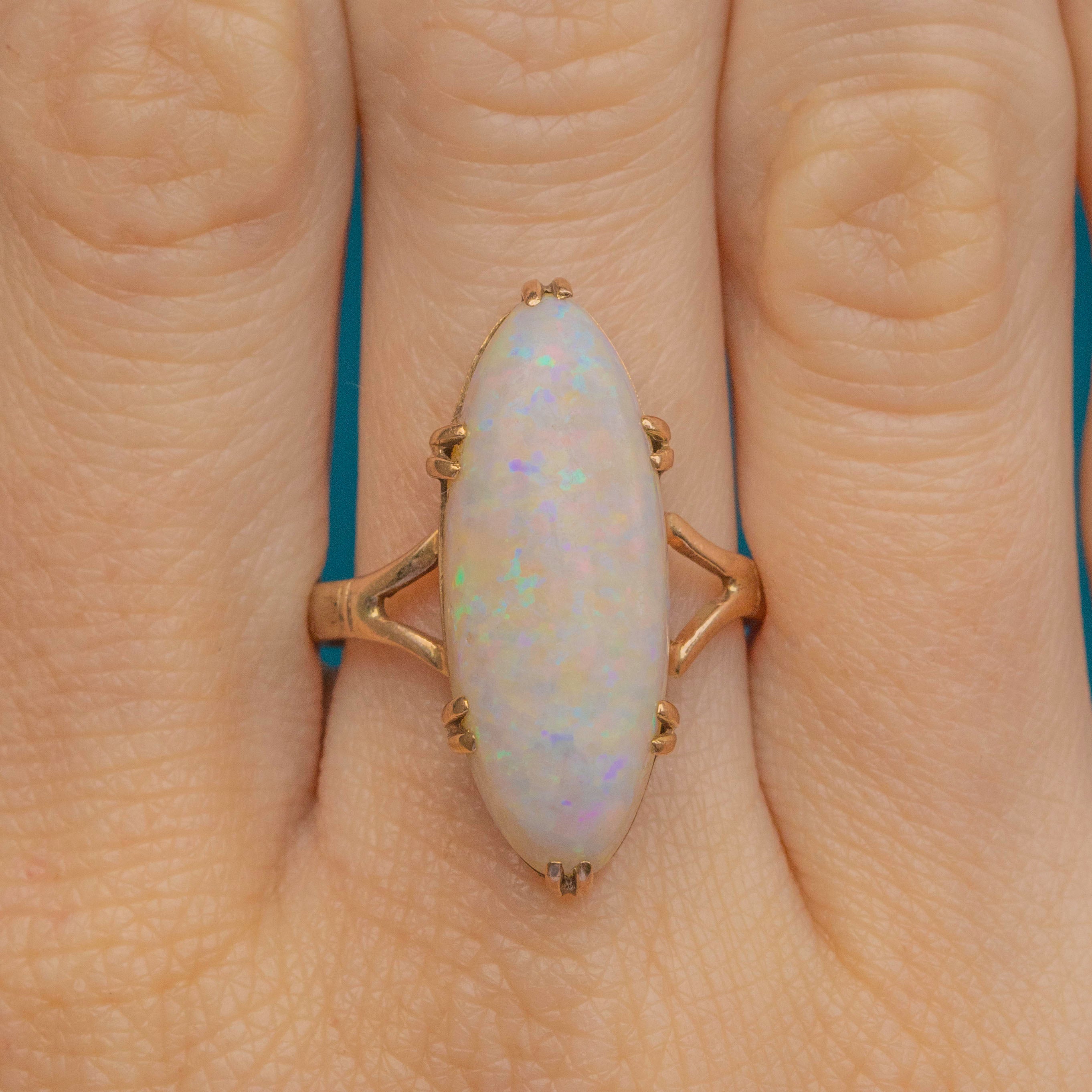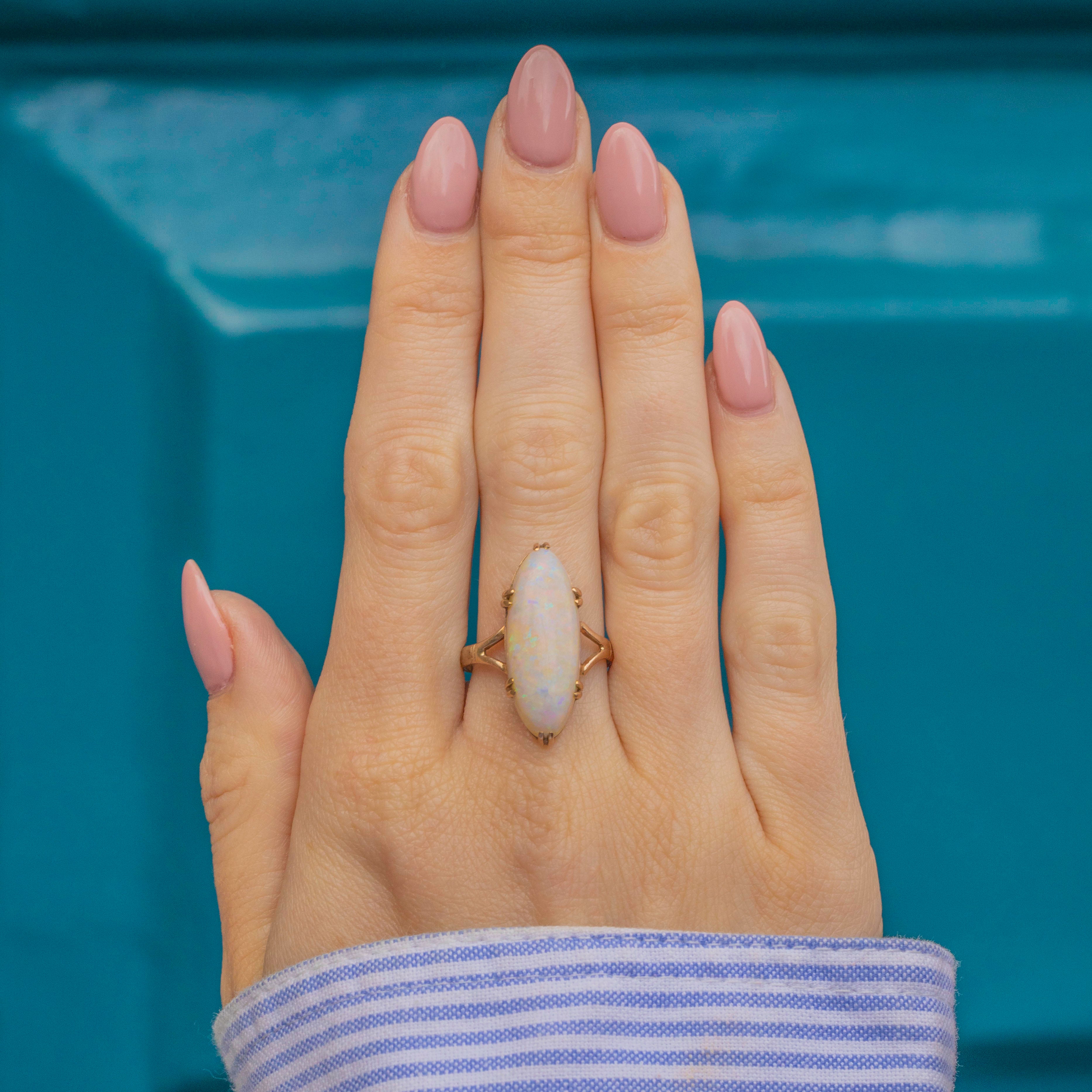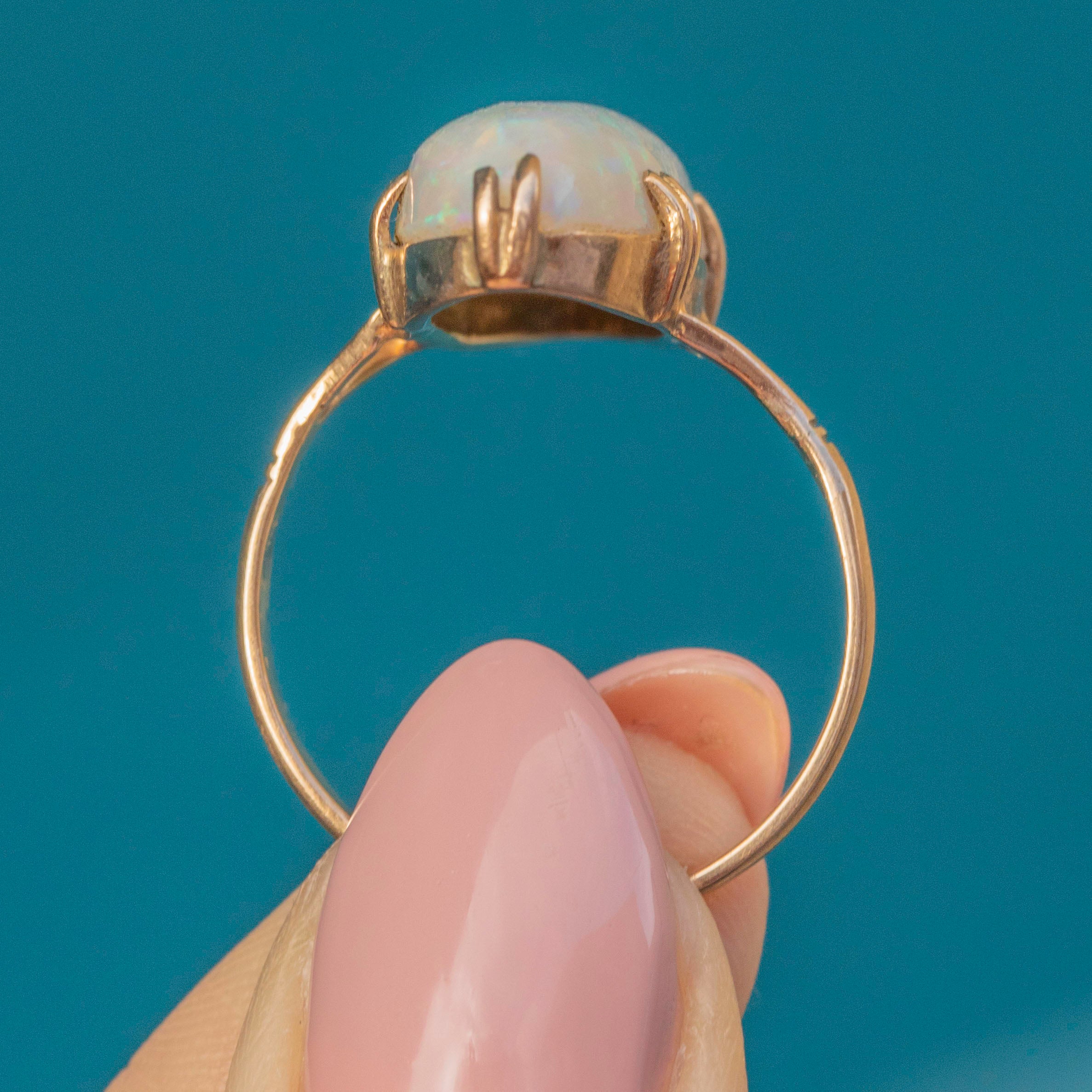 Add a touch of drama to your outfit with this outstanding Art Deco 9ct Gold Opal cabochon dress ring! The impressive 4.20ct Opal bursts with flashes of neon green, electric blue, and pops of pink and yellow from its milky core as its smooth surface catches the light.