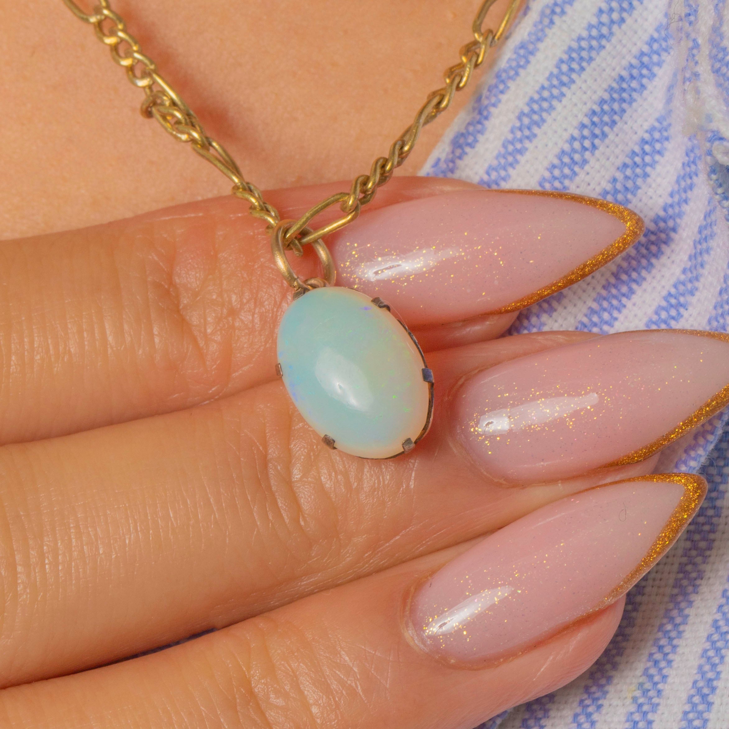 This dreamy Art Deco Opal charm is alive with colour and light. The natural solid 2.11ct Opal shimmers with enchanting hues of pink, green and turquoise, glowing softly in every movement.