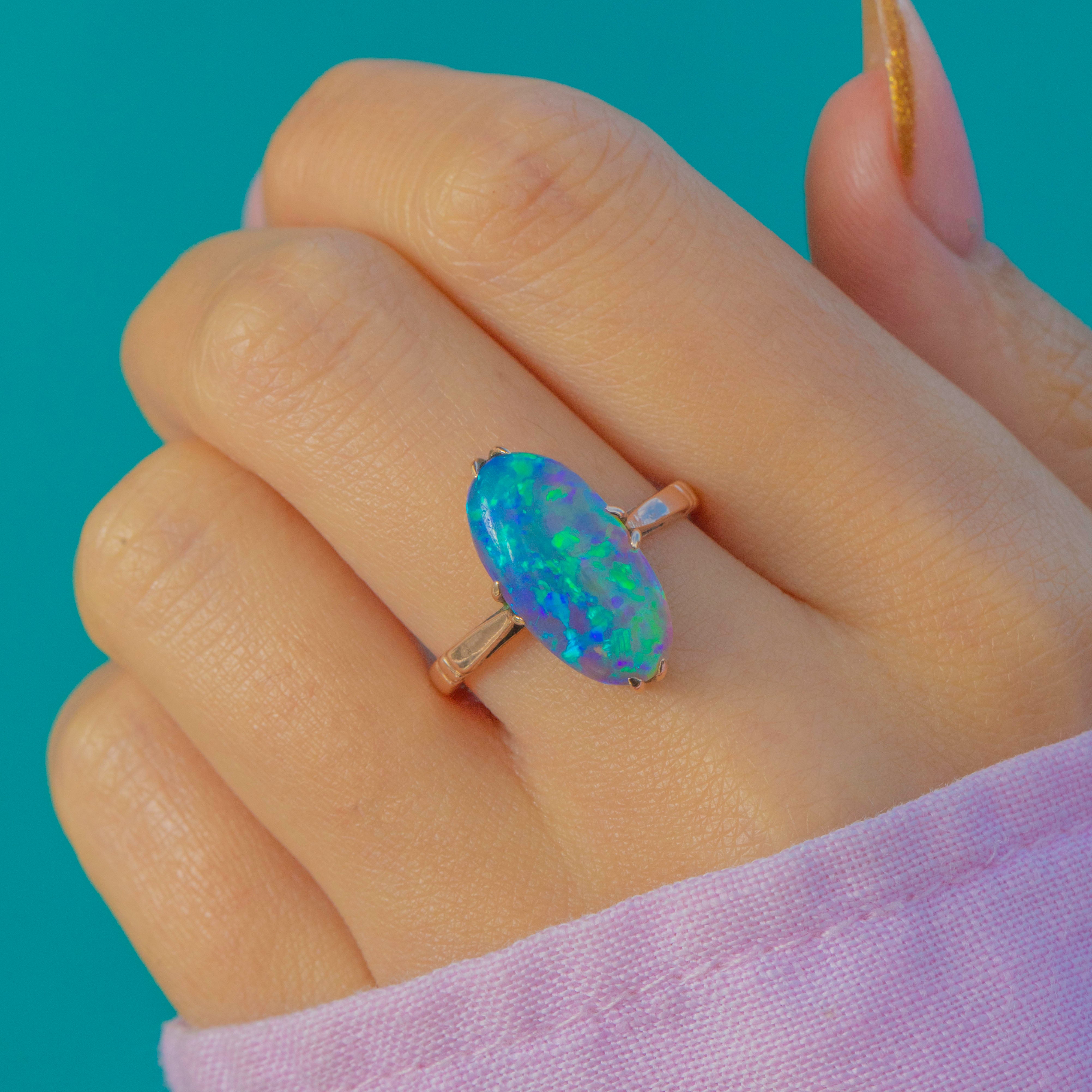 This elongated cabochon displays exceptional blue-green play-of-colour with vibrant flashes of neon green, teal and thunder-cloud purple, creating an atmospheric, moody gemstone with beautiful finger coverage.