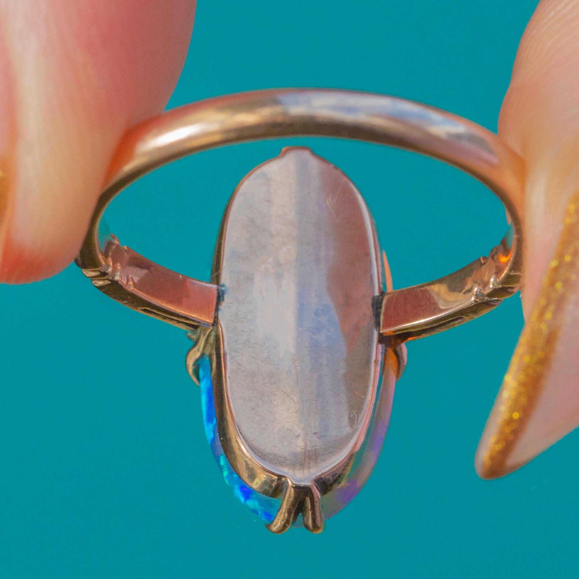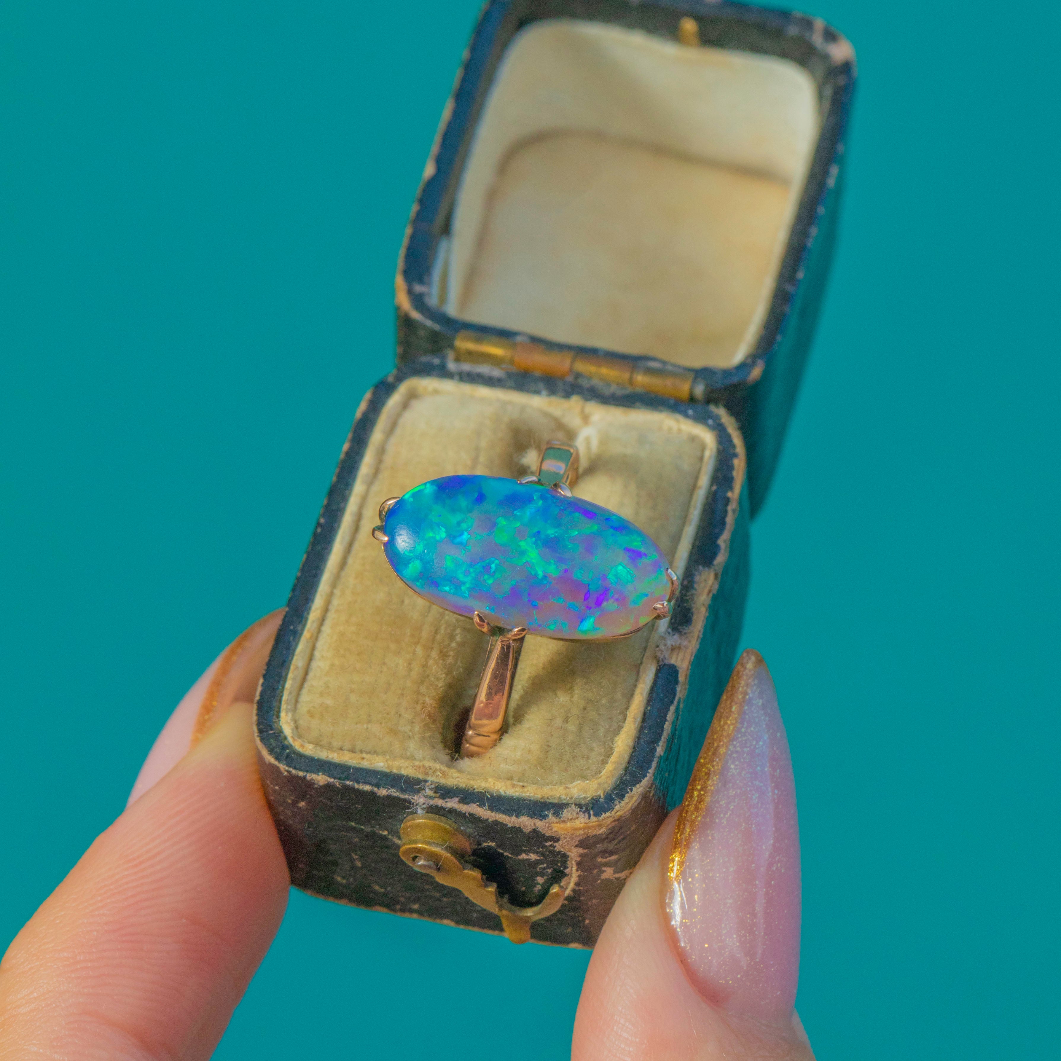 A striking Art Deco Opal solitaire ring dating to the 1920s, crafted in warm 9ct Gold and set with a dramatic natural solid Opal of approximately 2.75cts.