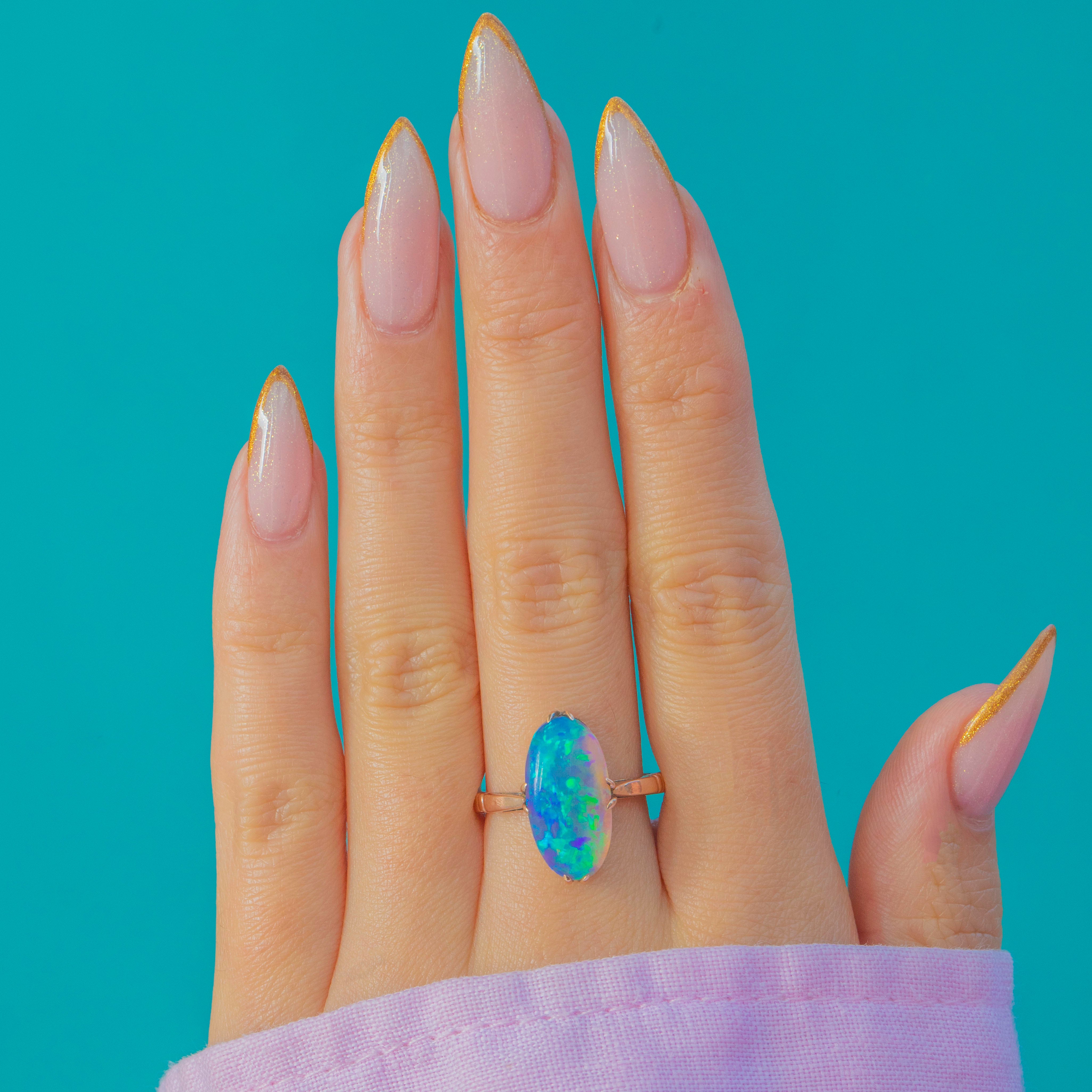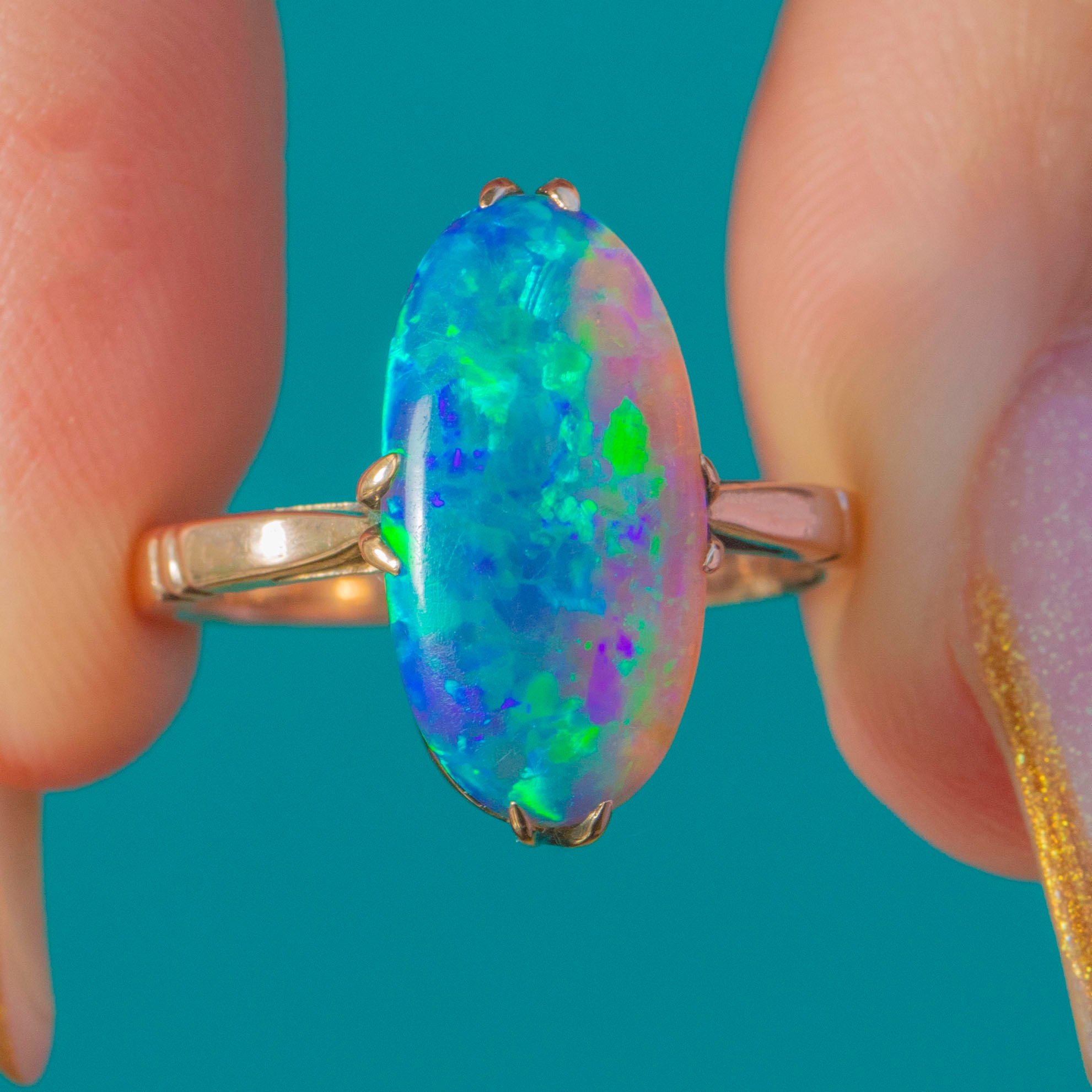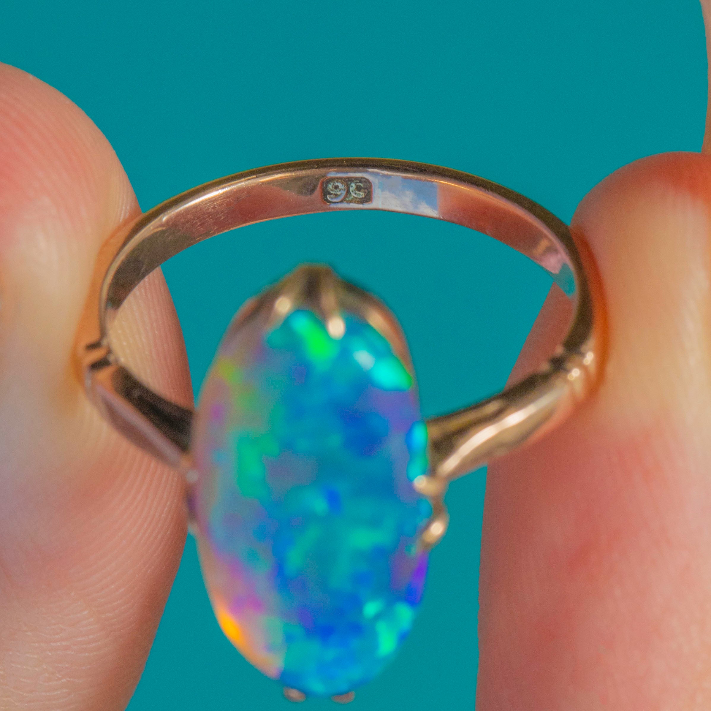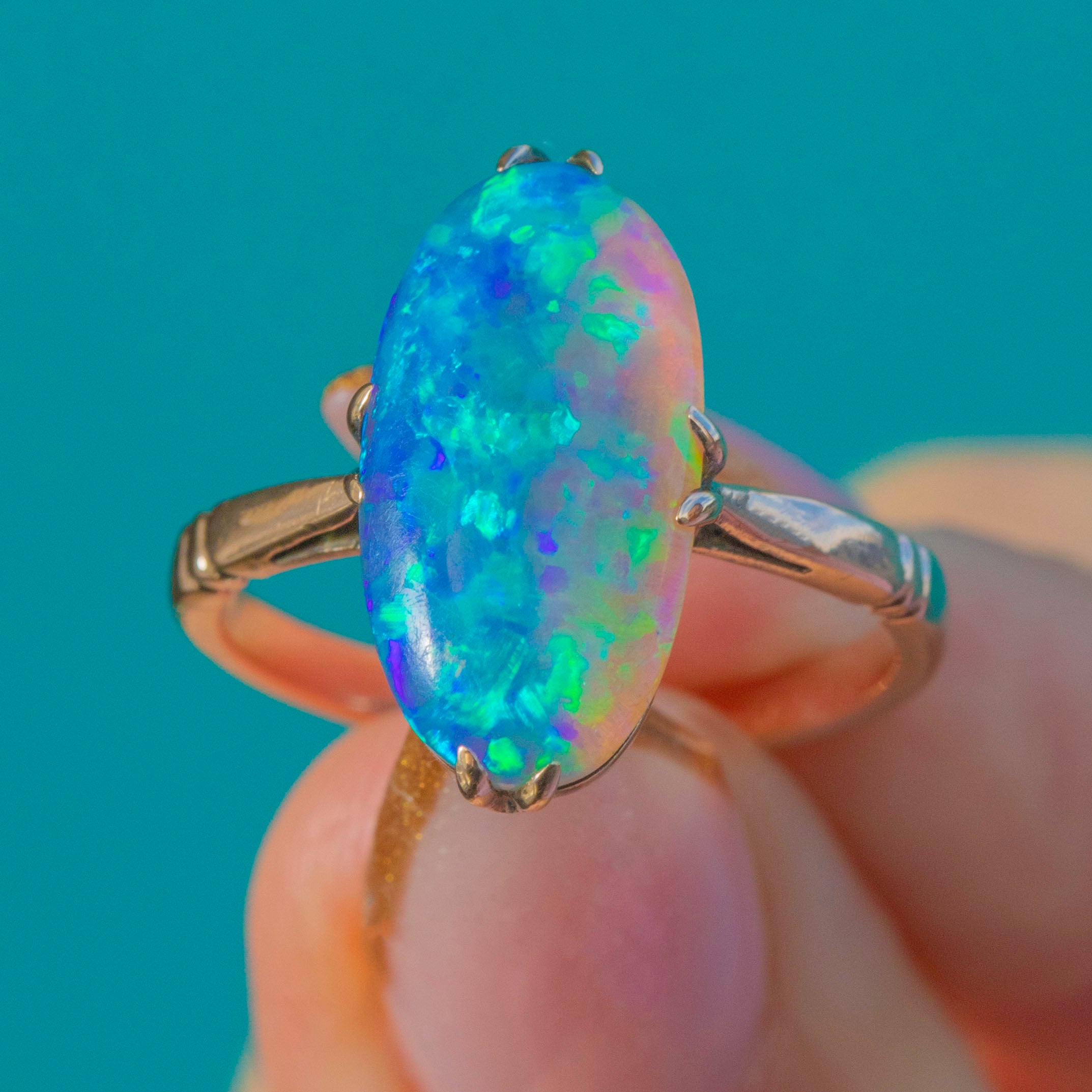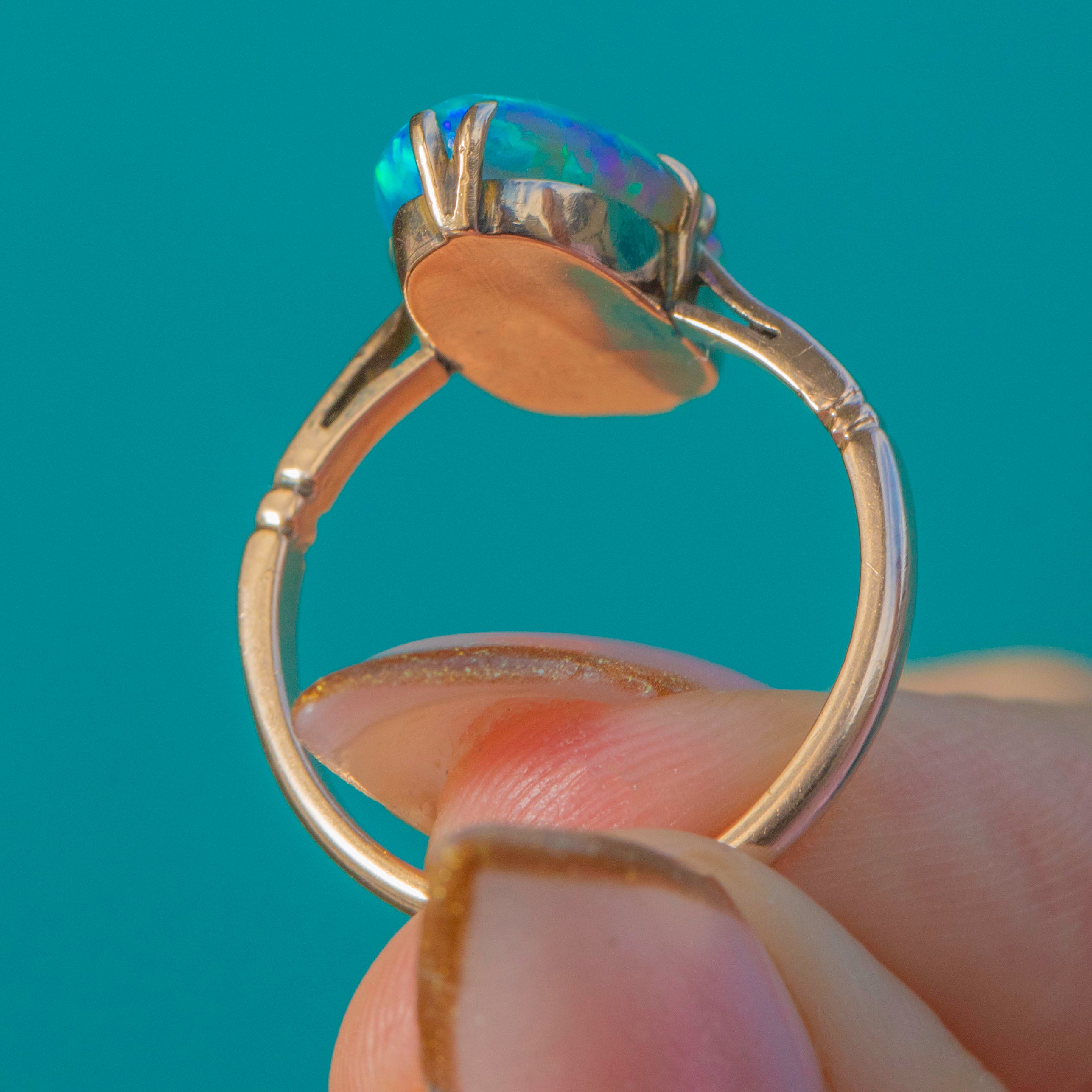 VERY GOOD-EXCELLENT: The Opal is smooth, glossy and full of vibrant colour with no chips or cracks. The double-claw setting is secure and well-preserved. The 9ct Gold band shows only light age-consistent wear. A beautifully maintained Art Deco solitaire.