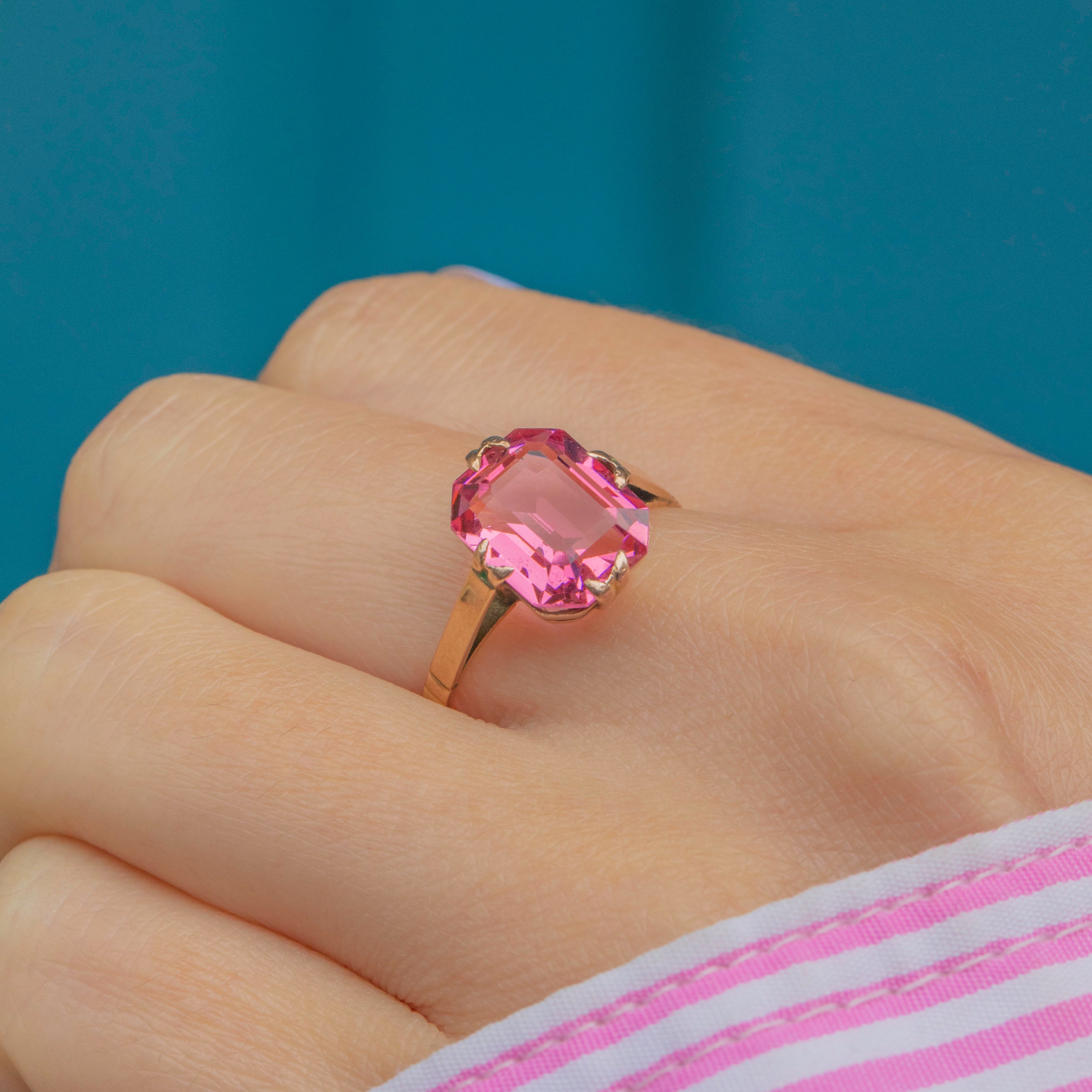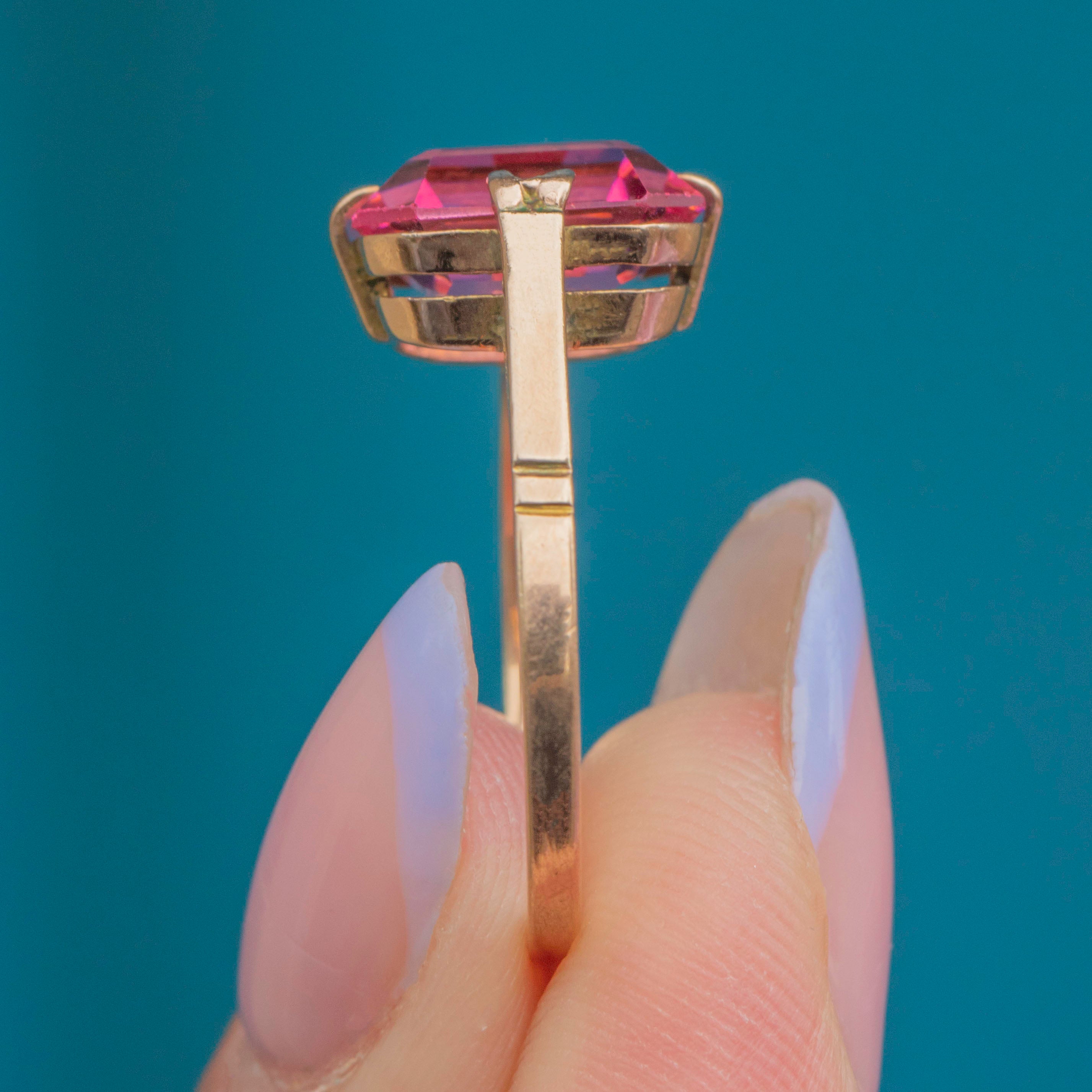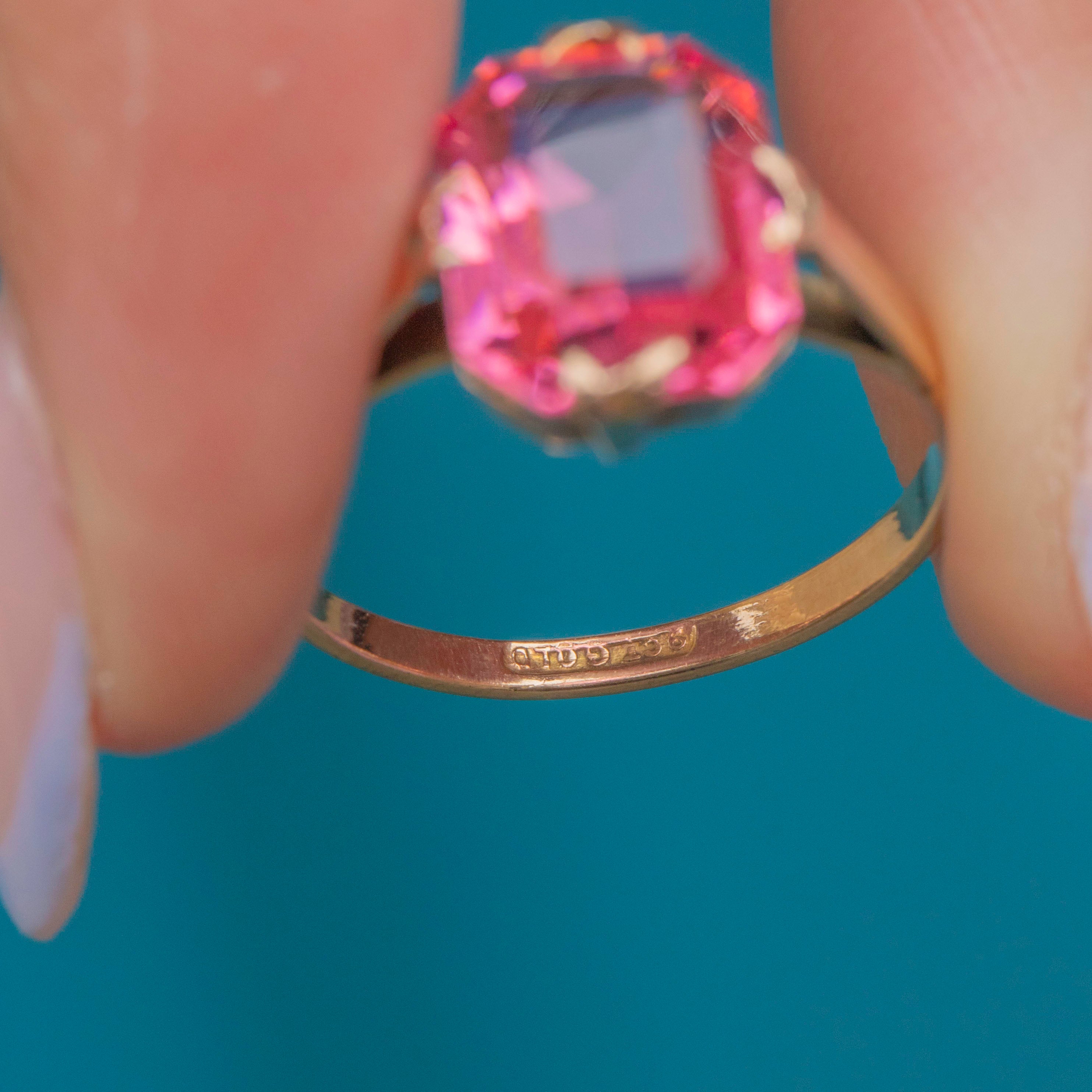 EXCELLENT: This Art Deco 9ct Gold Pink Paste ring is in excellent condition. The Paste is beautifully saturated and securely held in place within her claws. The ring band doesn't appear to have any sign of wear; there is a clear stamp and no visible resize mark!