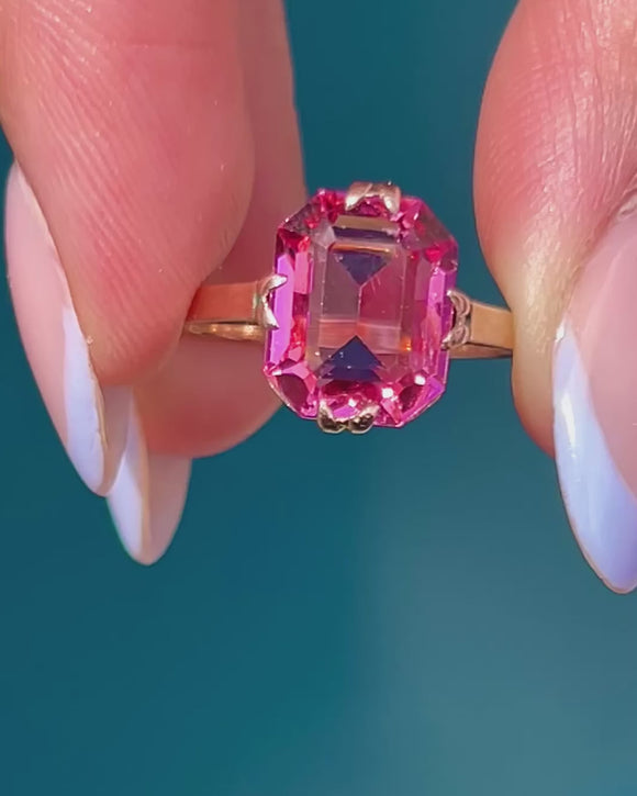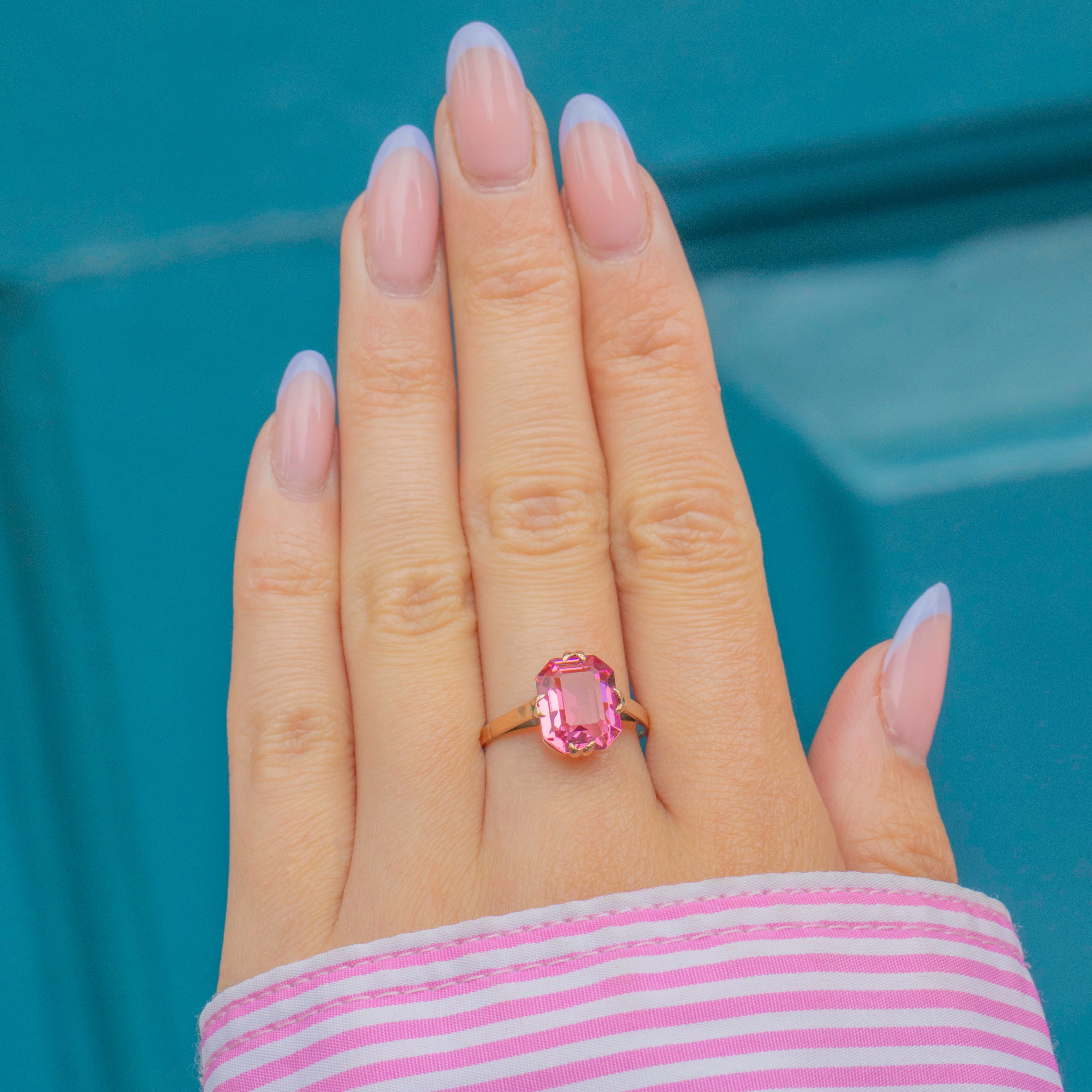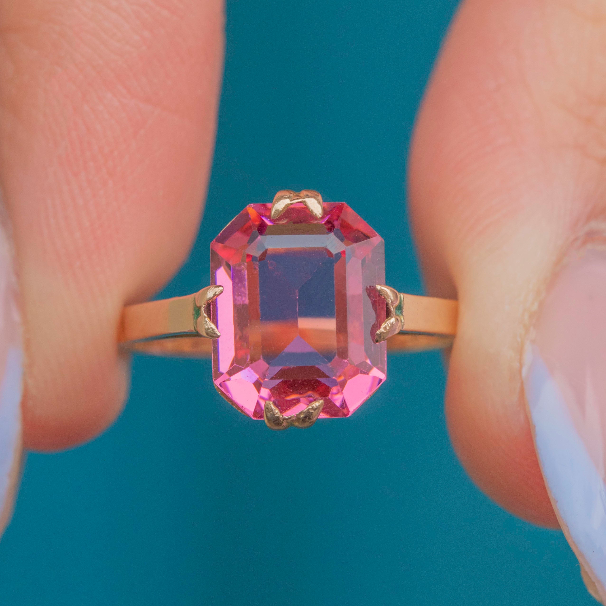 EXCELLENT: This Art Deco 9ct Gold Pink Paste ring is in excellent condition. The Paste is beautifully saturated and securely held in place within her claws. The ring band doesn't appear to have any sign of wear; there is a clear stamp and no visible resize mark!