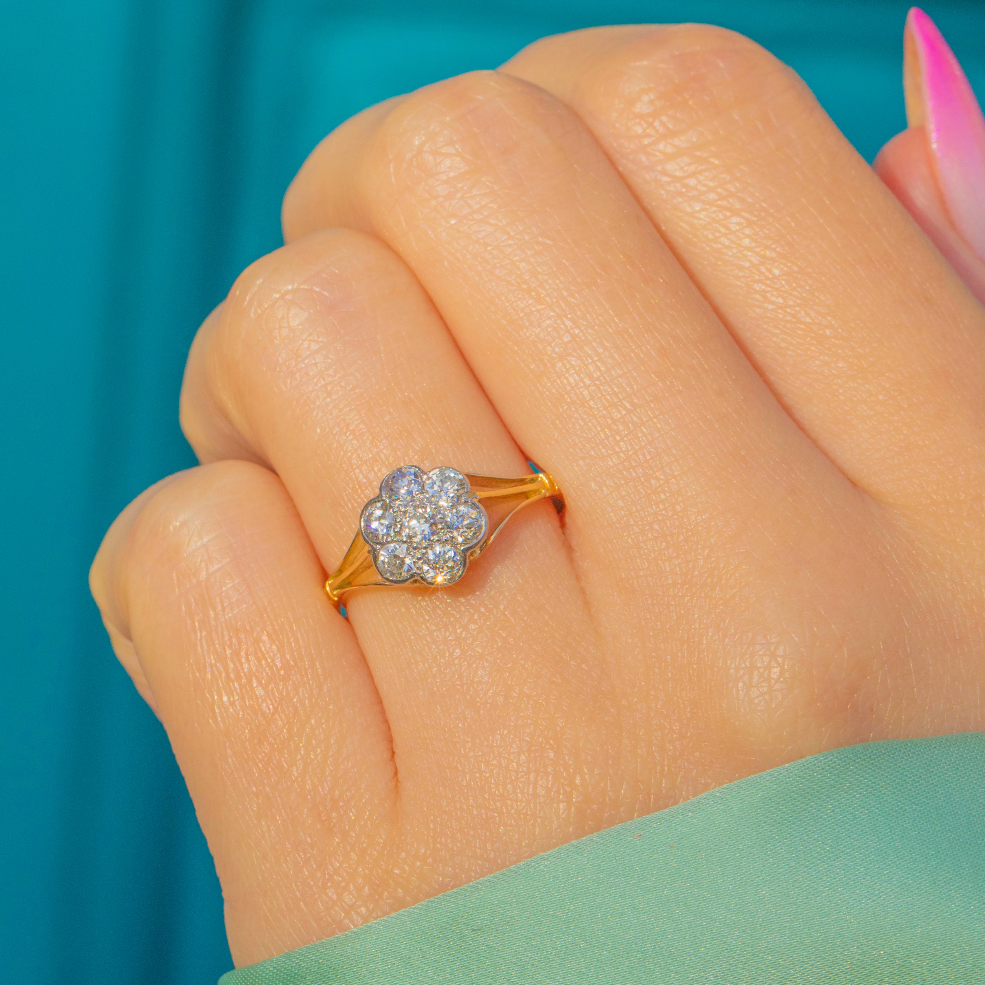 A classic Art Deco Diamond cluster with timeless two-tone elegance, this charming “daisy” ring features seven lively round Diamonds arranged in a floral head. The Platinum-topped, scalloped collet is delicately pierced beneath, lending airy light play and refined sparkle against the warm 9ct Gold shank with gently split, tapered shoulders.