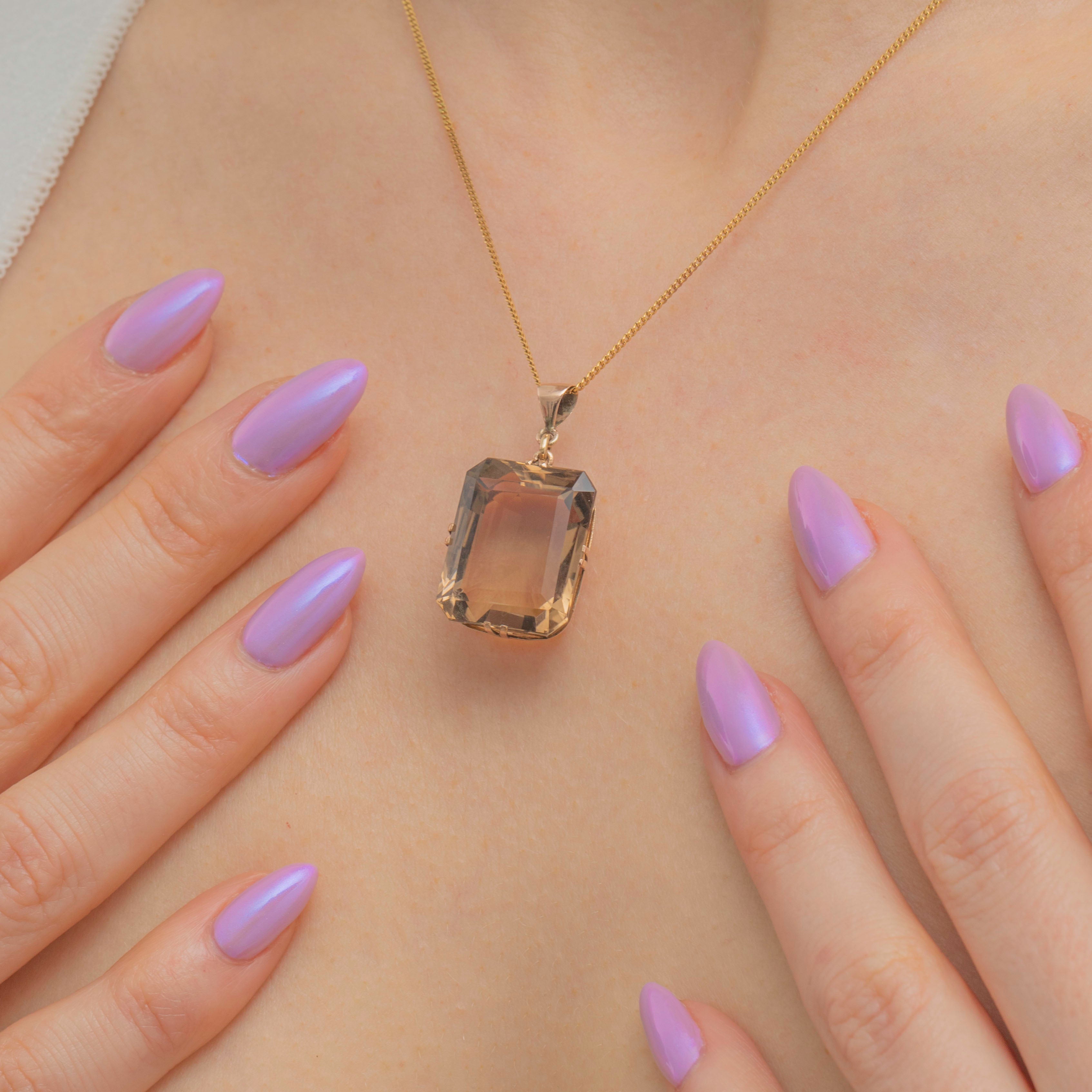 This Art Deco 9ct Gold Smokey Quartz pendant will provide a rich look of elegance for any occasion! Boasting an unmissable 30.00ct Smokey Quartz displaying deep chocolate brown hues, this antique Smokey Quartz pendant is simply delicious.