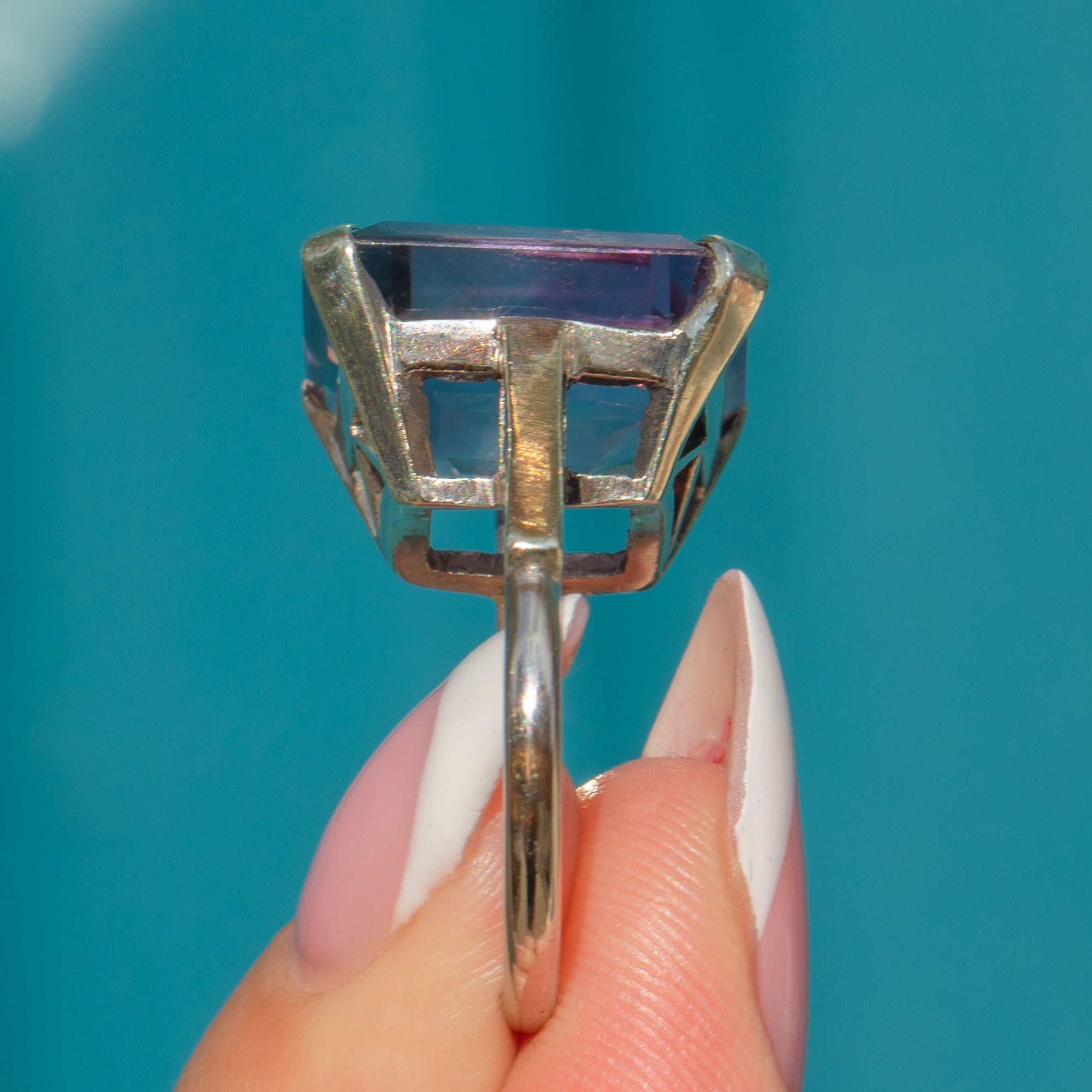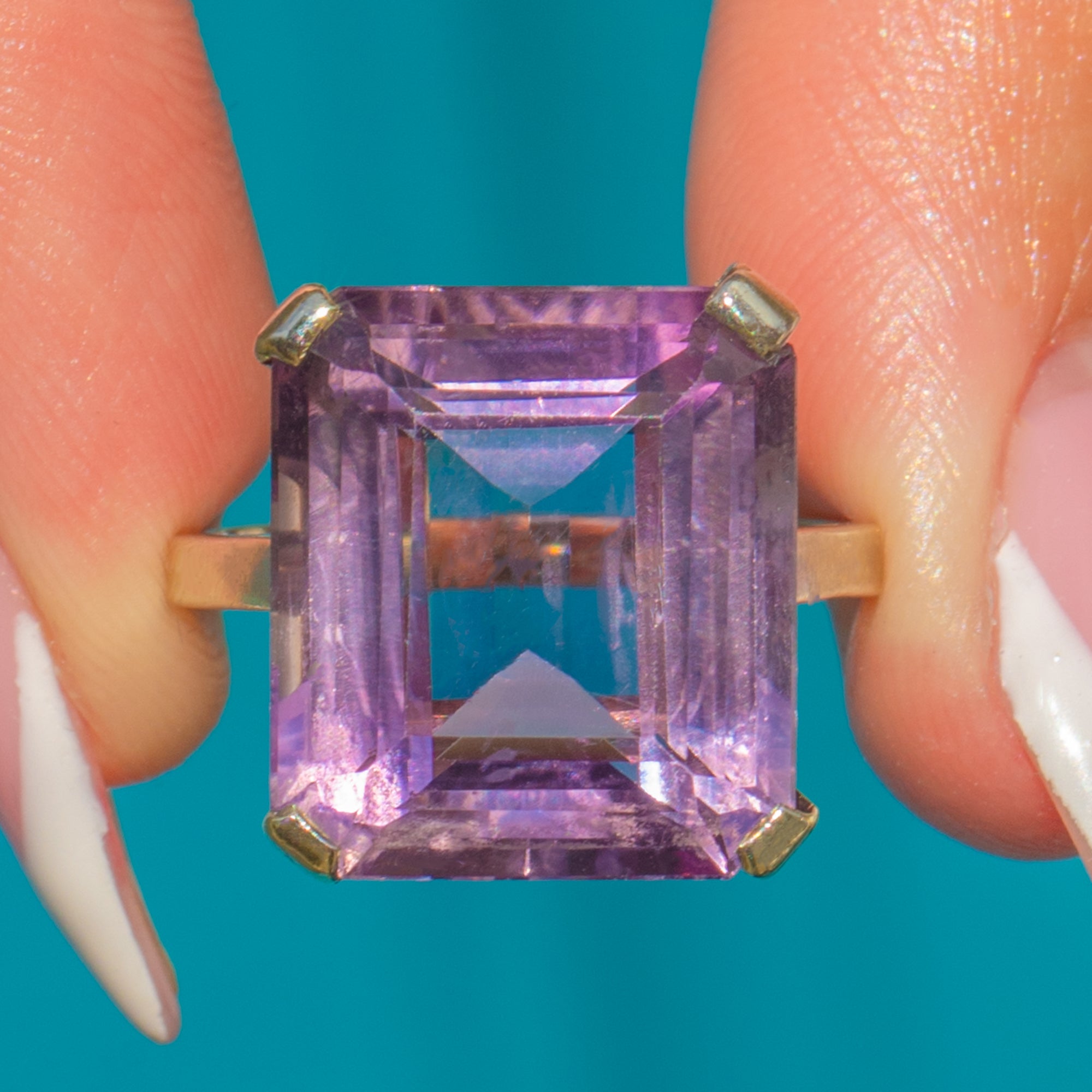 This striking Art Deco cocktail ring features a bold emerald-cut Amethyst measuring an impressive 15.7 x 14mm and weighing approximately 3.75cts. Its vibrant purple hue and precise geometric facets are perfectly complemented by the clean lines of the White 9ct Gold setting.