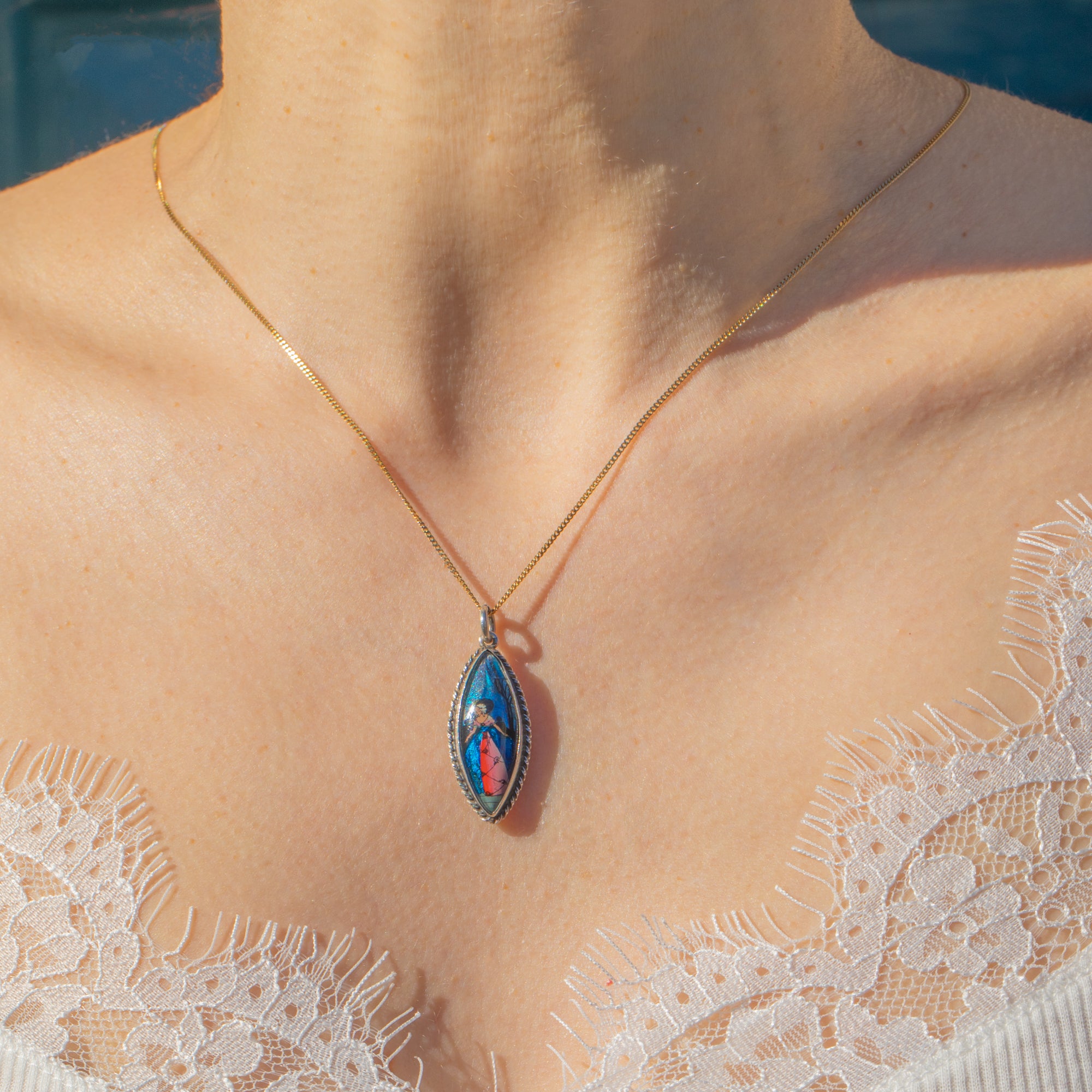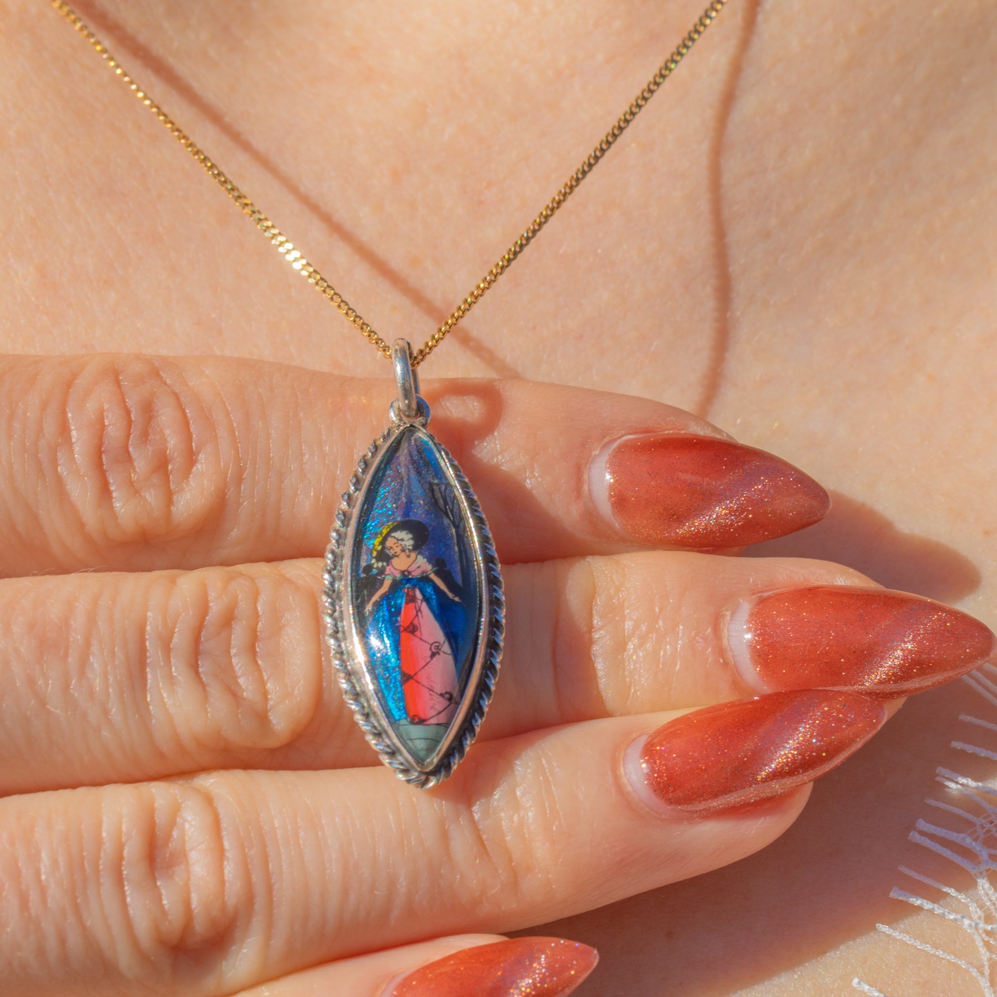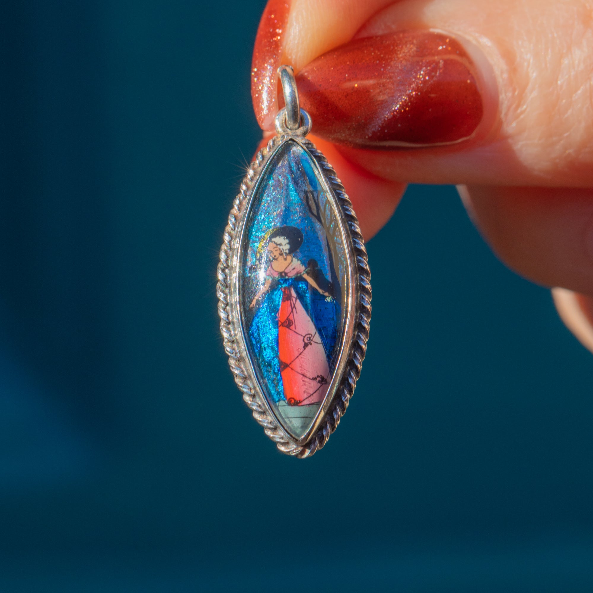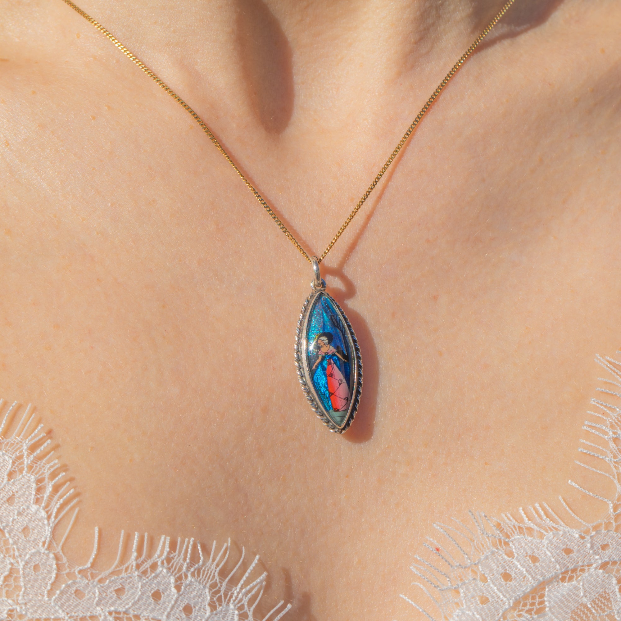 The wing has been intricately hand-painted with a crinoline lady, whose distinguished silhouette and vibrant colours enhance the intriguing and feminine allure of this exquisitely crafted piece. This is a unique example of Art Deco butterfly wing jewellery that will catch the eye of any onlooker!
