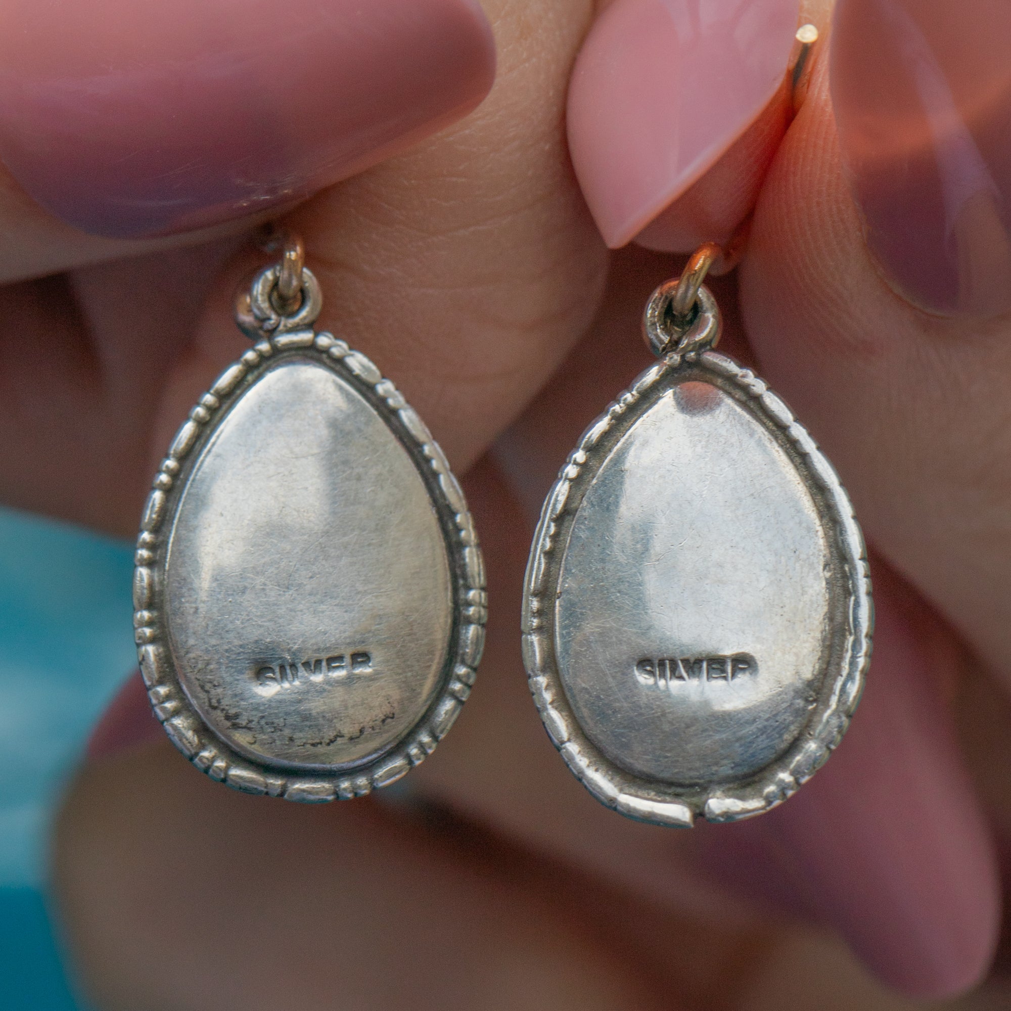 VERY GOOD. These Art Deco Butterfly Wing earrings are in very good condition. The Butterfly Wings are both pristine, carefully preserved for over a century, with vibrant sky blue hues. The Silver is bright and has accrued a light patina creating a dramatic finish. Under close inspection, there is some minor age-related wear, including a hairline split on the bottom of one earring and some light wear on the back, but this won't be noticeable while the earrings are worn. With slender and securely affixed hooks, you can wear these Deco delights confidently!