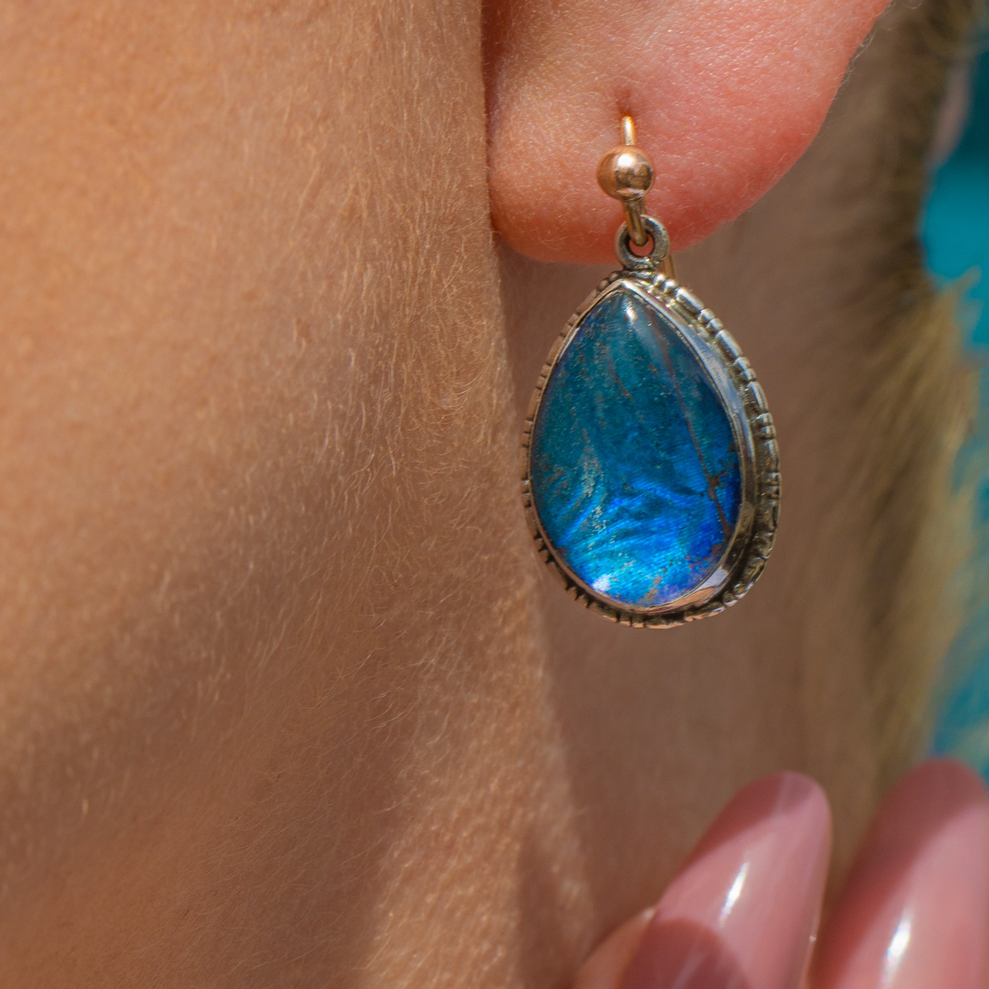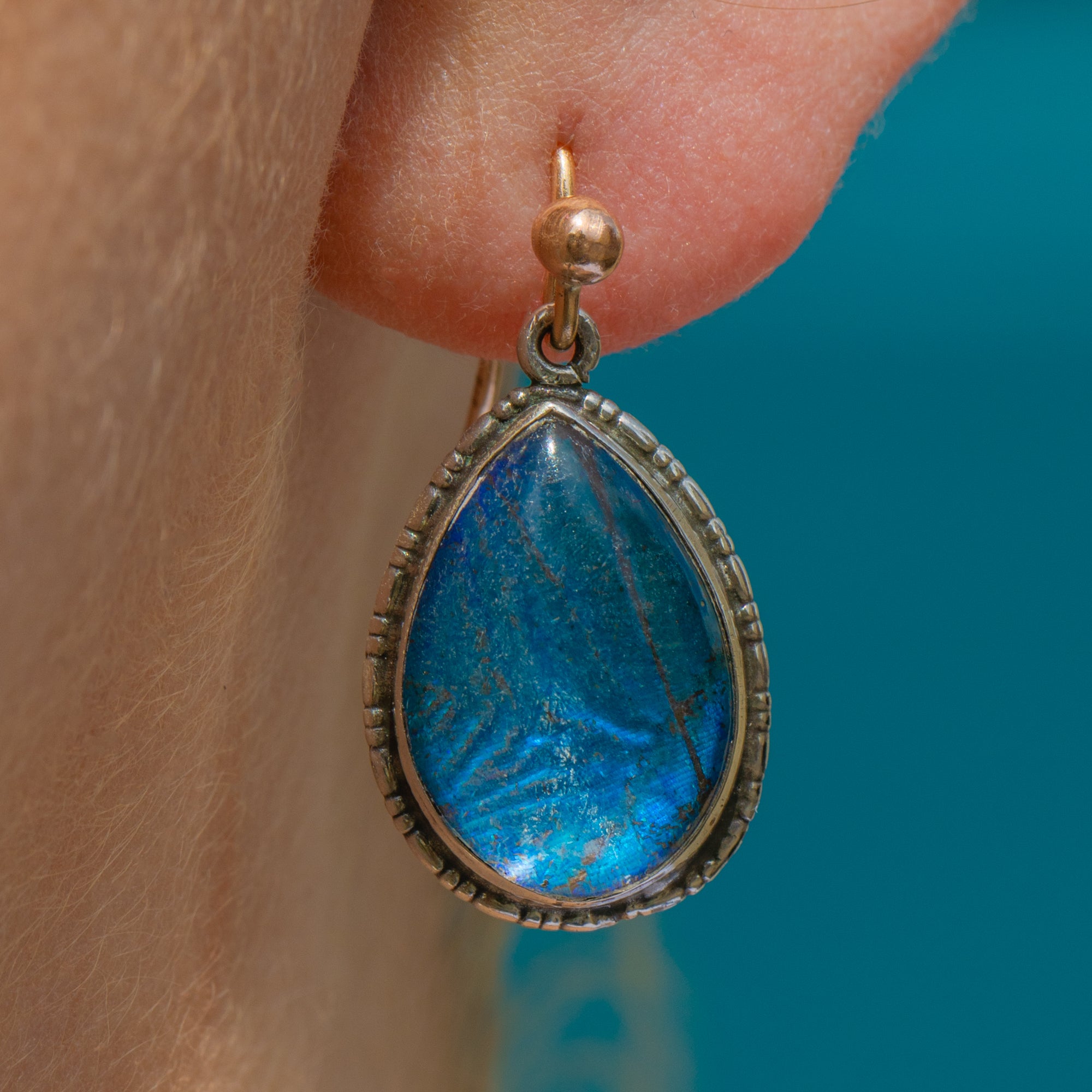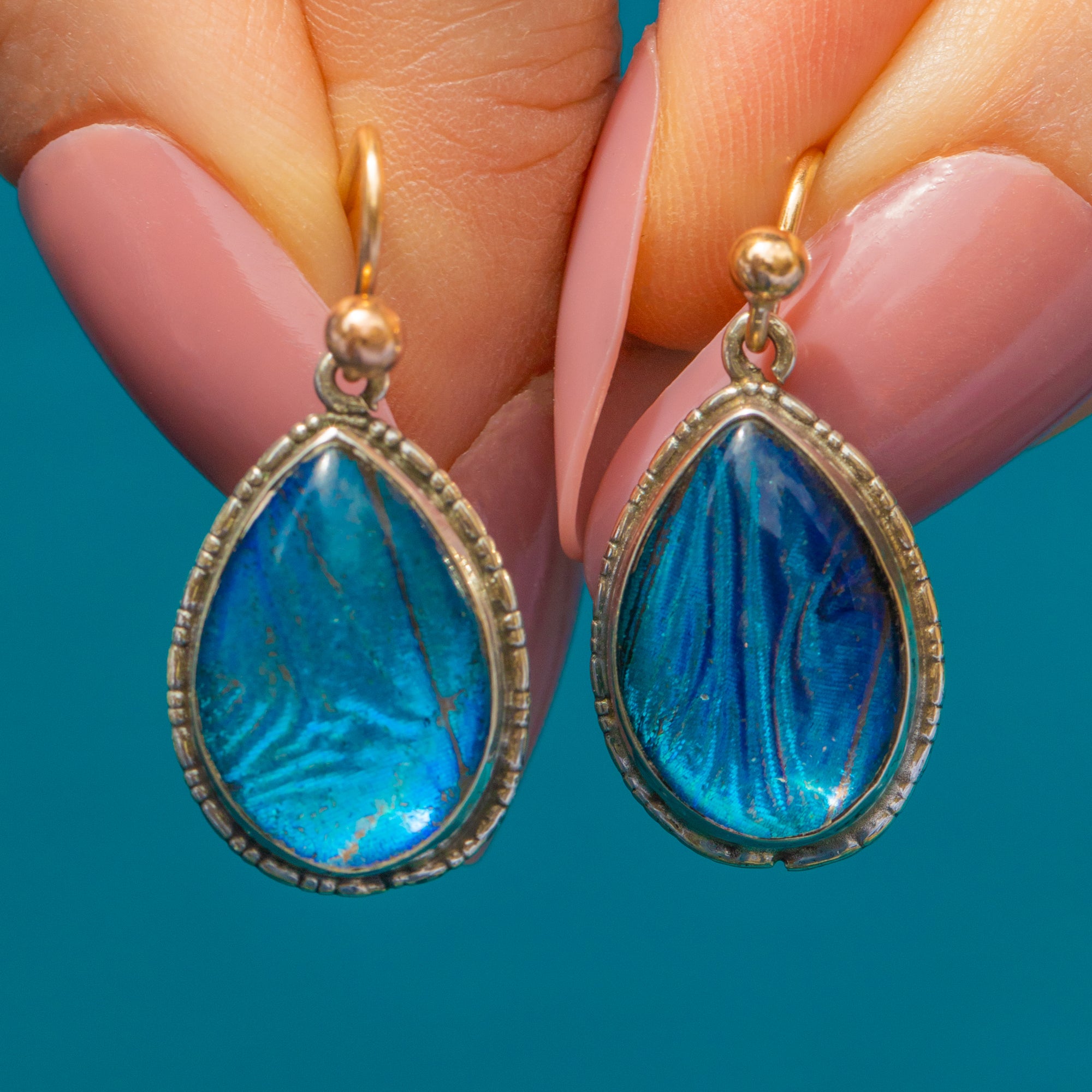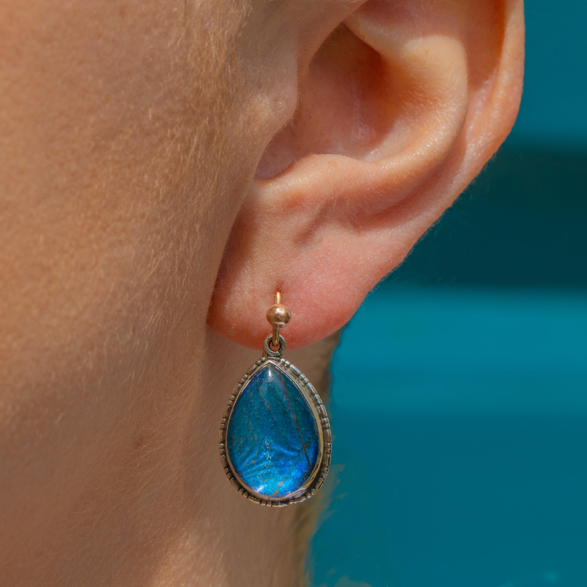 Add a vibrant pop of colour to your collection with these striking Art Deco Butterfly Wing earrings! Thriving in all lighting conditions, each Morpho wing has been carefully preserved and displays electric blue shimmers as they dance below your lobes.
