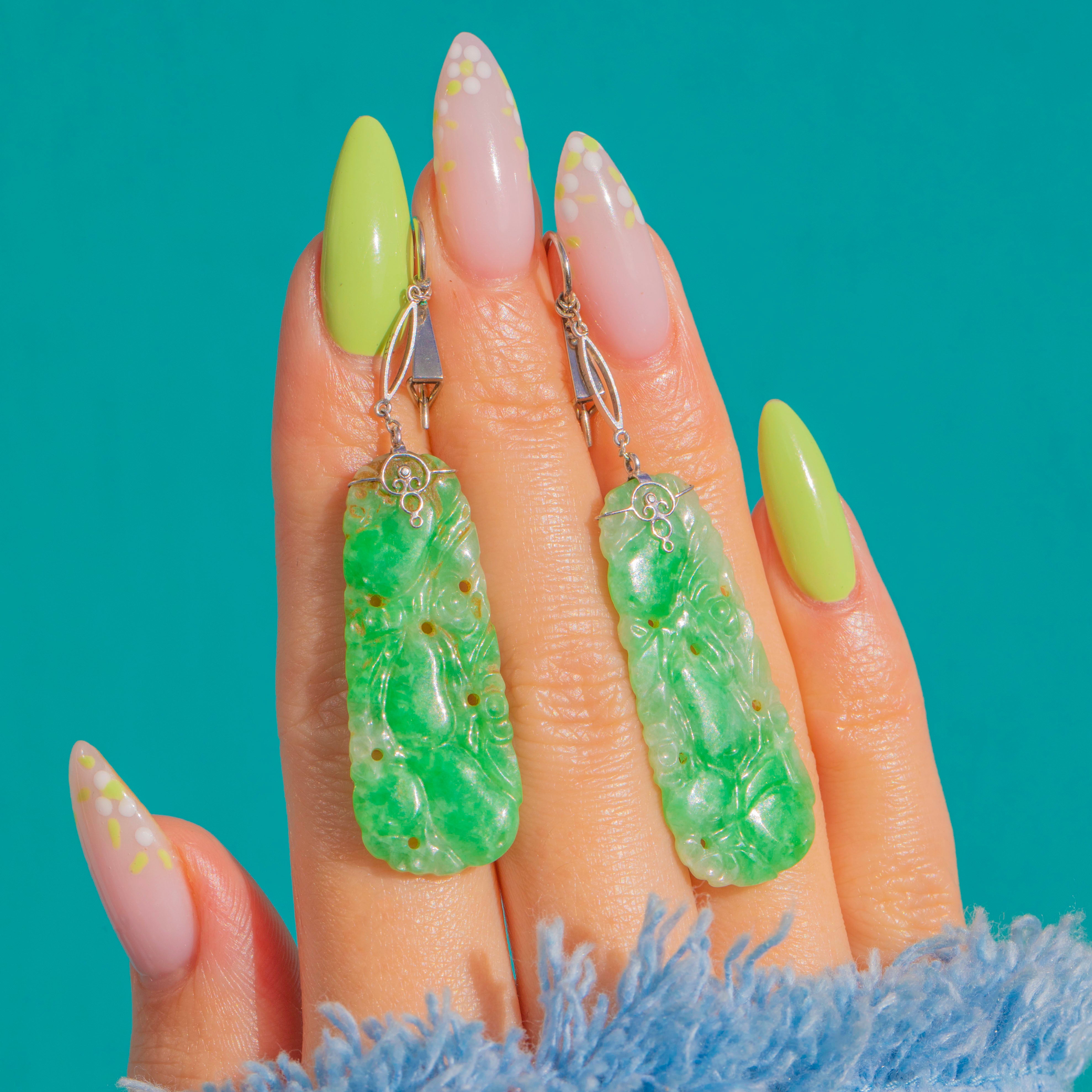 カーヴィングが施されたジェダイト(翡翠)のデュエットが、Art Deco ドロップイヤリングとして、みずみずしいグリーンの透明感と、繊細な植物モチーフのレリーフ彫刻で魅了します。エレガントなプレートは内側から柔らかく輝き、天然の雲模様や色調のニュアンスが奥行きと静謐なガラスのような美しさを添えています。洗練された9ctホワイトゴールドの金具により優雅に揺れ、彫刻的な存在感を放ちます。