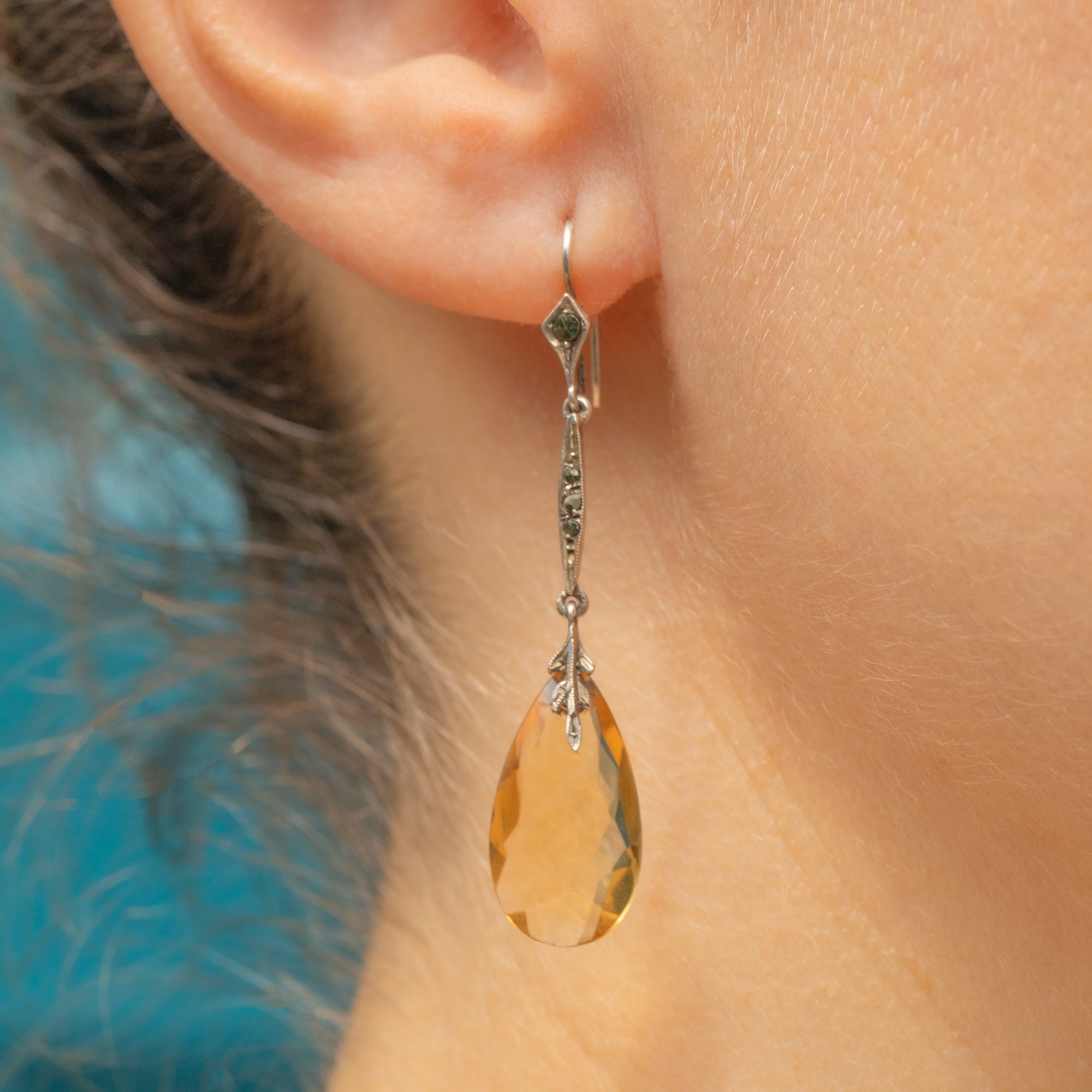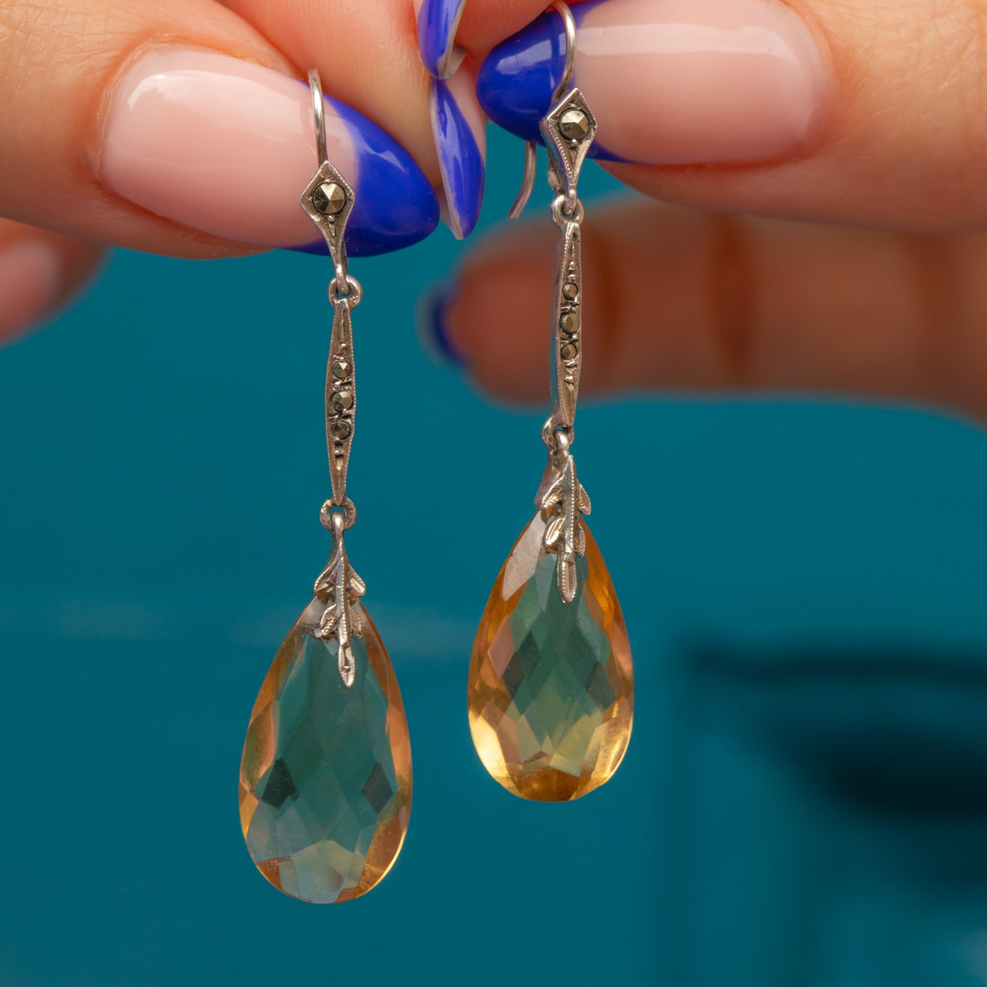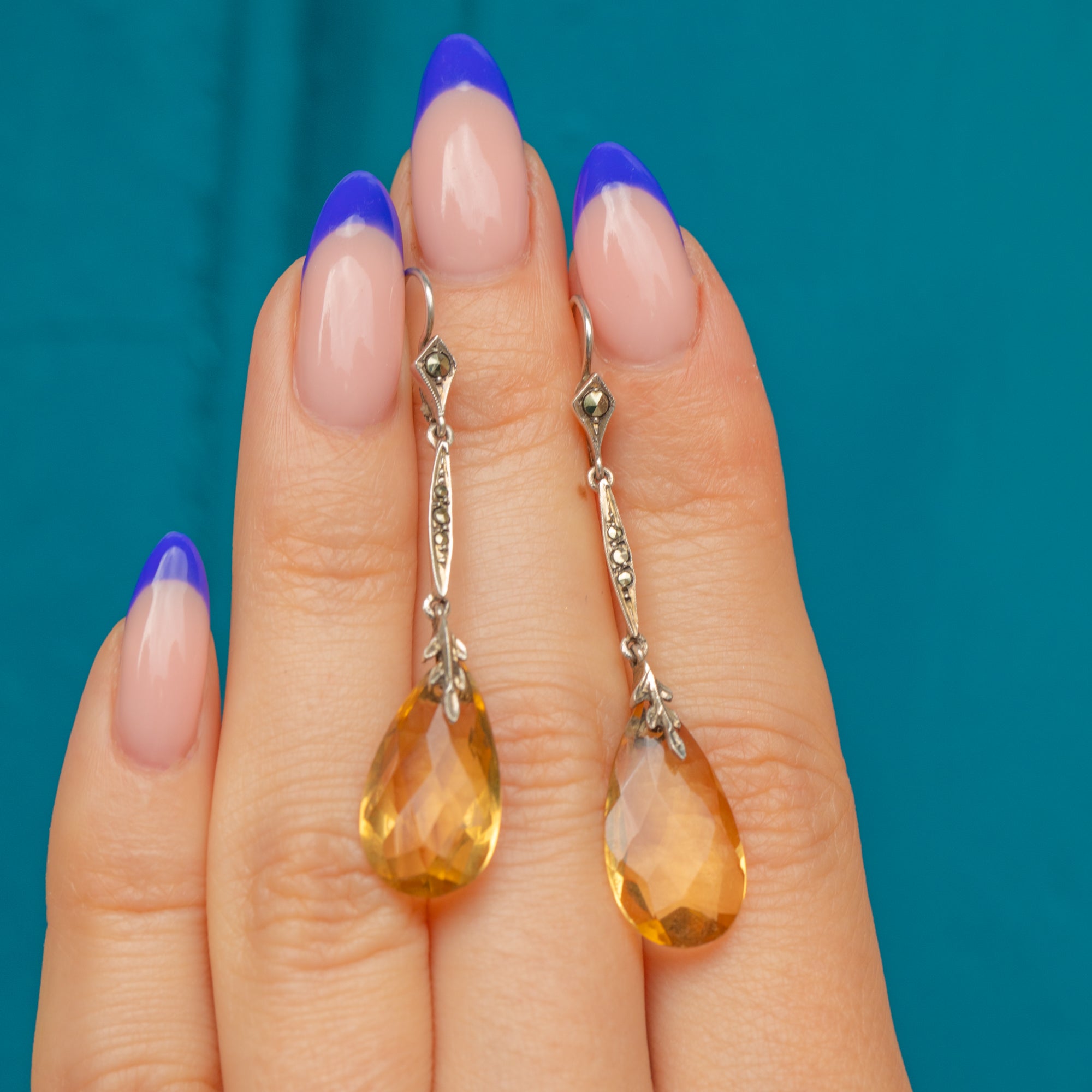 VERY GOOD. These Art Deco Citrine briolette drop earrings are in very good condition. The earrings have a lovely fluidity and the components are all firmly connected. The Citrines have crisp facets and each Marcasite is present and securely set. The Silver has accrued an admirable patina creating a dramatic finish and the hooks are slender promising comfortable wear.