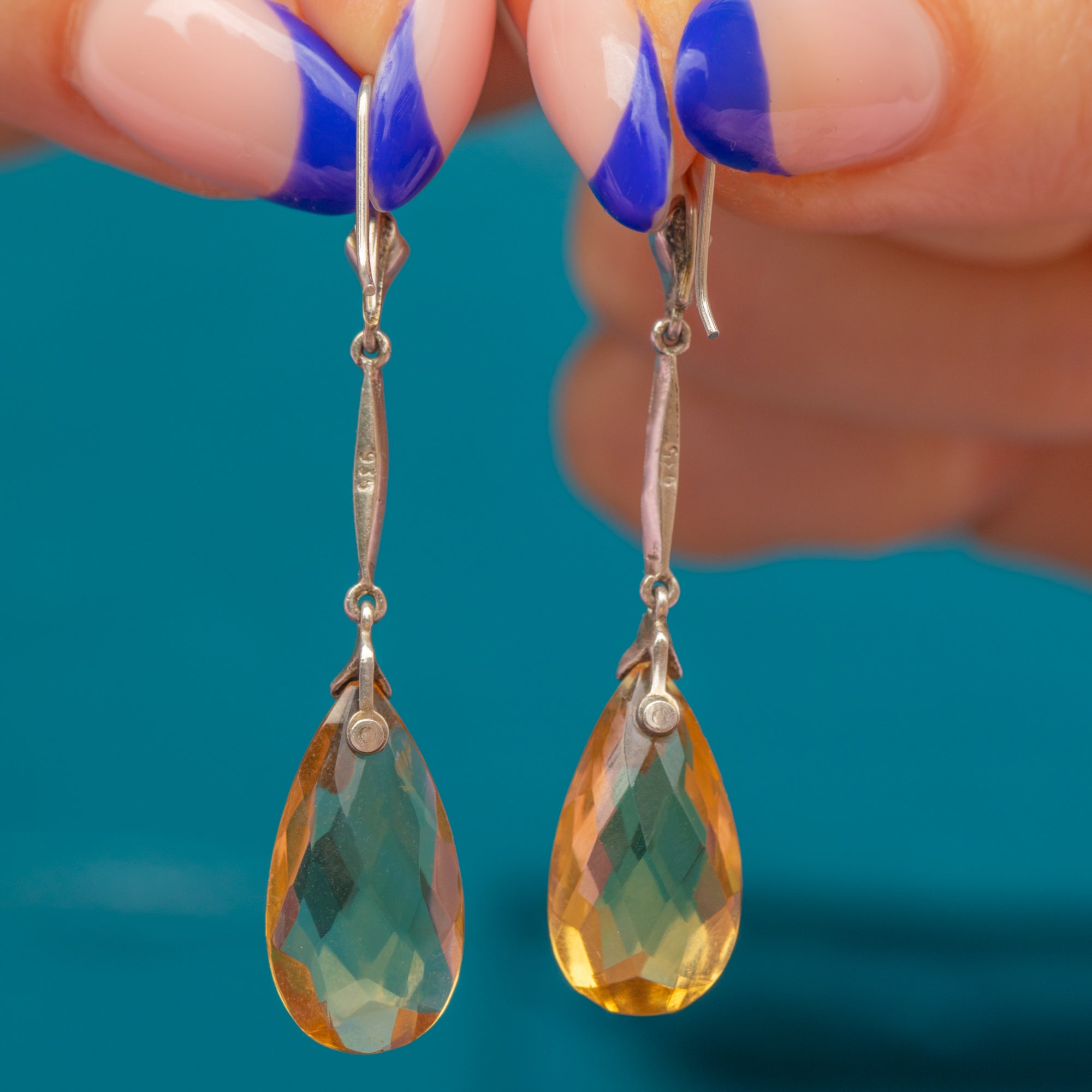 Add some splendour to your lobes with these exquisite Art Deco Citrine briolette drop earrings! The fabulously faceted Citrines glint and glimmer with your every movement thriving within all lighting conditions, suspended from classically Deco geometric drops.