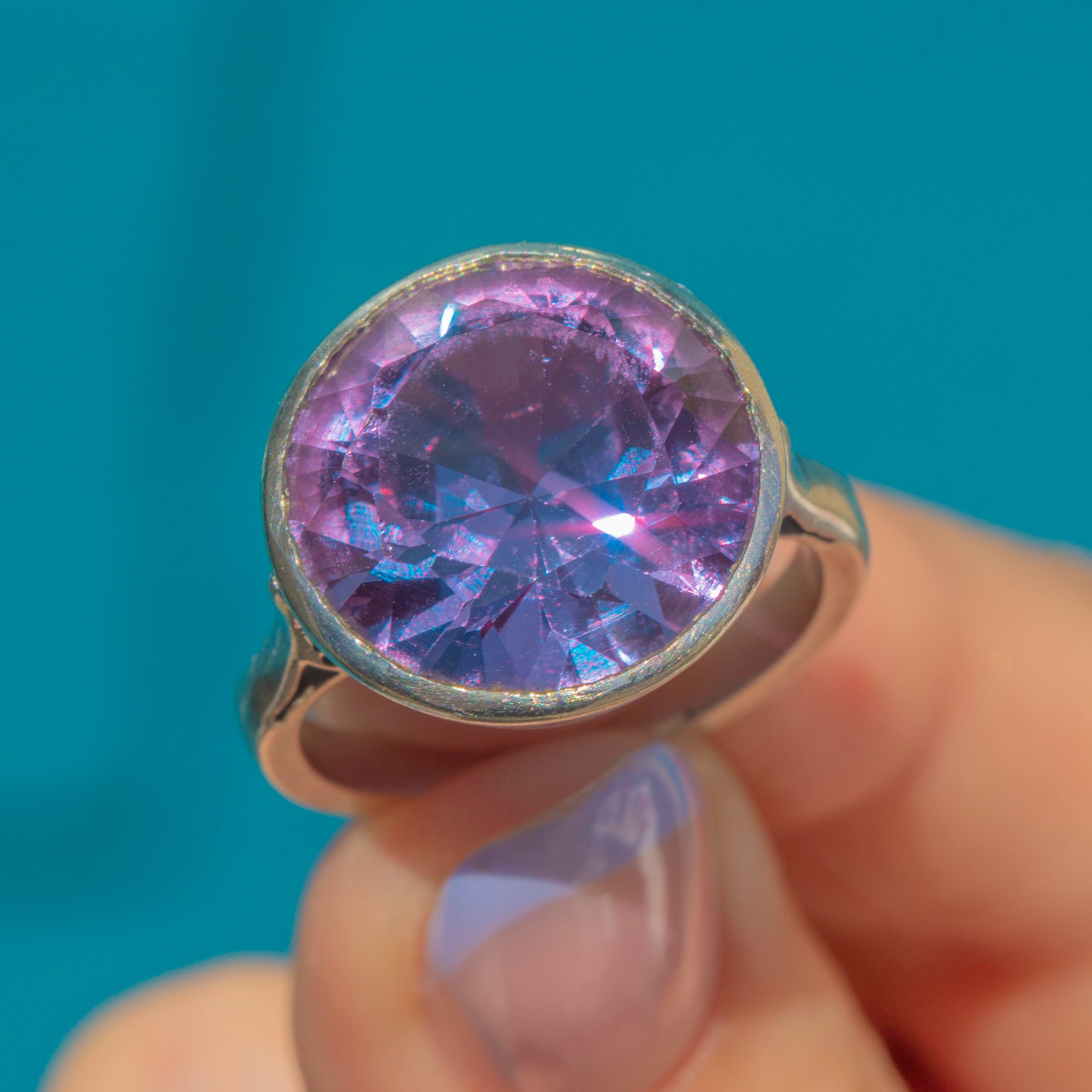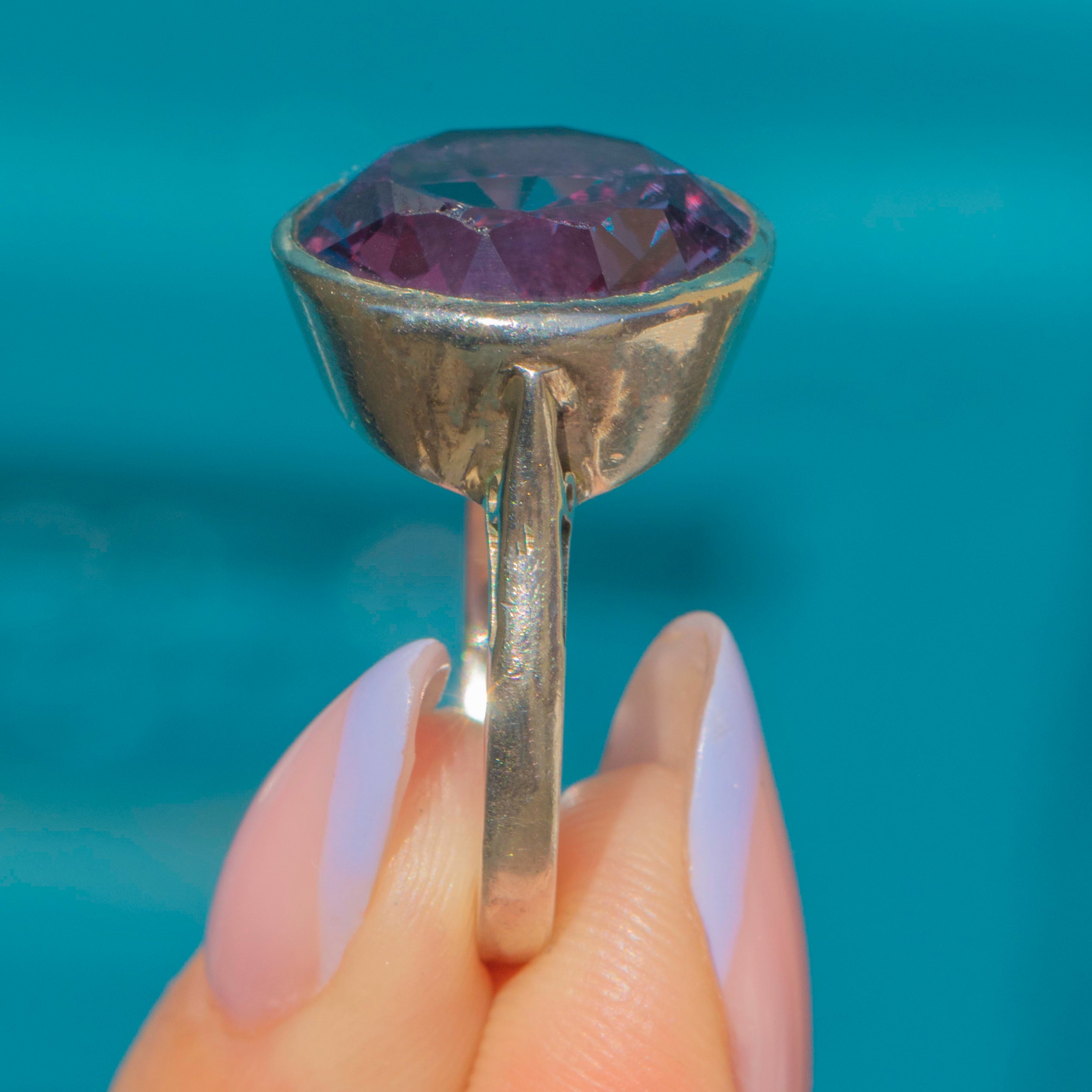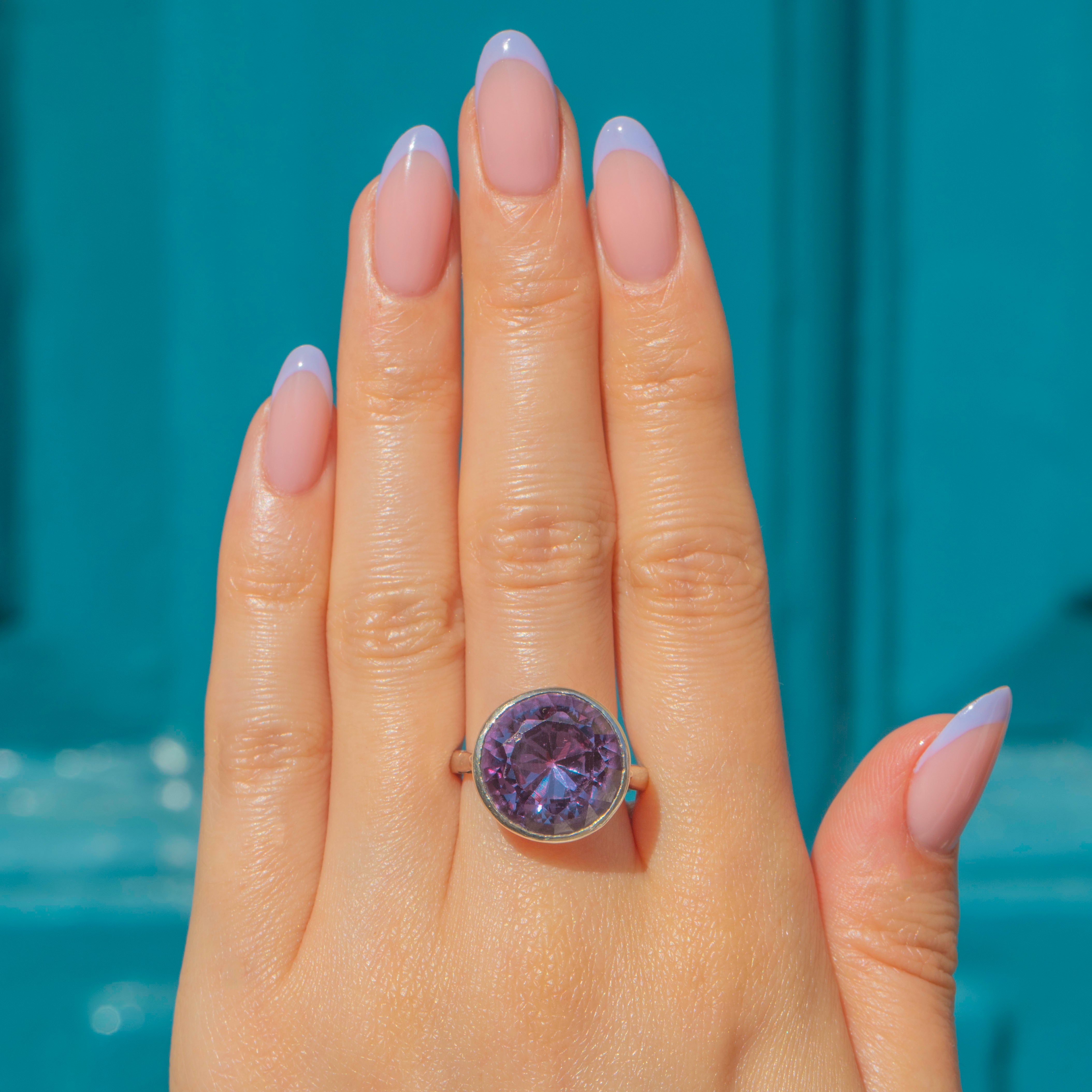 Wonderfully round, the size of the 10.50ct synthetic colour-change Sapphire is sure to make a statement. Complete with glossy Silver settings, you will never tire of this magical ring!