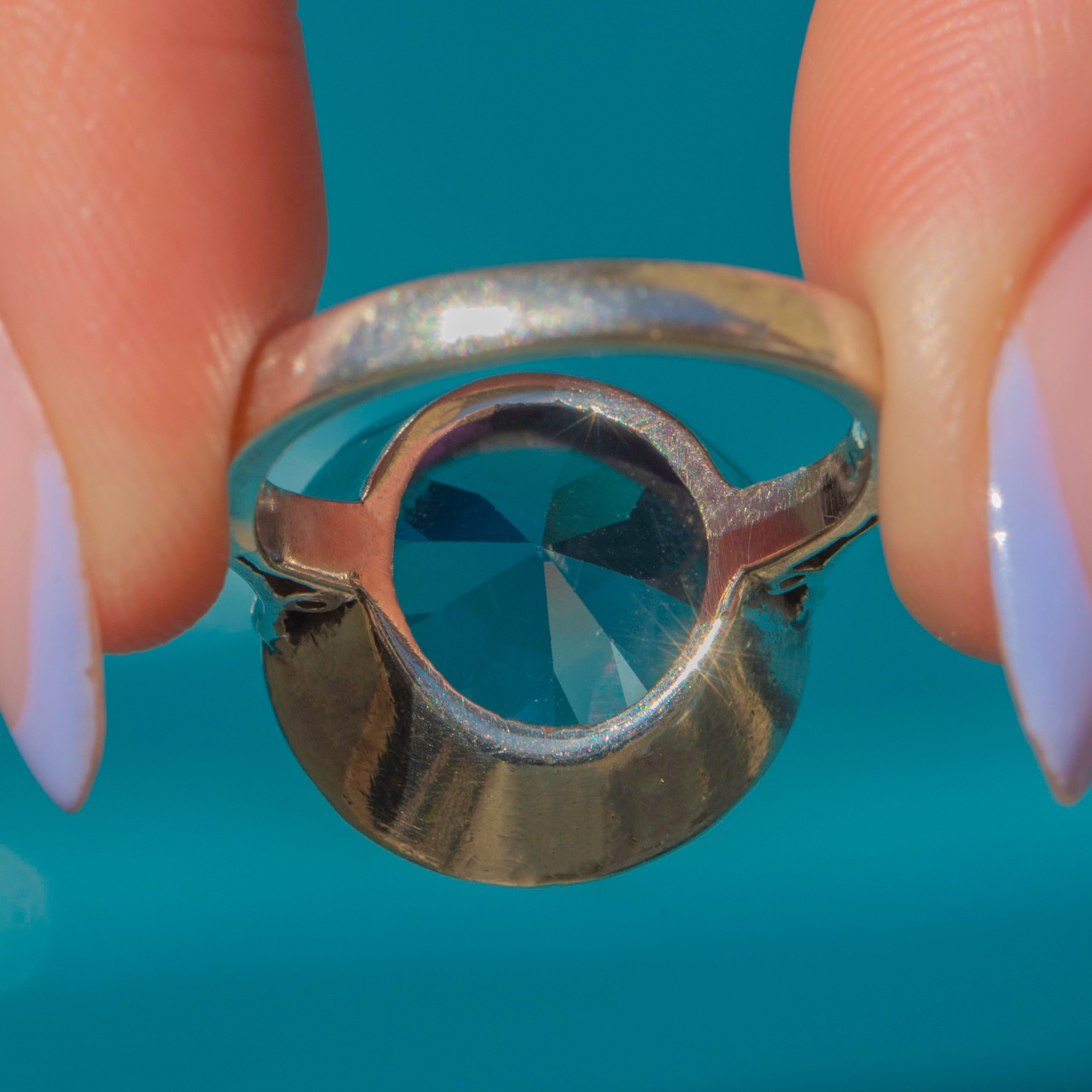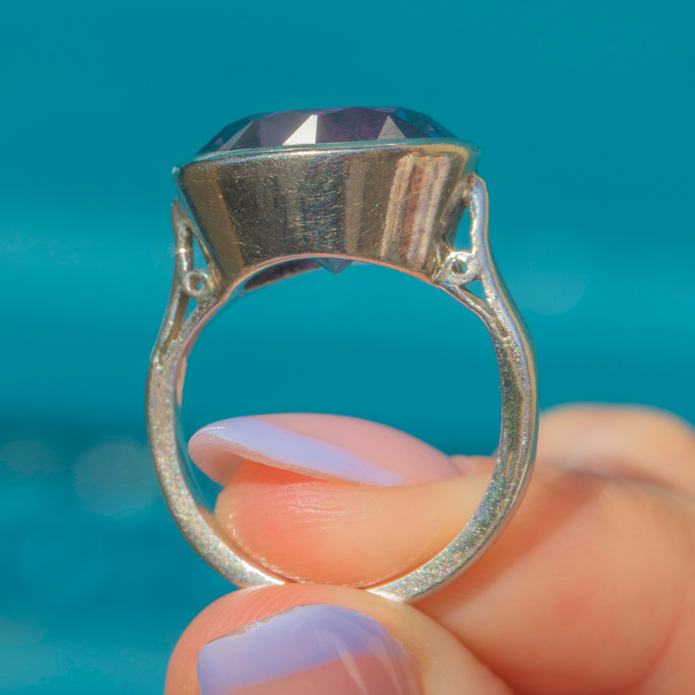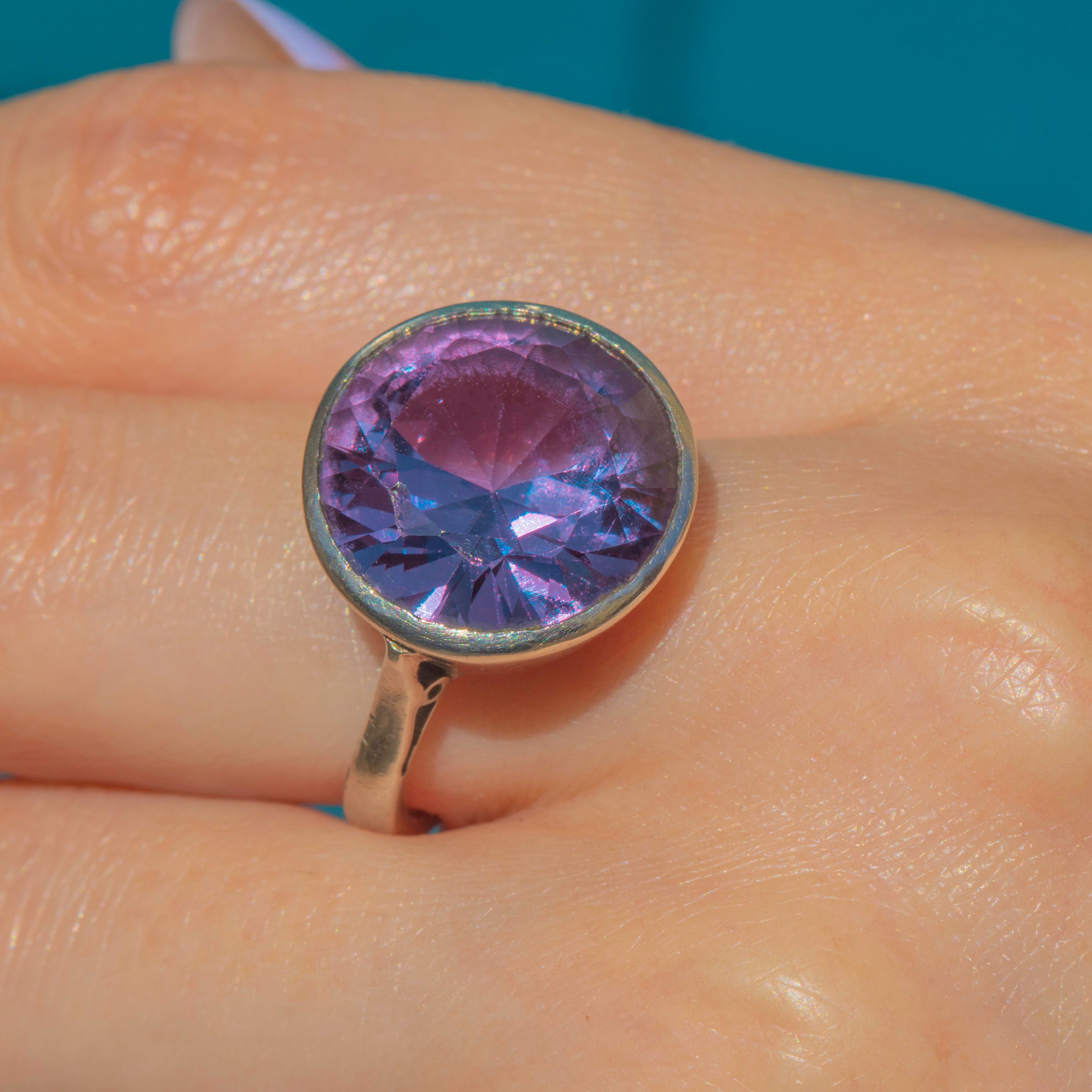 Wonderfully round, the size of the 10.50ct synthetic colour-change Sapphire is sure to make a statement. Complete with glossy Silver settings, you will never tire of this magical ring!
