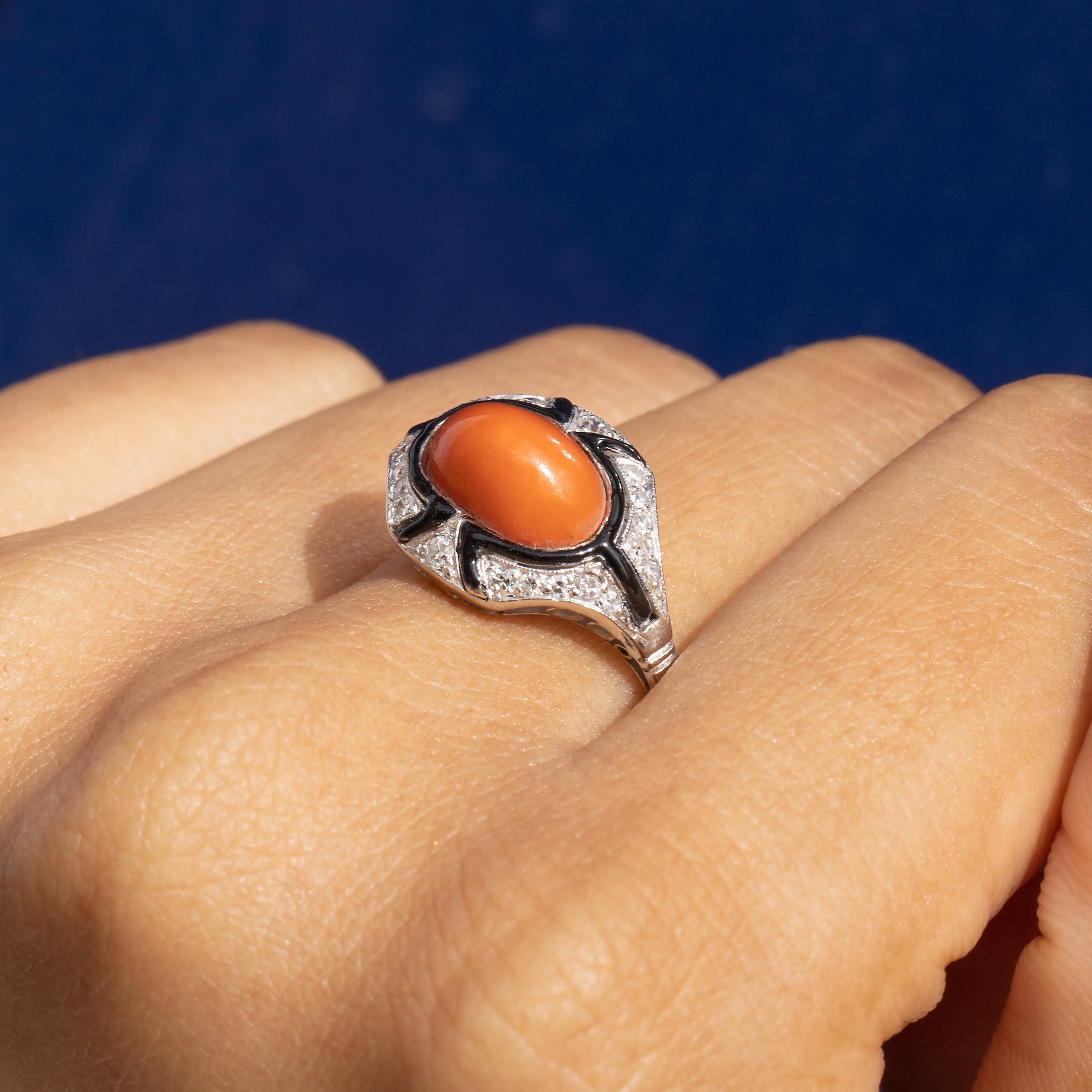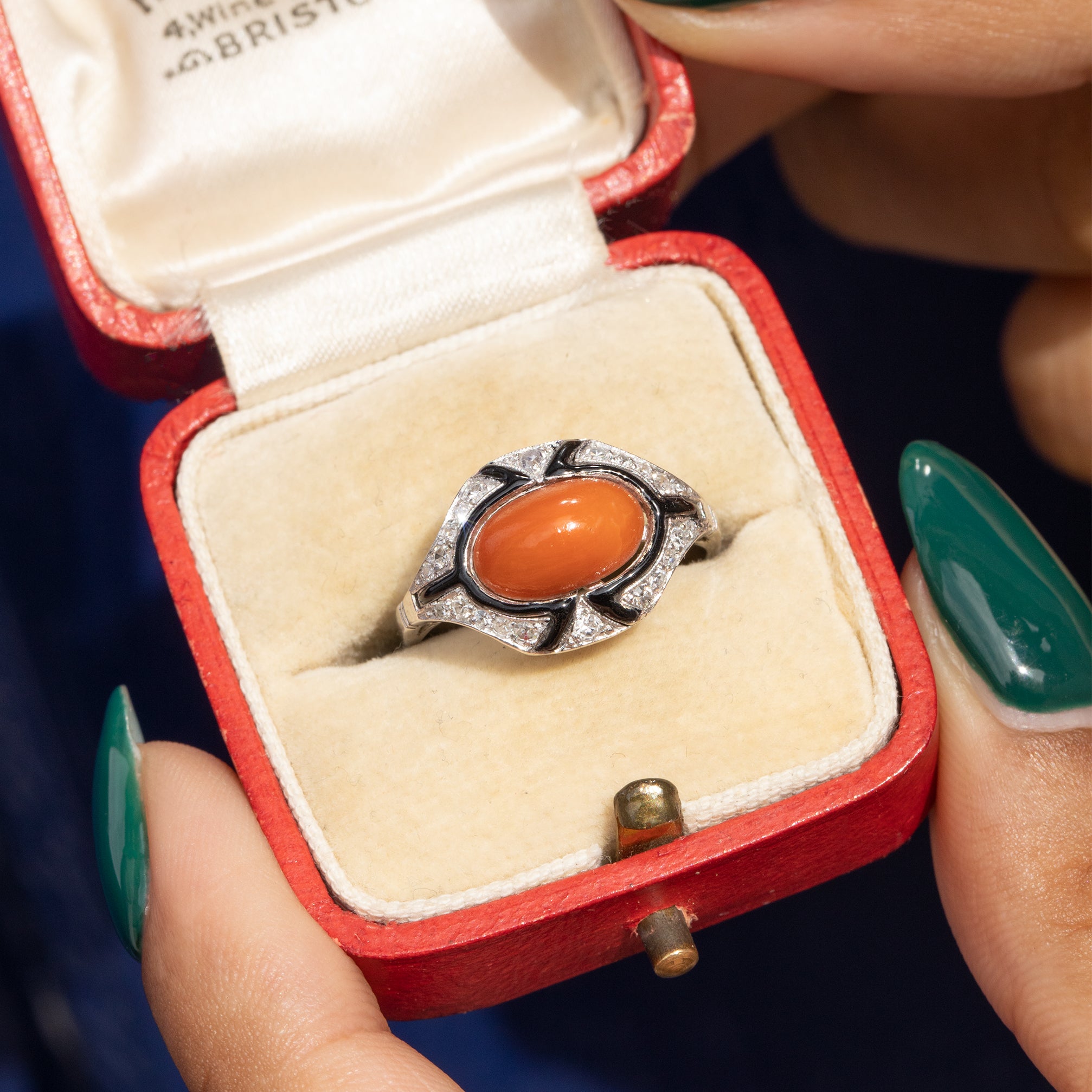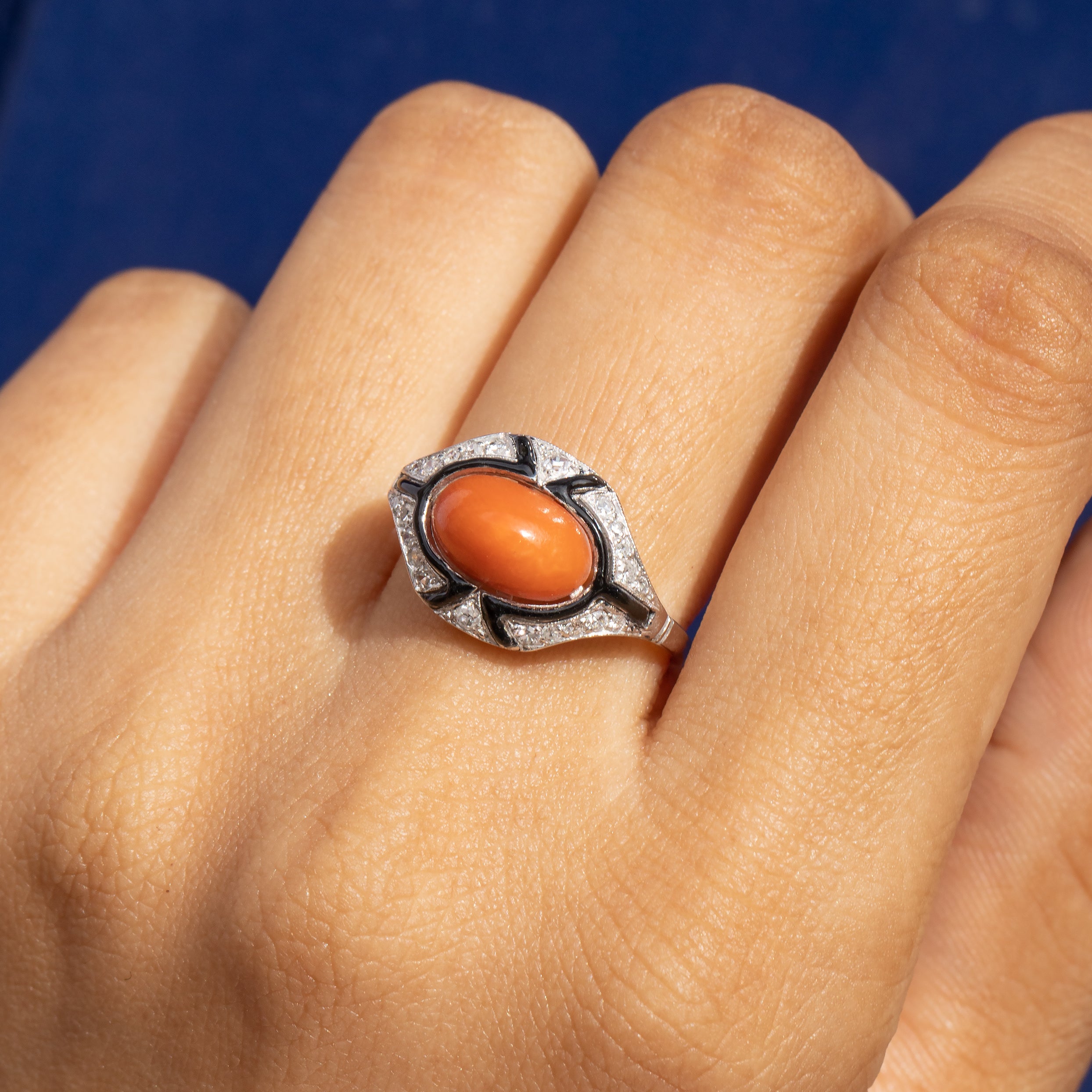 アールデコ コーラル&ブラックエナメル ダイヤモンドリング
