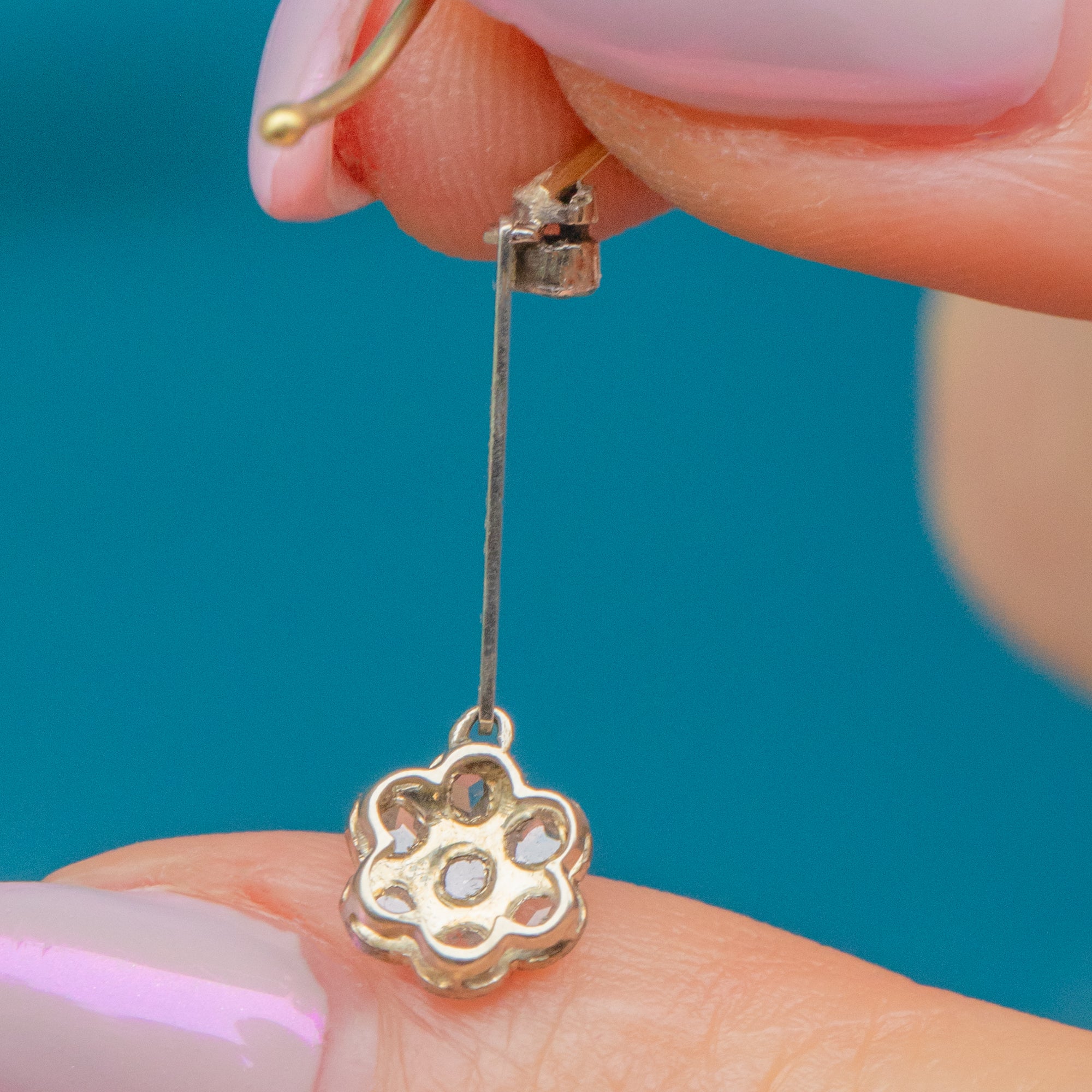Elegant and refined, these Art Deco drop earrings are crafted in 9ct Gold with Platinum settings, each set with sparkling rose-cut Diamonds. The daisy-shaped tops shimmer beautifully, leading to delicate articulated drops that catch the light with every movement.