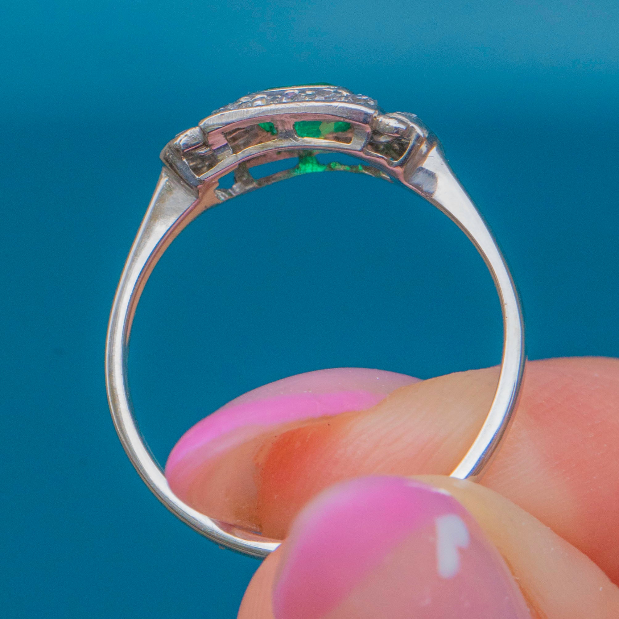 This elegant Art Deco ring showcases a vivid square-cut Emerald framed by a glittering halo of Diamonds, perfectly capturing the geometric glamour of the 1920s. The crisp Platinum setting enhances the Emerald’s rich green hue and the Diamonds’ bright sparkle, creating a timeless and sophisticated piece.