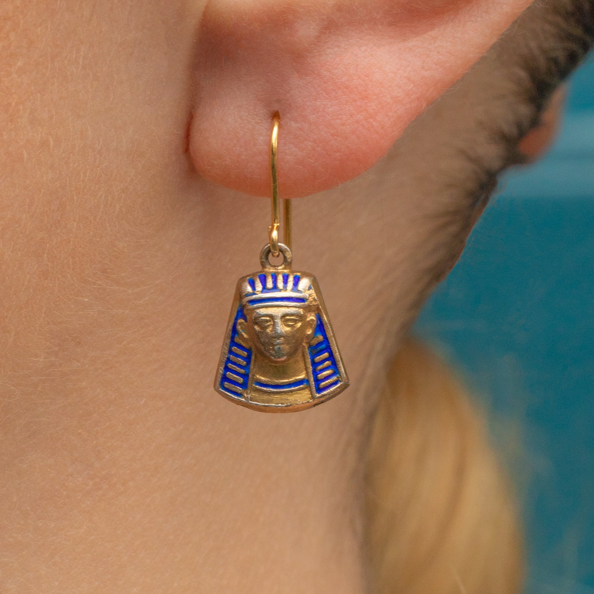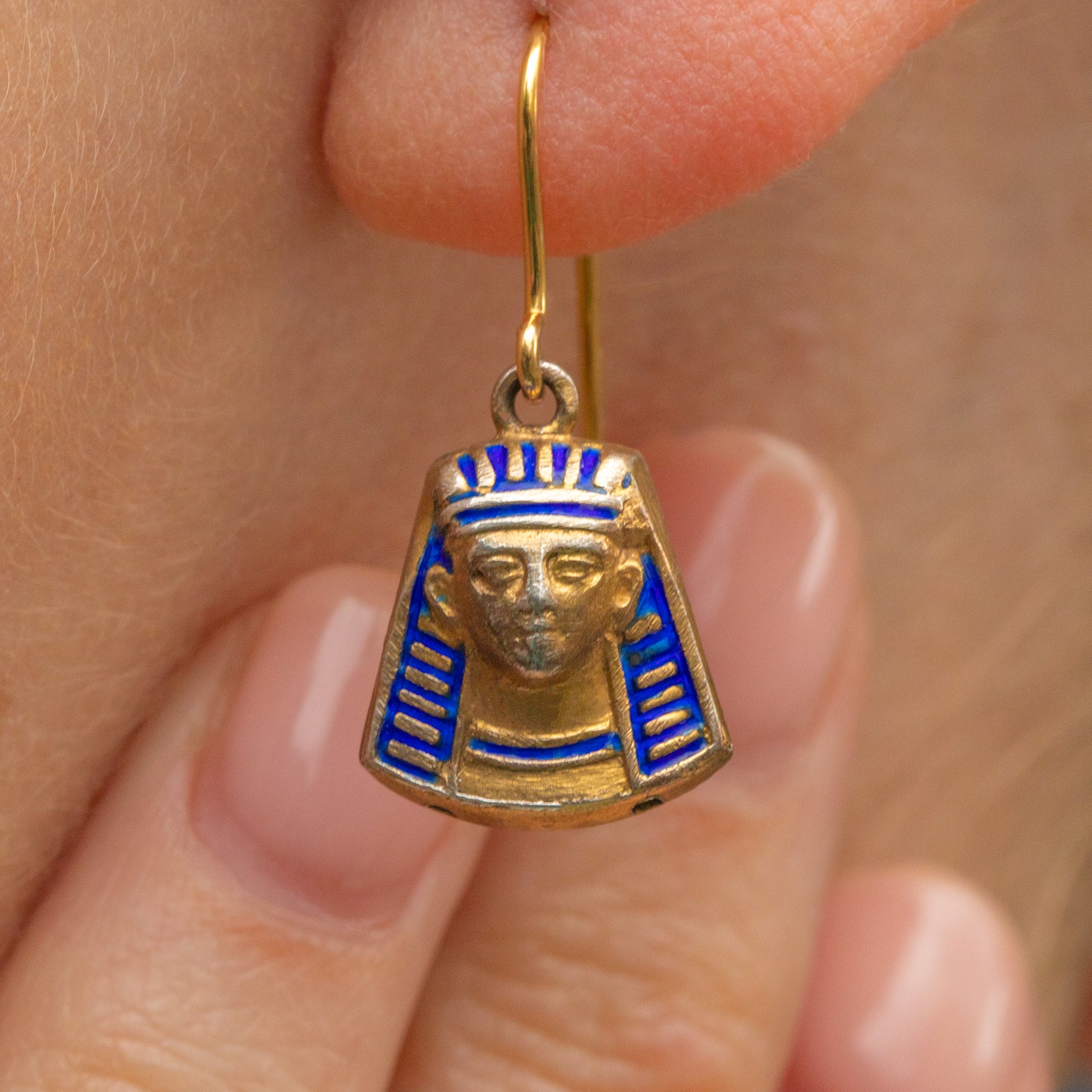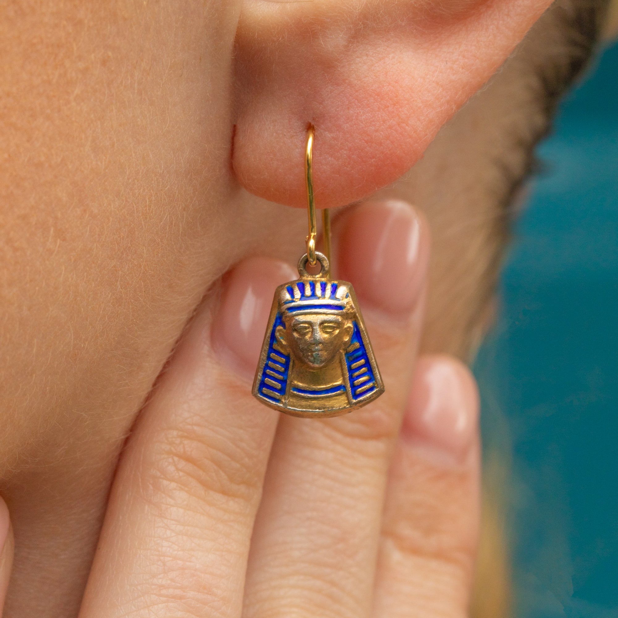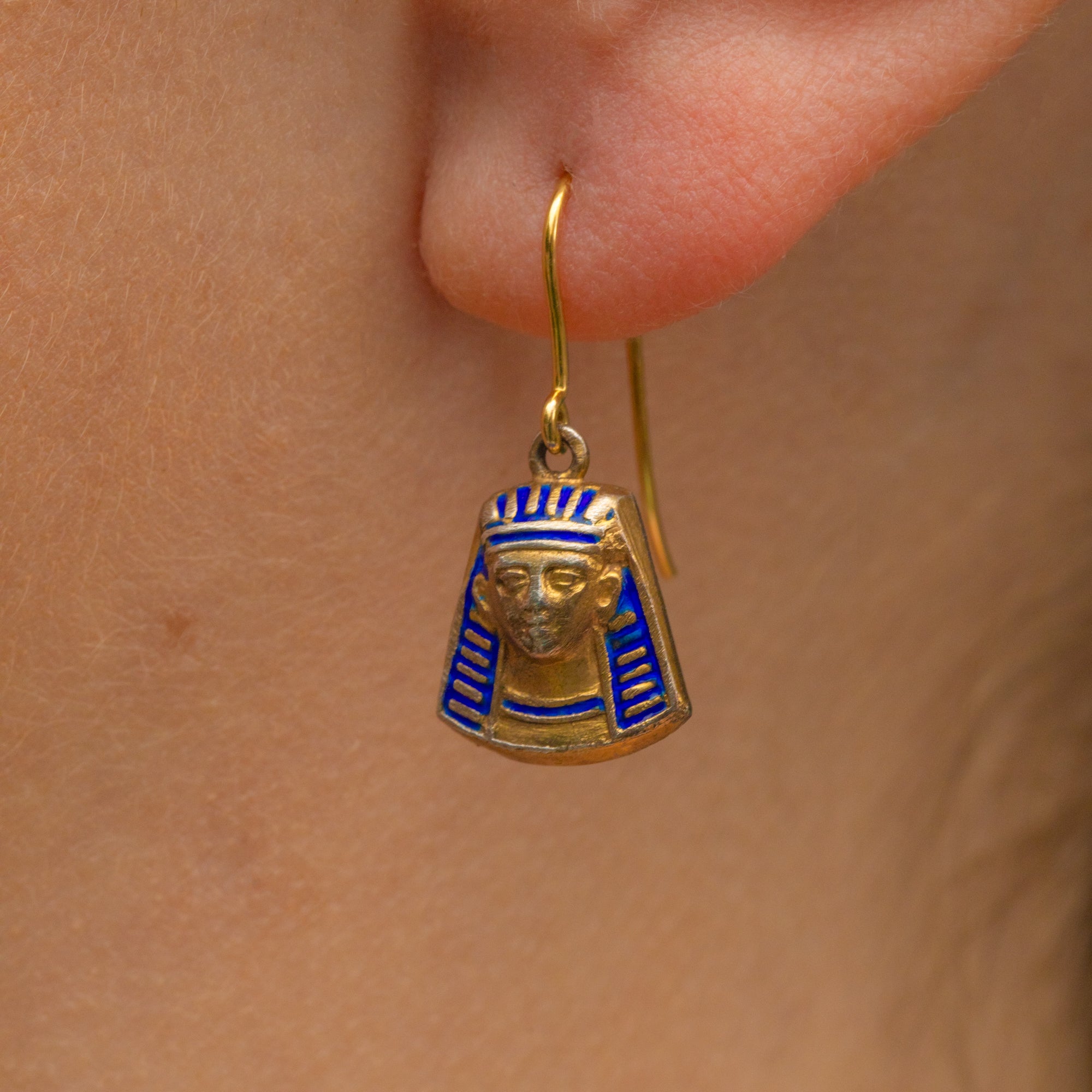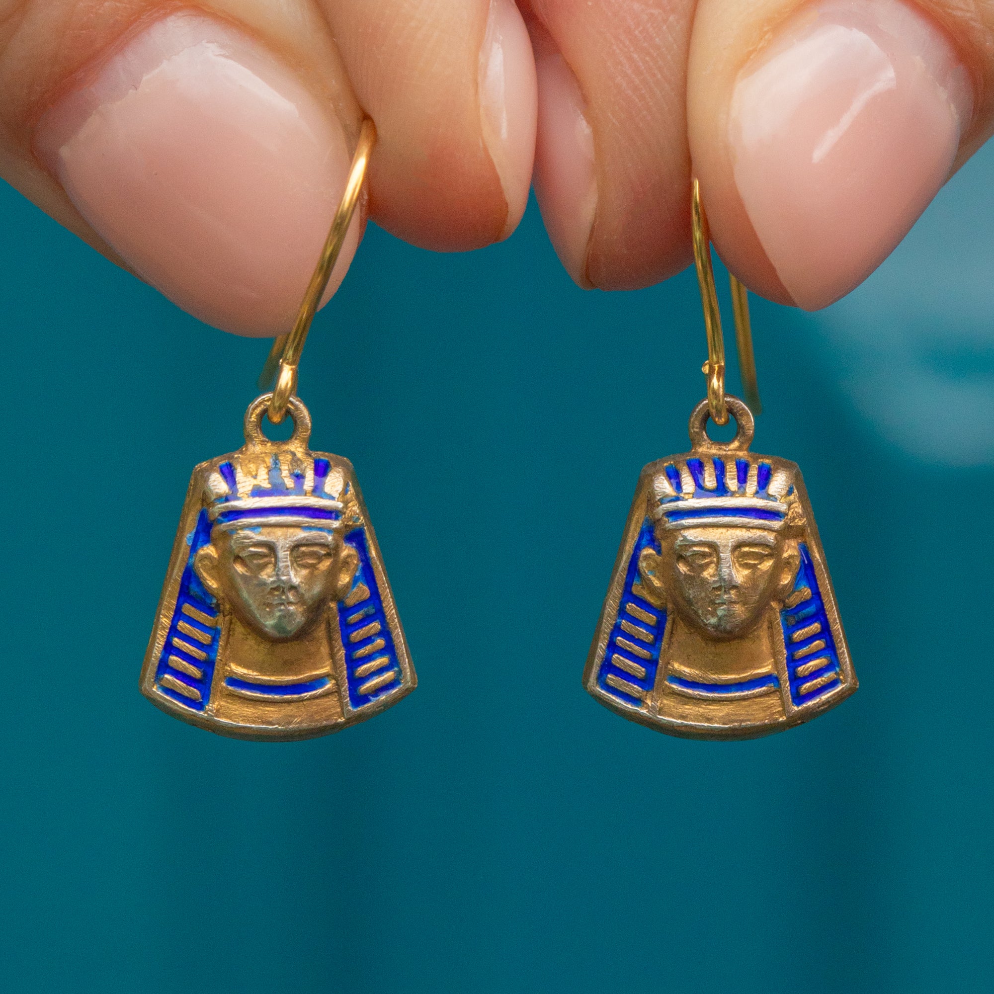 If you have a fascination for anything ancient Egypt, these Art Deco Enamel Egyptian revival Tutankhamun earrings were made for you! Their intricately crafted form depicts Tutankhamun's mask, inlaid with blue Enamel detailing to finish.