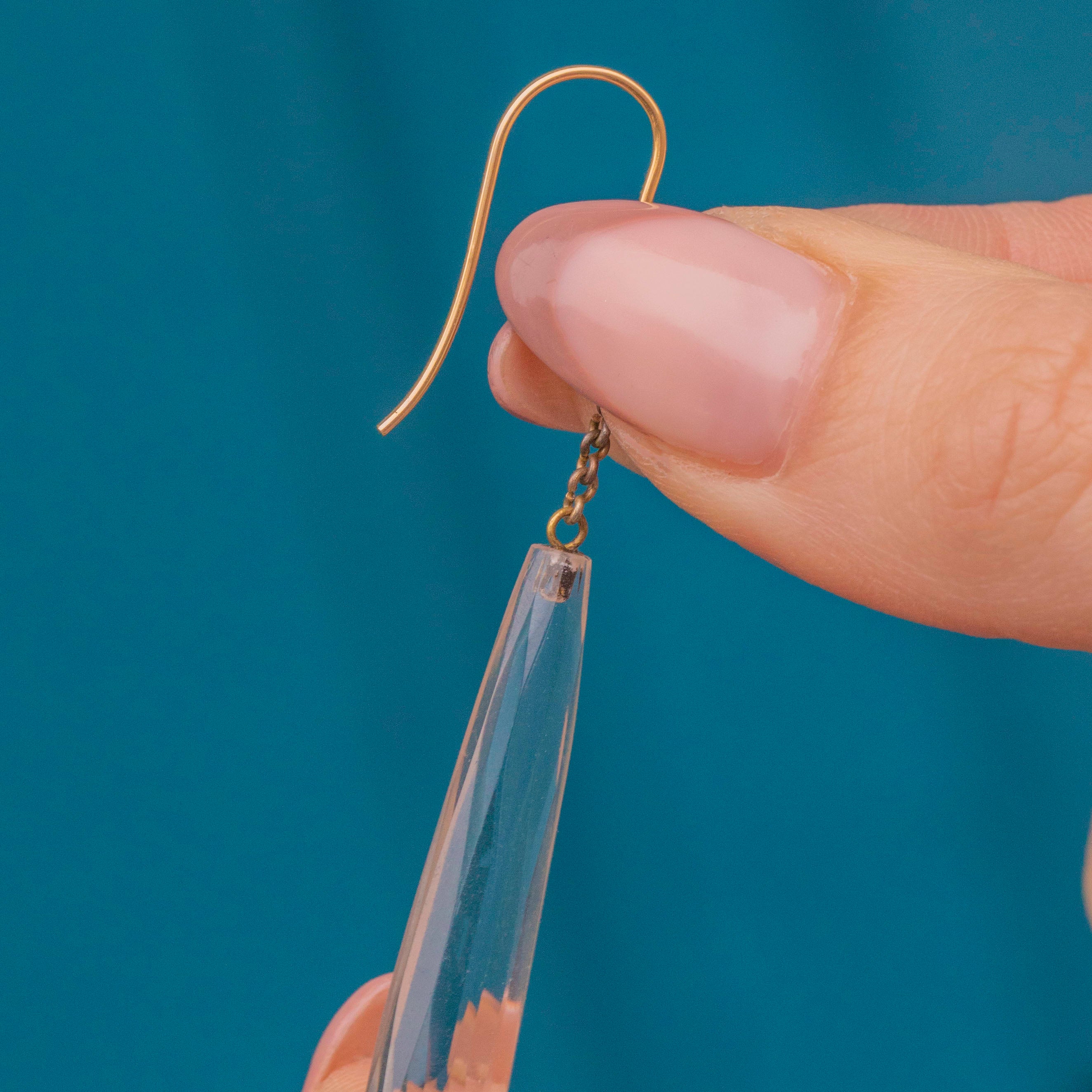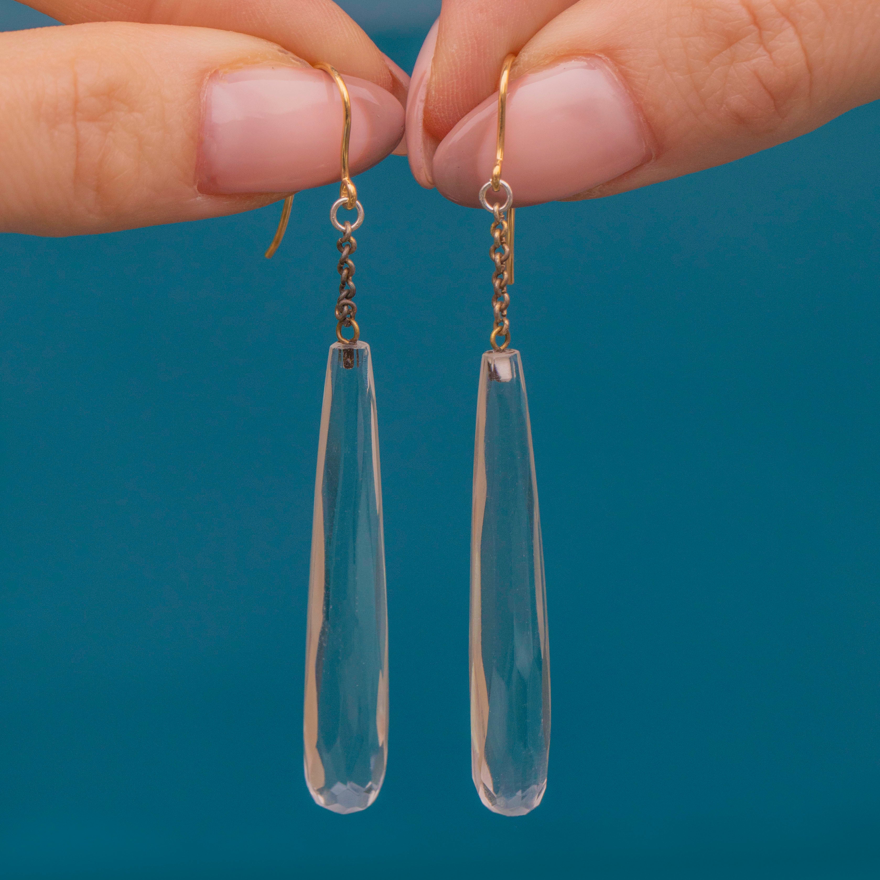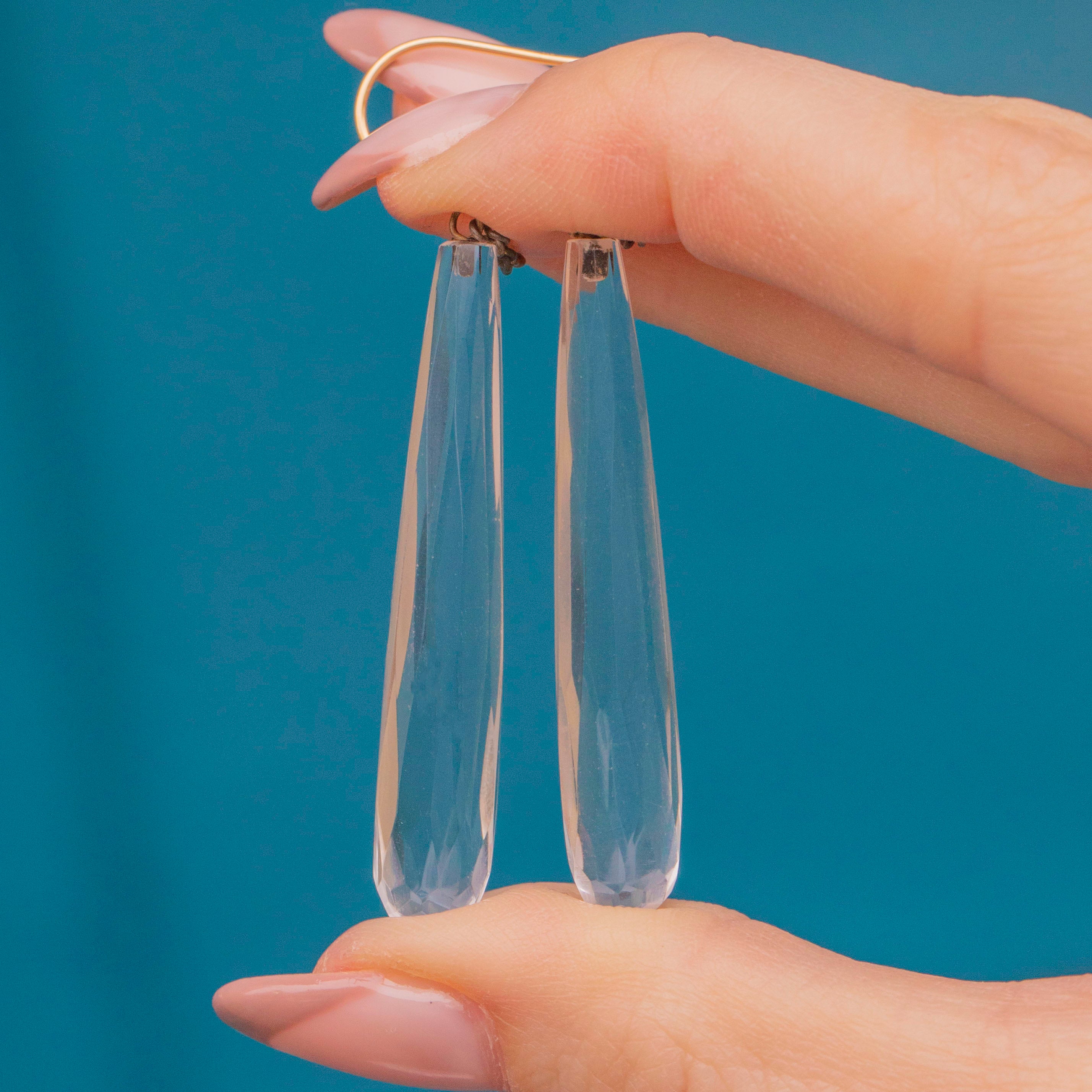 Bound to make a statement, these Art Deco faceted Rock Crystal drop earrings will provide the perfect finishing touch to any attire! Expertly hand-cut, each Rock Crystal torpedo has a crisp set of facets that glint in the light.