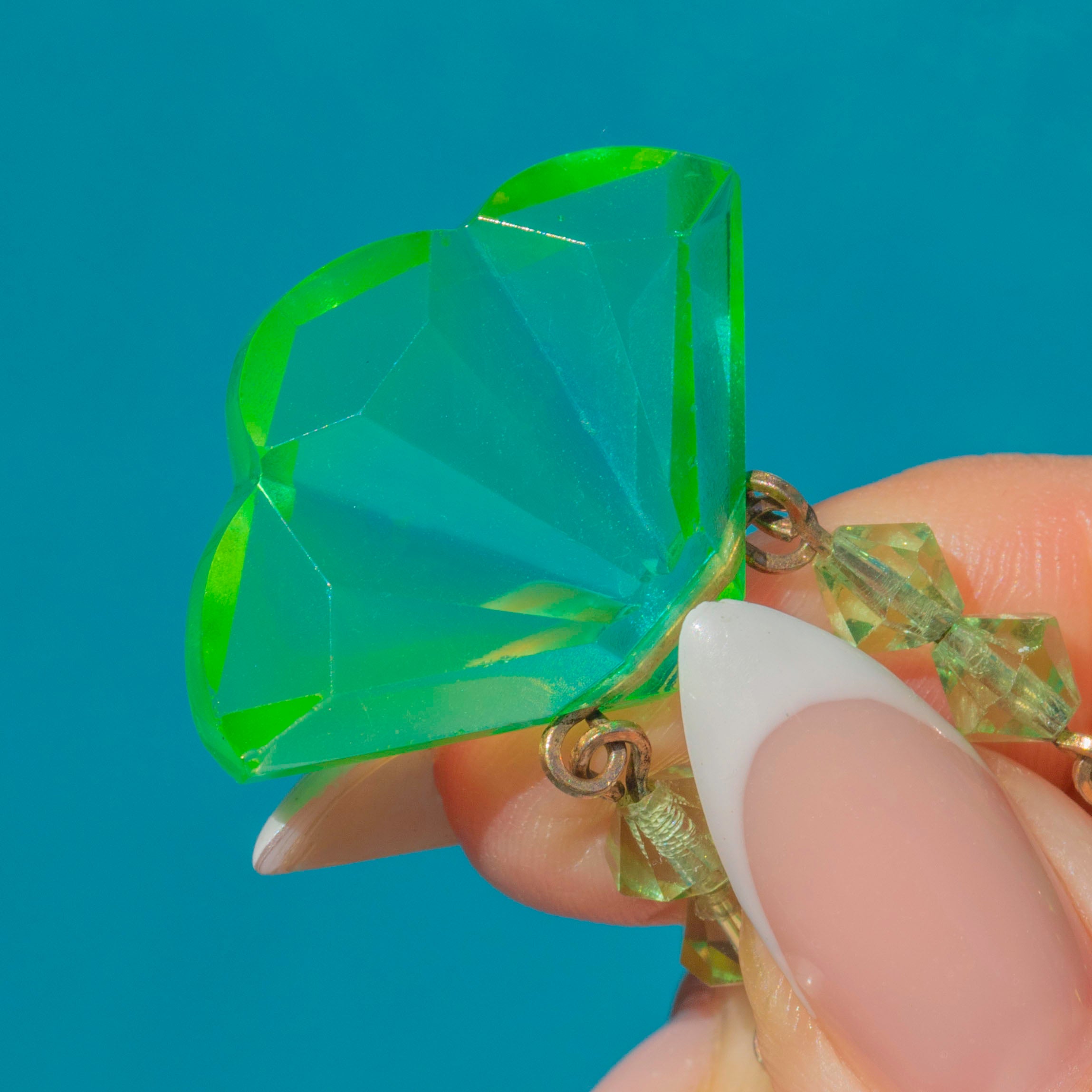 This striking Art Deco necklace is crafted from rare uranium glass, prized for its vivid neon-green glow. The fan-shaped drops are beautifully faceted to catch the light, while the graduated design creates a bold and eye-catching silhouette.
