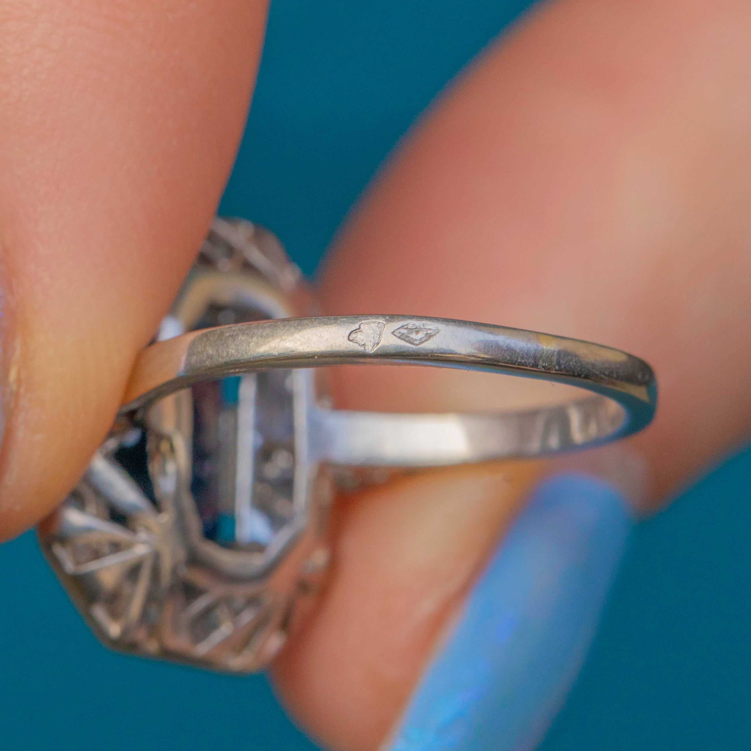 In quintessential Art Deco style, this antique Platinum ring has a lovely geometric face and ornate settings. She is complete with a rare French wolf's head stamp on the outside of her band to signal she is an authentic Platinum ring, adding to her unique value.