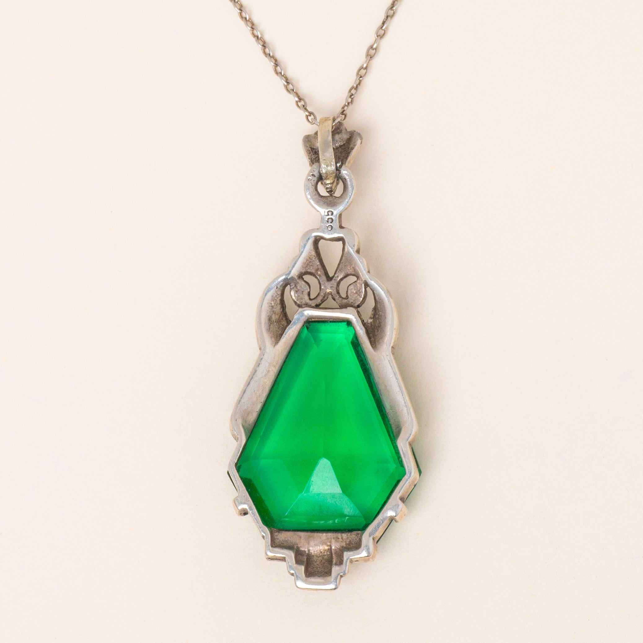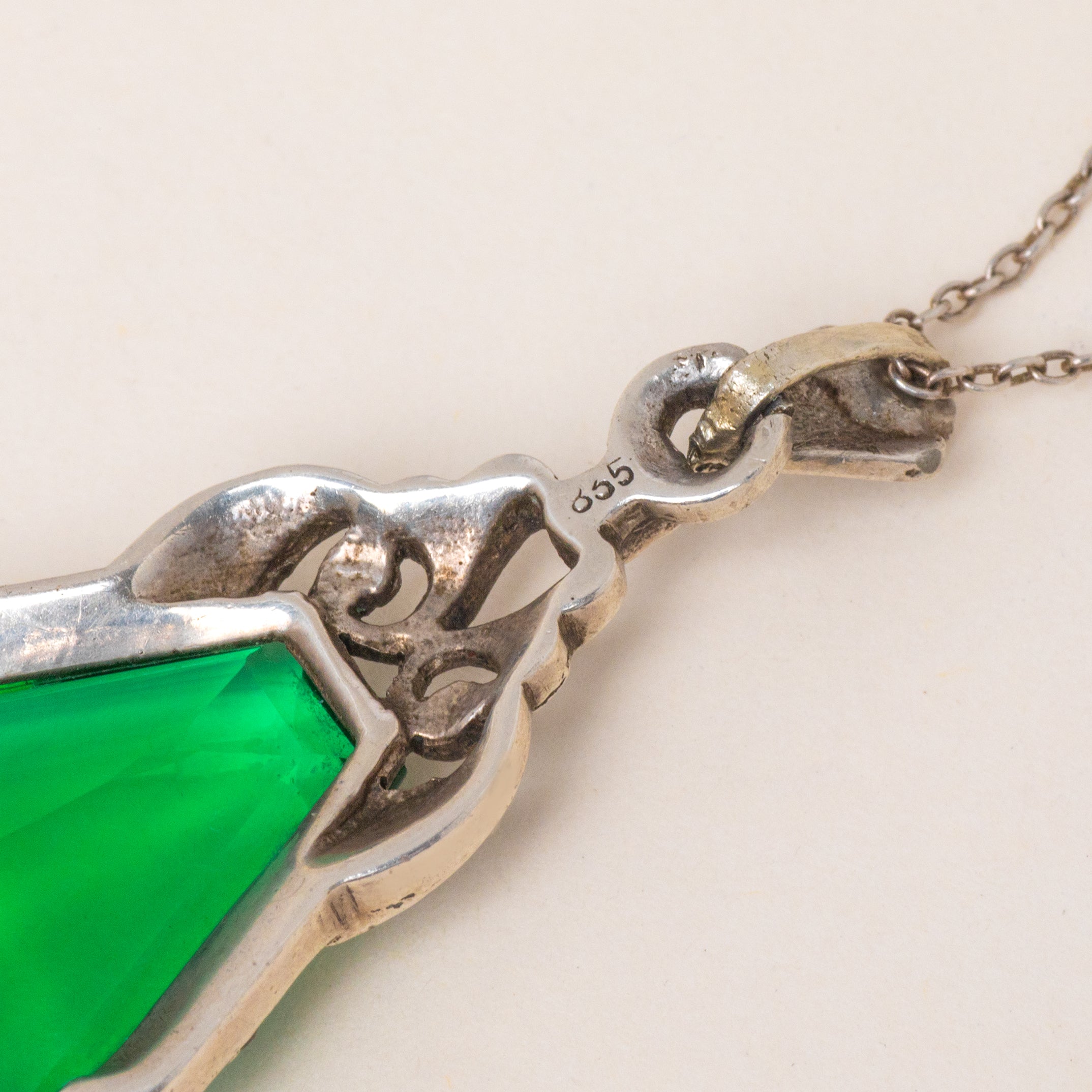 MATERIALS: 835 Silver pendant (likely European Silver), Sterling Silver chain, Green Paste, Marcasite.