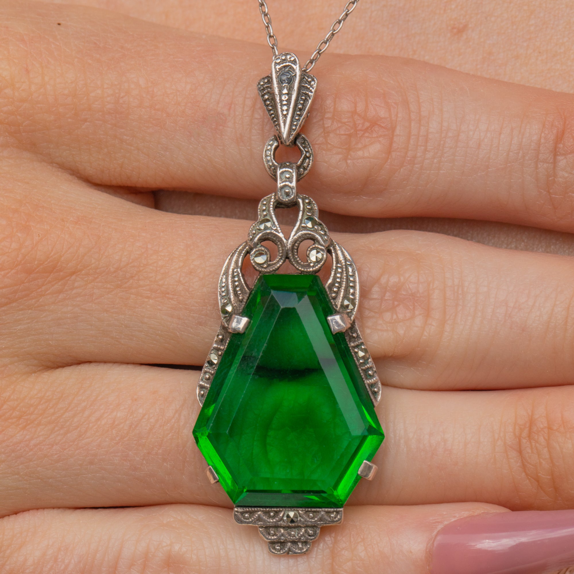 EXCELLENT. This Art Deco Silver green Paste & Marcasite drop pendant is in excellent condition. The Paste gemstone is securely set and free from chips, and each Marcasite is present adding a wonderful sparkling touch. This gorgeous necklace can be popped on straight out of the box!