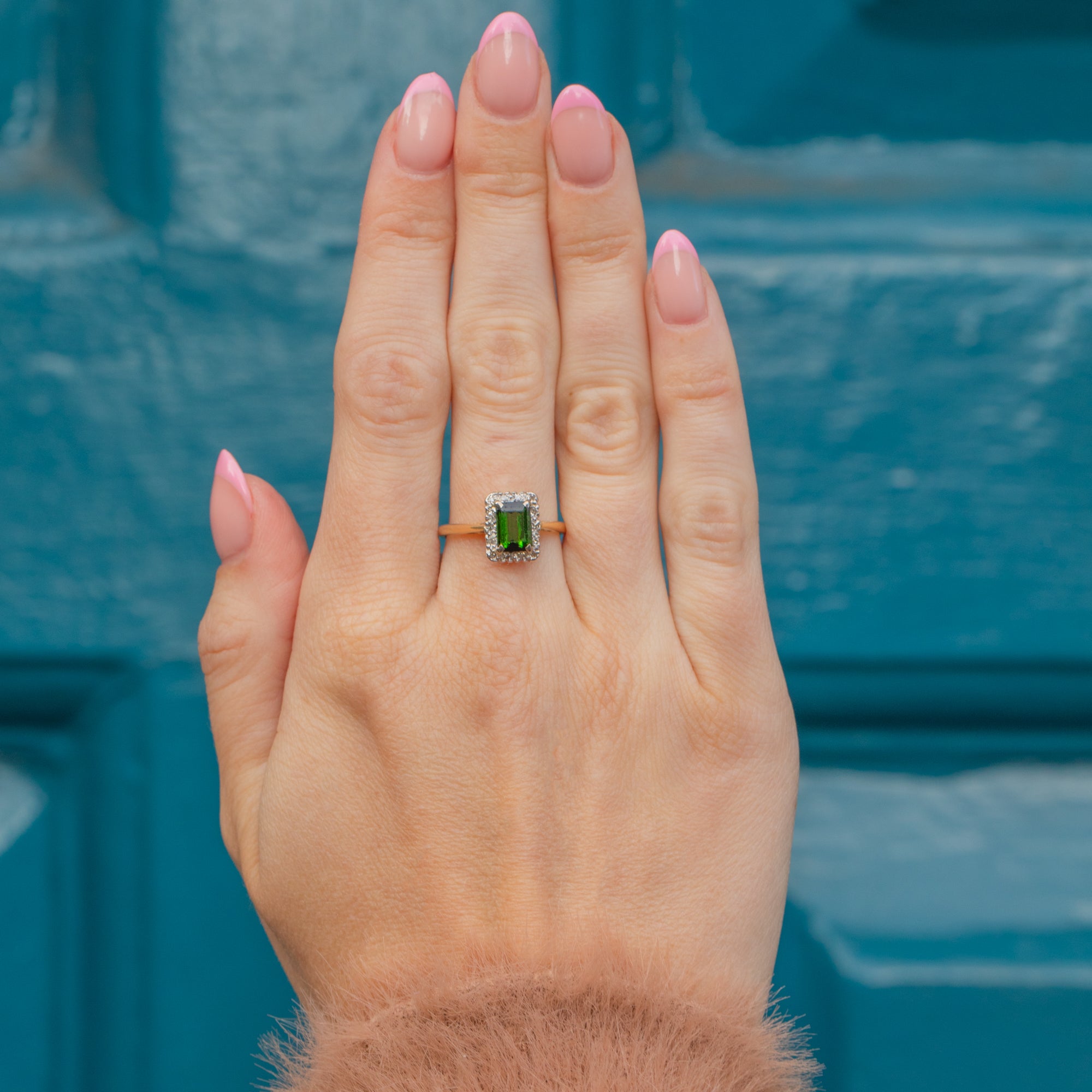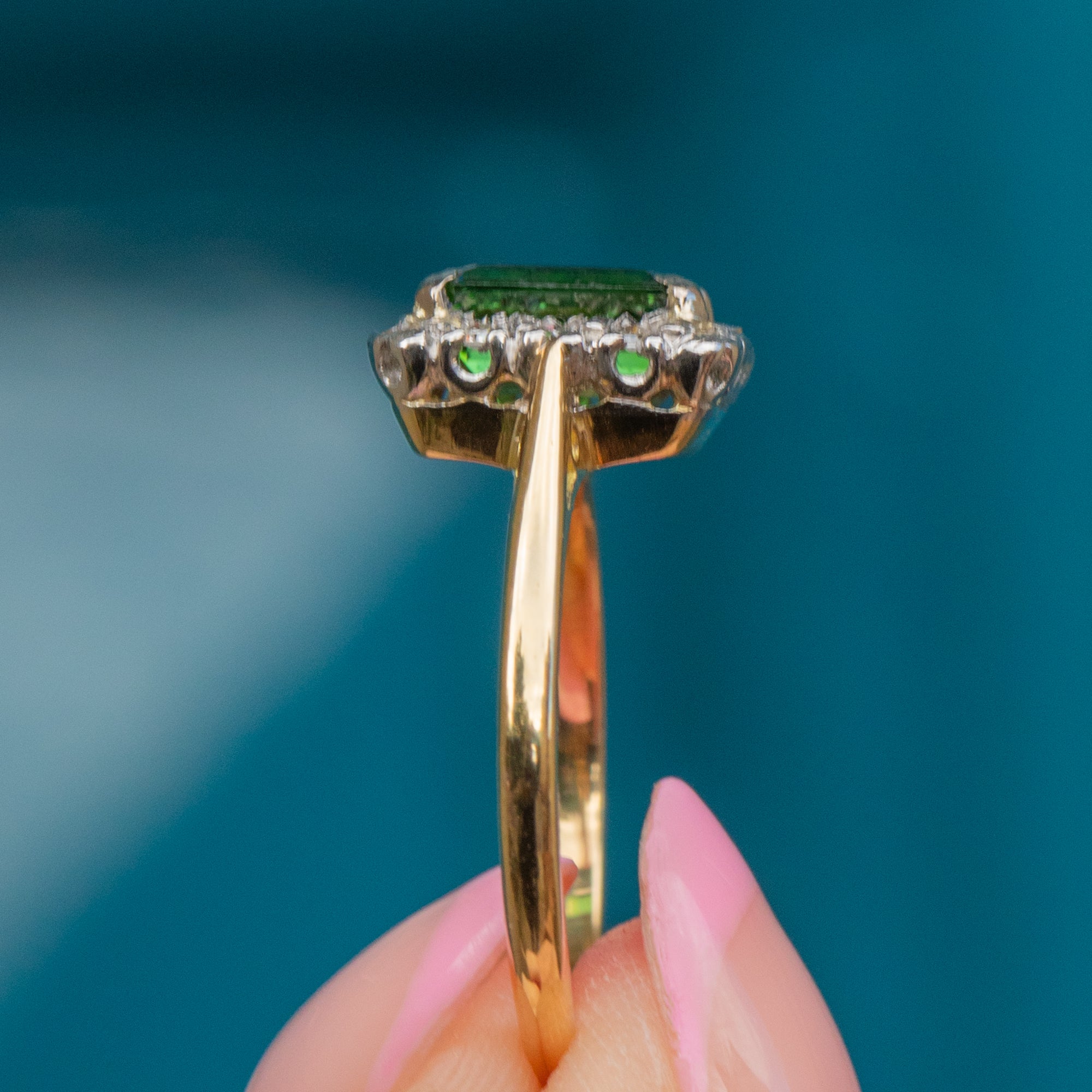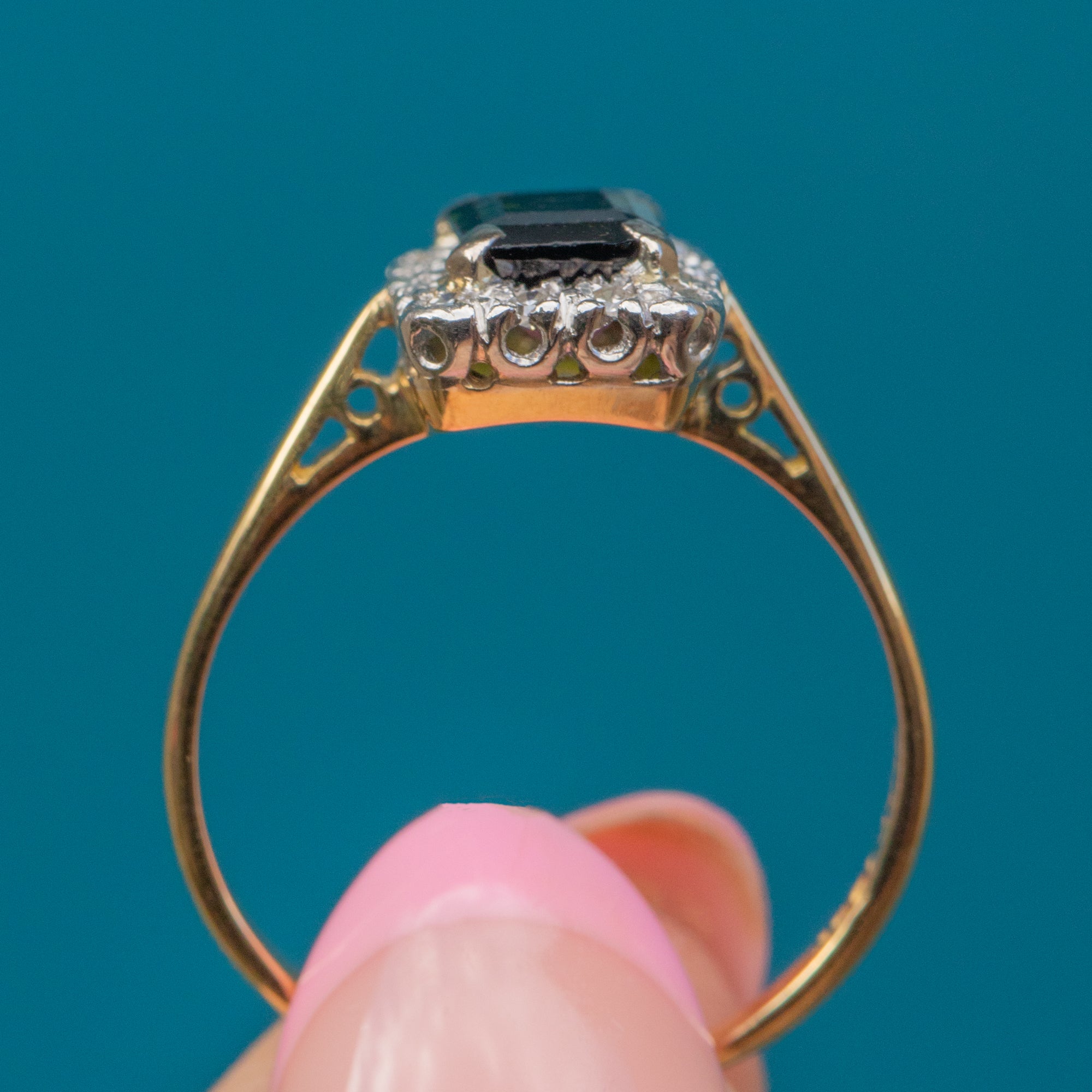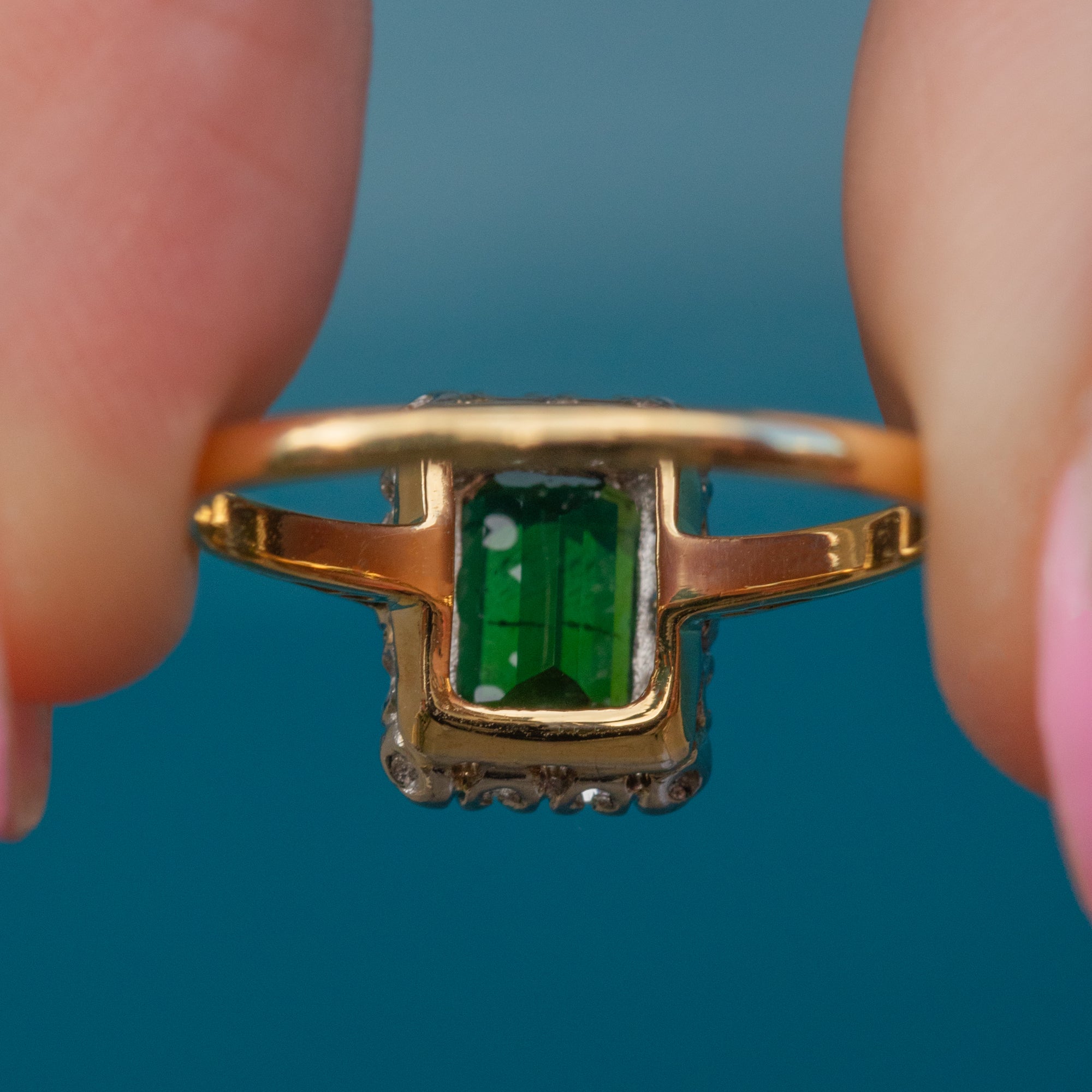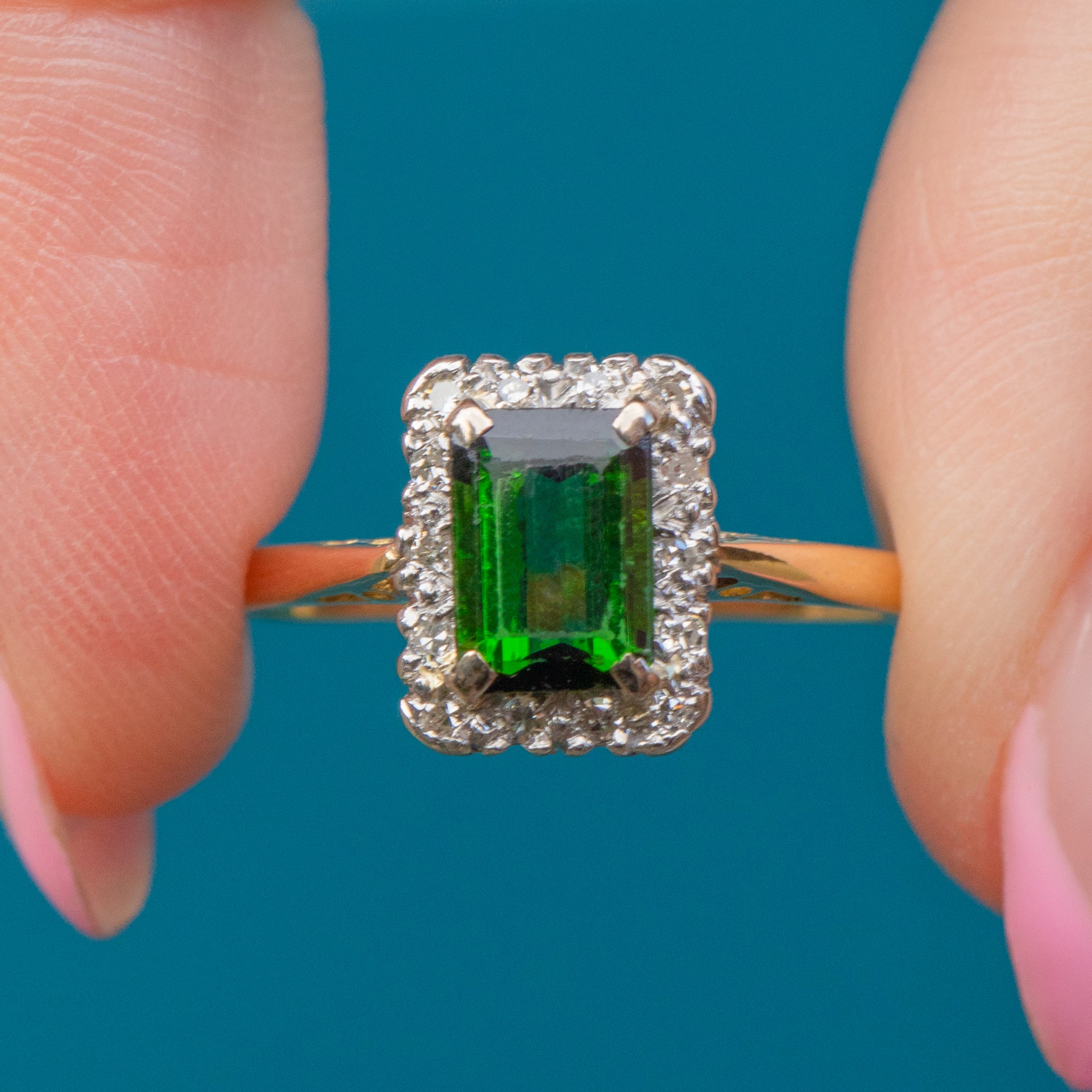 Expertly handcrafted, this square Tourmaline and Diamond cluster ring perfectly captures the essence of the Art Deco era. The bright saturated 18ct Gold band brings everything together to create a lovely, unique piece of vintage jewellery.