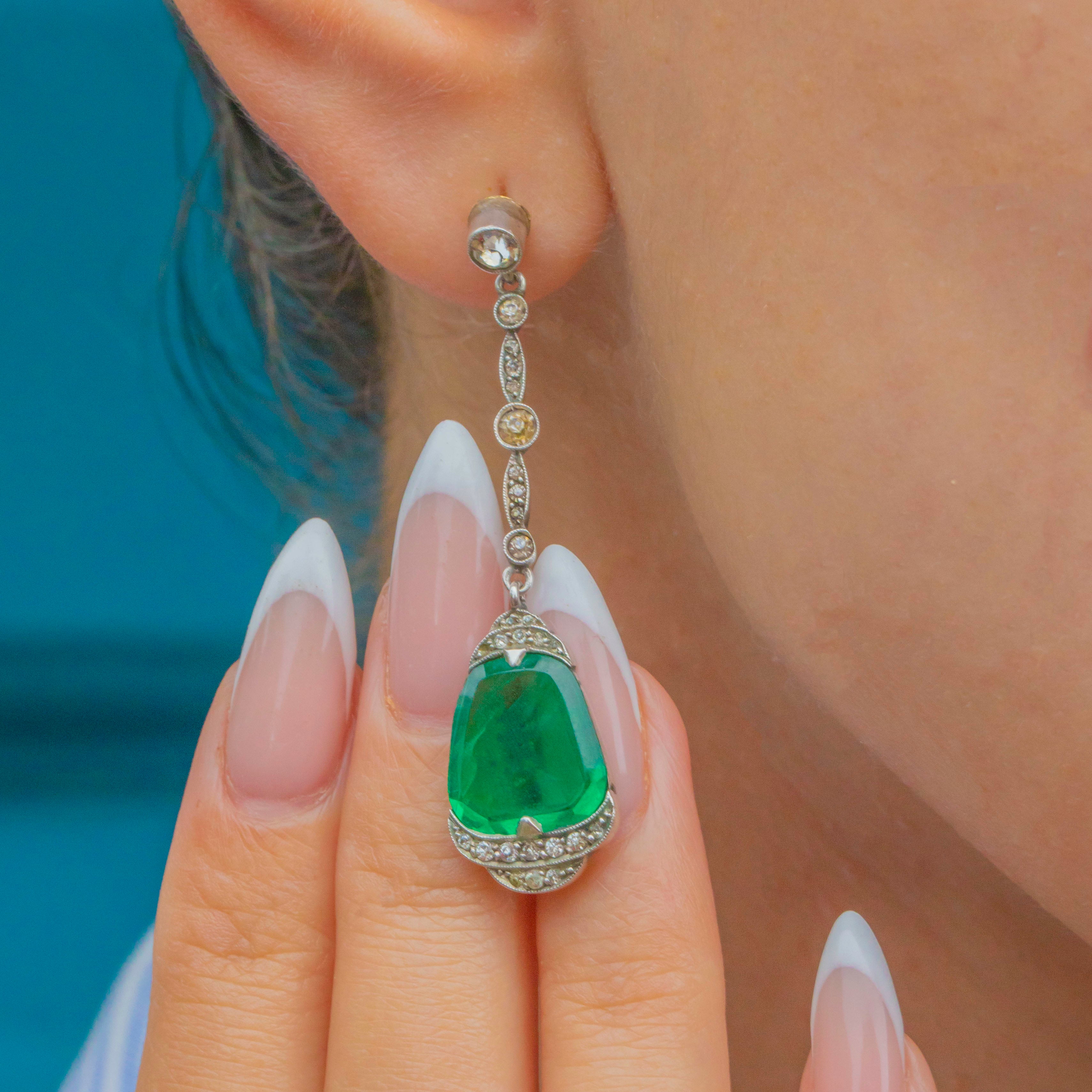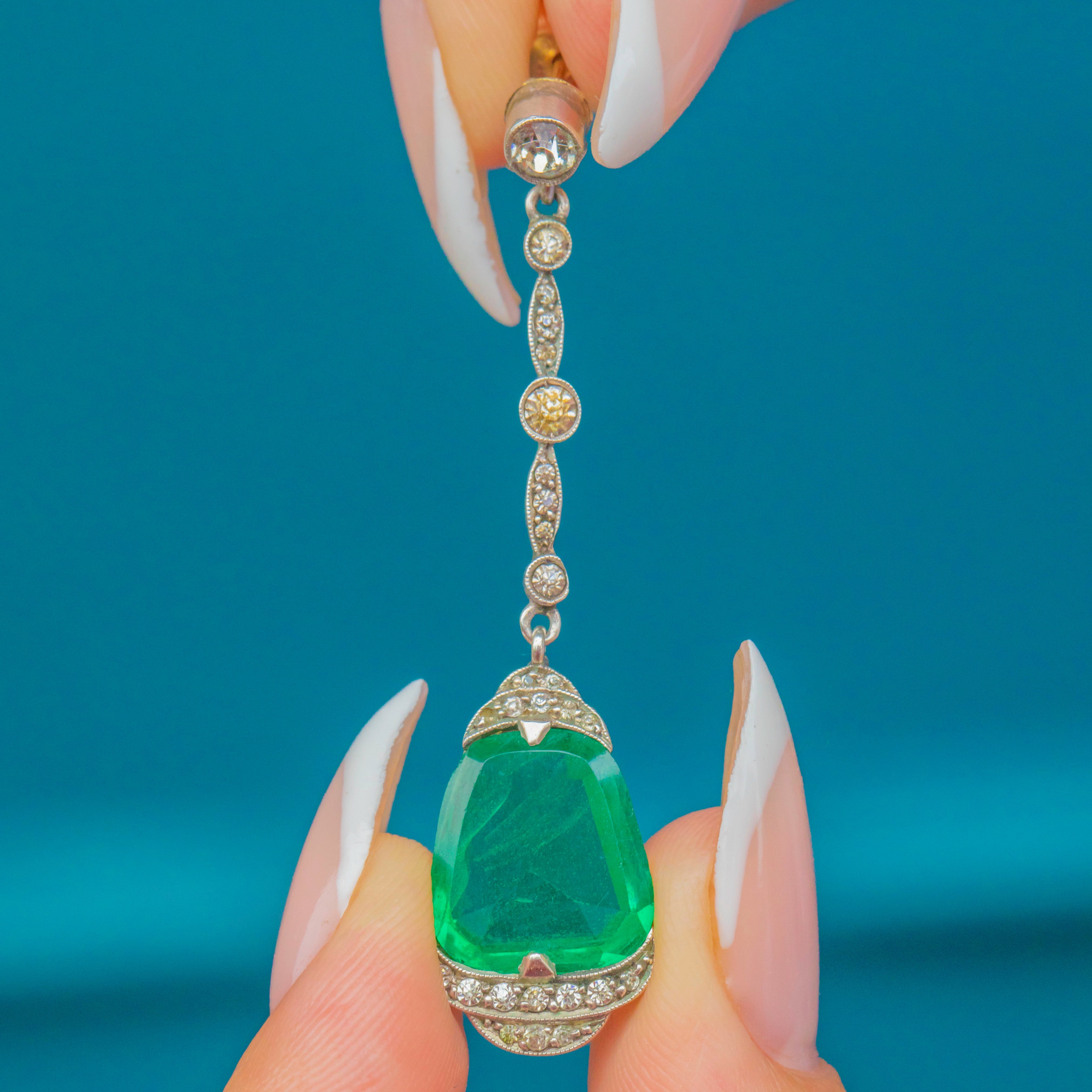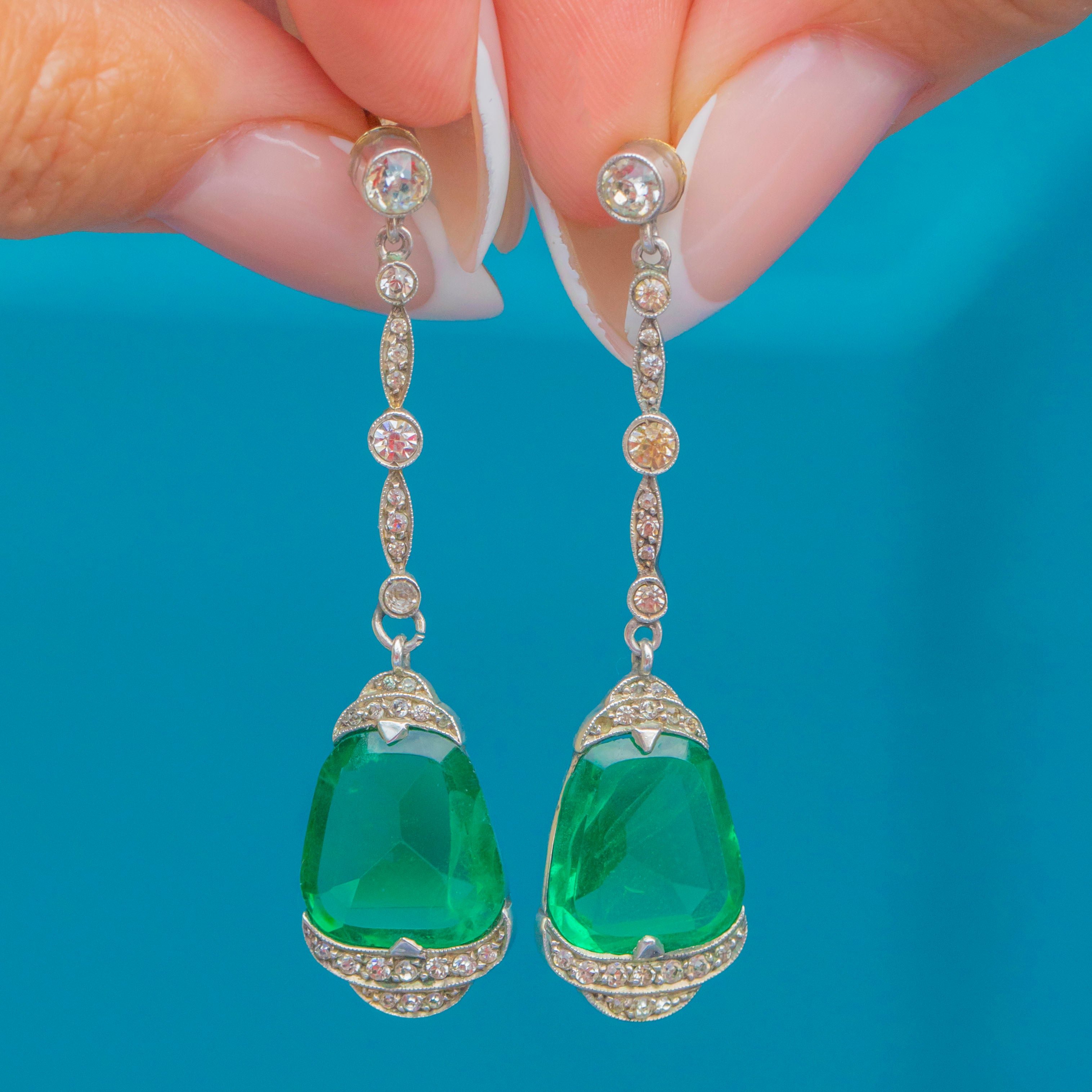 The vivid green Paste stones are enhanced by white Paste accents that graduate from 1mm to 3.5mm, offering subtle sparkle and contrast. Elegant and eye-catching, these earrings are a true Deco statement.