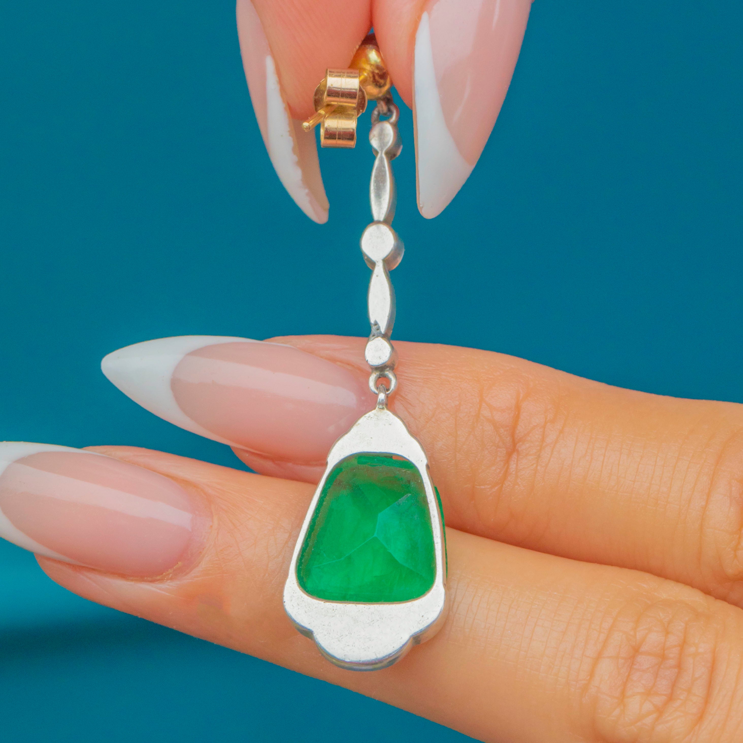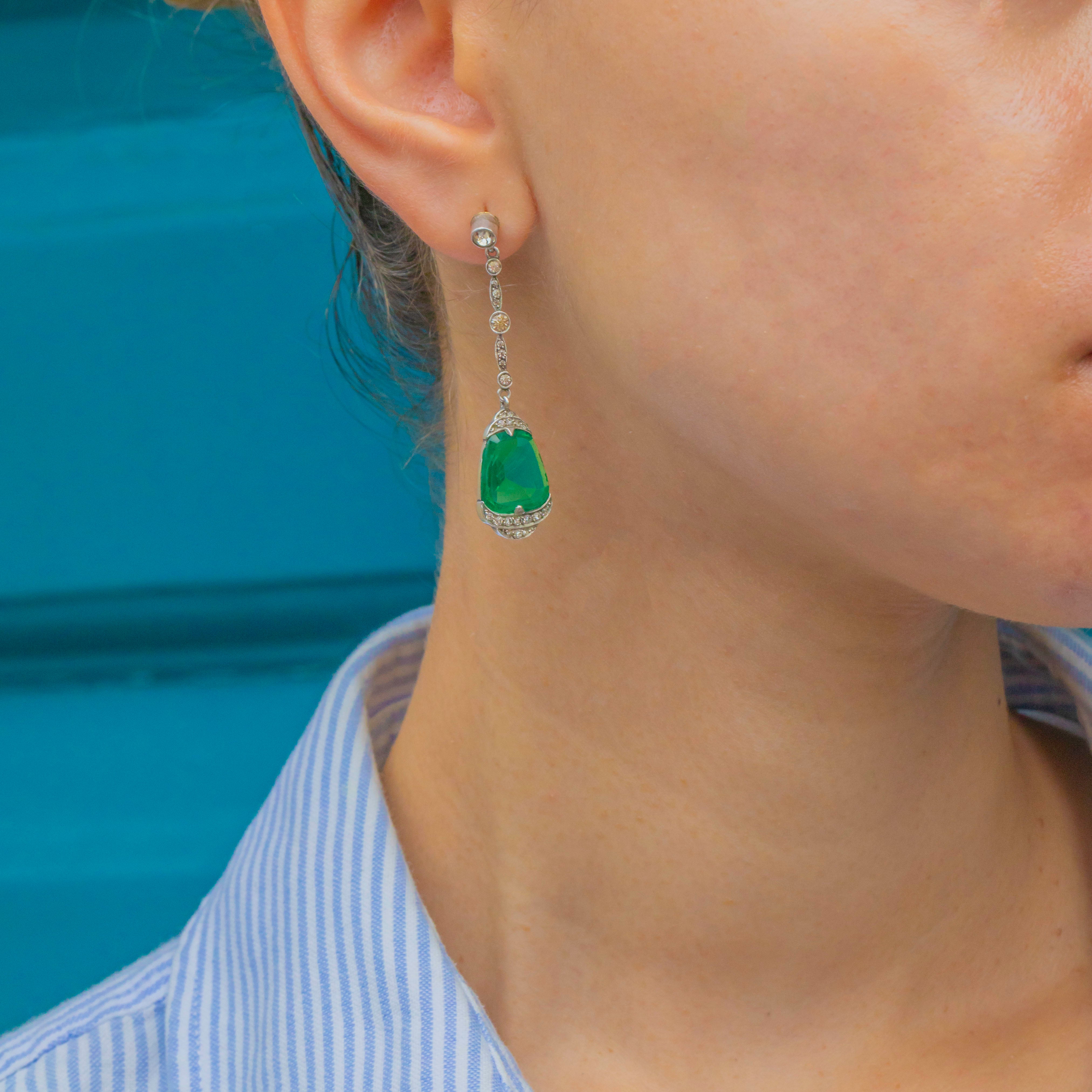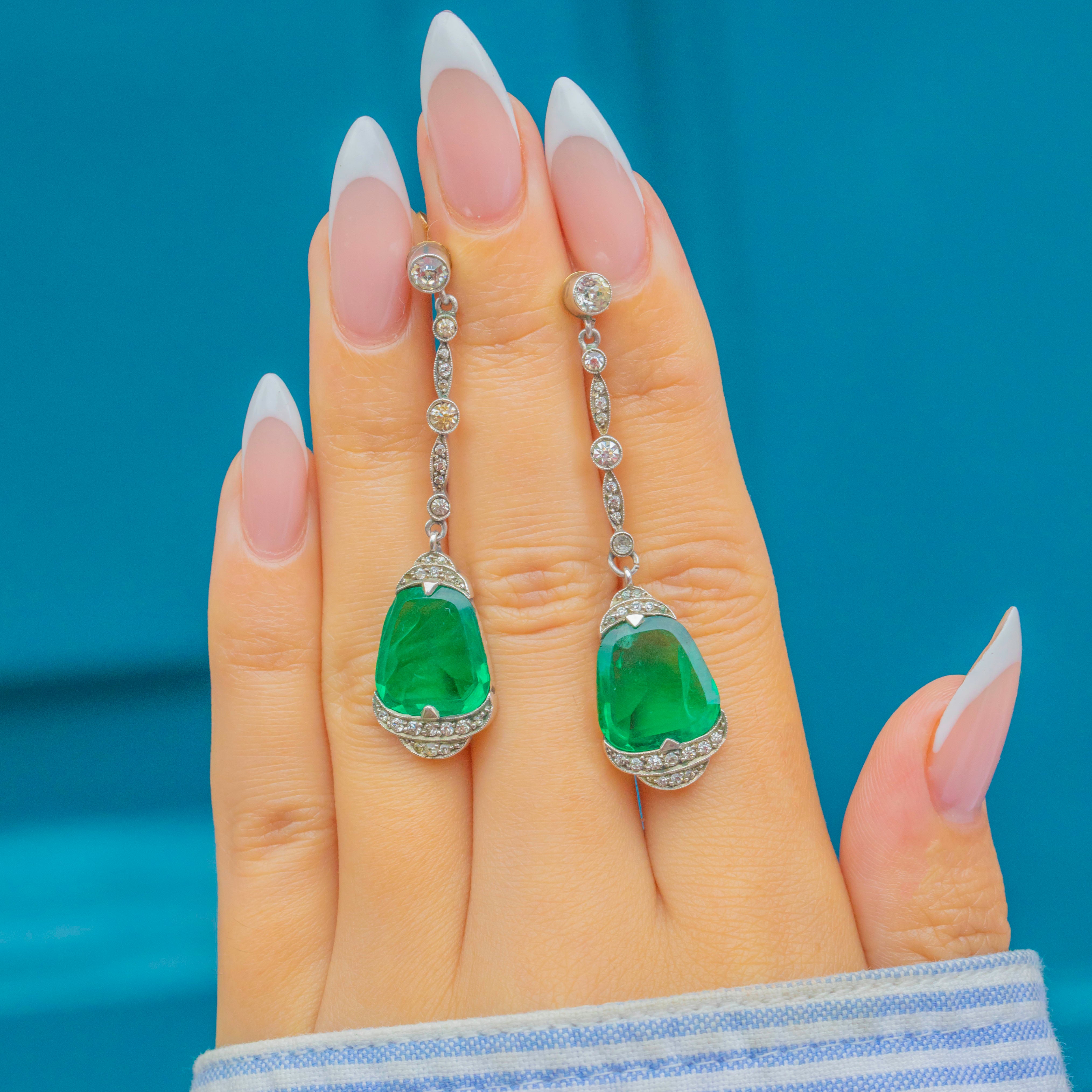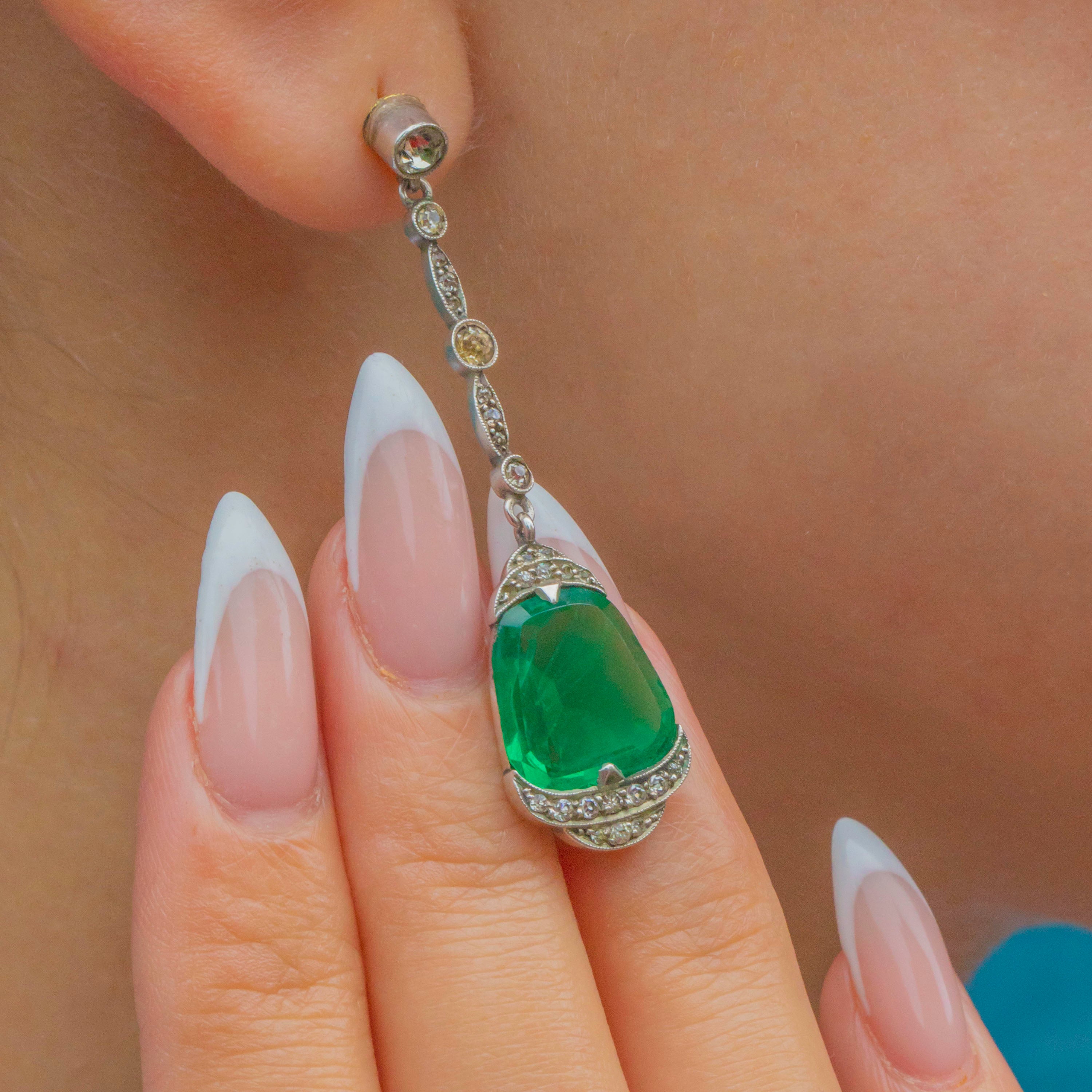 The vivid green Paste stones are enhanced by white Paste accents that graduate from 1mm to 3.5mm, offering subtle sparkle and contrast. Elegant and eye-catching, these earrings are a true Deco statement.